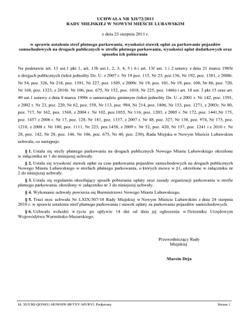 UCHWAŁA NR XII/72/2011 RADY MIEJSKIEJ W NOWYM MIEŚCIE LUBAWSKIM z dnia 23 sierpnia 2011 r. w sprawie ustalenia stref płatnego parkowania, wysokości stawek opłat za parkowanie pojazdów samochodowych na drogach publicznych w strefie płatnego parkowania, wysokości opłat dodatkowych oraz sposobu ich pobierania Na podstawie art. 13 ust.1 pkt 1, art. 13b ust.1, 2, 3, 4, 5 i 6 i art. 13f ust. 1 i 2 ustawy z dnia 21 marca 1985r o drogach publicznych (tekst jednolity Dz. U. z 2007 r. Nr 19 poz. 115, Nr 23, poz.136, Nr 192, poz. 1381, z 2008r. Nr 54, poz. 326, Nr 218, poz. 1391, Nr 227, poz. 1505, z 2009r. Nr 19, poz. 101, Nr 19, poz. 100, Nr 86, poz. 720, Nr 168, poz. 1323, z 2010r. Nr 106, poz. 675, Nr 152, poz. 1018, Nr 225, poz. 1466) i art. 18 ust. 2 pkt 15 oraz art. 40 ust.1 ustawy z dnia 8 marca 1990r o samorządzie gminnym (tekst jednolity Dz. U. z 2001 r. Nr 142, poz. 1591, z 2002 r. Nr 23, poz. 220, Nr 62, poz. 558, Nr 113, poz. 984, Nr 214, poz. 1806, Nr 153, poz. 1271, z 2003r. Nr 80, poz. 717, Nr 162, poz. 1568, z 2004 r. Nr 102, poz.1055, Nr 116, poz. 1203, z 2005 r. Nr 172, poz. 1441,Nr 175, poz. 1457 z 2006 r. Nr 17, poz. 128, Nr 181, poz. 1337, z 2007 r. Nr 48, poz. 327, Nr 138, poz. 974, Nr 173, poz. 1218, z 2008 r. Nr 180, poz. 1111, Nr 223, poz.1458, z 2009 r. Nr 52, poz. 420, Nr 157, poz. 1241 i z 2010 r. Nr 28, poz. 142, Nr 28, poz. 146, Nr 106, poz. 675, Nr 40, poz. 230), Rada Miejska w Nowym Mieście Lubawskim uchwala, co następuje: § 1. Ustala się strefy płatnego parkowania na drogach publicznych Nowego Miasta Lubawskiego określone w załączniku nr 1 do niniejszej uchwały. § 2. Ustala się wysokość stawek opłat za czas parkowania pojazdów samochodowych na drogach publicznych Nowego Miasta Lubawskiego w strefach płatnego parkowania, o których mowa w §1, określone w załączniku nr 2 do niniejszej uchwały. § 3. Ustala się regulamin określający sposób pobierania opłaty oraz zasady organizacji parkowania w strefie płatnego parkowania, określony w załączniku nr 3 do niniejszej uchwały. § 4. Wykonanie uchwały powierza się Burmistrzowi Nowego Miasta Lubawskiego. § 5. Traci moc uchwała Nr LXIX/307/10 Rady Miejskiej w Nowym Mieście Lubawskim z dnia 24 sierpnia 2010 r. w sprawie ustalenia stref płatnego parkowania i stawek opłaty za parkowanie pojazdów samochodowych. § 6. Uchwała wchodzi w życie po upływie 14 dni od dnia jej ogłoszenia w Dzienniku Urzędowym Województwa WarmińskoMazurskiego. Przewodniczący Rady Miejskiej Marcin Deja Id: XUUBJQONEUHOWHWBFTXYMVRVI. Podpisany Strona 1 Załącznik Nr 1 do Uchwały Nr XII/72/2011 Rady Miejskiej w Nowym Mieście Lubawskim z dnia 23 sierpnia 2011 r. STREFY PŁATNEGO PARKOWANIA NA DROGACH PUBLICZNYCH NOWEGO MIASTA LUBAWSKIEGO Lp. 1 2 3 4 5 6 7 8 Lokalizacja obszaru ul. 7 Grudnia ul. Waryńskiego ul. Rynek ul. Norwida ul. Daszyńskiego ul. 19 Stycznia ul. 3 Maja ul. Okólna Id: XUUBJQONEUHOWHWBFTXYMVRVI. Podpisany Opis szczegółowy od ul. Rynek do ul. Okólnej od ul. Rynek do ul. Norwida od ul. 3 Maja do ul. Waryńskiego od ul. 3 Maja do ul. Okólnej od ul. Rynek do ul. Bocznej od ul. Rynek do ul. Okólnej od ul. 3 Maja do ul. Wąskiej Strona 1 Załącznik Nr 2 do Uchwały Nr XII/72/2011 Rady Miejskiej w Nowym Mieście Lubawskim z dnia 23 sierpnia 2011 r. WYSOKOŚĆ STAWEK OPŁAT ZA CZAS PARKOWANIA POJAZDÓW SAMOCHODOWYCH W STREFACH PŁATNEGO PARKOWANIA 1. OPŁATY JEDNORAZOWE 1.1 za 40 minut postoju za 1 godzinę postoju za 2 godziny postoju za 3 godziny postoju za każdą następną godzinę postoju 1,00 zł 1,50 zł 3,10 zł 4,80 zł 1,50 zł 2. 2.1 2.2 3 4 OPŁATY ABONAMENTOWE stawka miesięczna z wyłączeniem pkt 2.2 stawka miesięczna dla osób zameldowanych przy odcinkach ulic objętych SPP OPŁATA ZRYCZAŁTOWANA ZA ZASTRZEŻONE STANOWISKO POSTOJOWE (KOPERTĘ) OPŁATA DODATKOWA 50 zł 20 zł 180 zł 30 zł Id: XUUBJQONEUHOWHWBFTXYMVRVI. Podpisany Strona 1 Załącznik Nr 3 do Uchwały Nr XII/72/2011 Rady Miejskiej w Nowym Mieście Lubawskim z dnia 23 sierpnia 2011 r. REGULAMIN OKREŚLAJĄCY SPOSÓB POBIERANIA OPŁATY ORAZ ZASADY ORGANIZACJI PARKOWANIA W STREFIE PŁATNEGO PARKOWANIA § 1. Regulamin niniejszy określa zasady organizacji parkowania w Strefie Płatnego Parkowania w Nowym Mieście Lubawskim, sposób pobierania opłat i określenia wysokości opłaty dodatkowej. § 2. Użyte w regulaminie określenia oraz skróty oznaczają: 1) SPP Strefa Płatnego Parkowania, 2) bilet parkingowy – wydruk z automatu parkingowego, 3) abonament – dokument potwierdzający wniesienie opłaty abonamentowej za parkowanie w SPP w okresie miesięcznym, uprawniający do parkowania w SPP bez wnoszenia opłaty jednorazowej, 4) koperta zastrzeżone stanowisko postojowe wyznaczone w celu korzystania z niego całodobowo na prawach wyłączności przez osobę, która wniosła z tego tytułu opłatę, 5) kontroler SPP – pracownik upoważniony do kontroli wnoszenia opłat za parkowanie w SPP, 6) wezwanie – dokument wystawiany przez kontrolera SPP w czasie dokonywania przez niego kontroli, stwierdzający nie wniesienie opłaty za parkowanie lub przekroczenie opłaconego czasu parkowania, 7) automat parkingowy (parkomat) – urządzenie inkasujące, wydające za opłatą wniesioną przy użyciu monet bilety parkingowe, 8) karta parkingowa – dokument wydany przez starostę osobie niepełnosprawnej na podstawie art. 8 ustawy z dnia 20 czerwca 1997 r. Prawo o ruchu drogowym (t.j. Dz.U. z 2005 r. Nr 108, poz. 908 ze zm.). Rozdział 1. PRZEPISY OGÓLNE § 3. 1. Za parkowanie pojazdów samochodowych w SPP pobiera się opłaty w wysokości określonej w załączniku nr 2 do niniejszej uchwały. 2. Opłaty, o których mowa w ust. 1, pobiera się w dni robocze od poniedziałku do piątku w godzinach od 9.00 do 17.00 oraz w soboty od 9.00 do 13.00. § 4. W SPP stosuje się następujące opłaty za parkowanie: 1) jednorazowa – uiszczana niezwłocznie po zaparkowaniu pojazdu, poprzez wykupienie biletu park