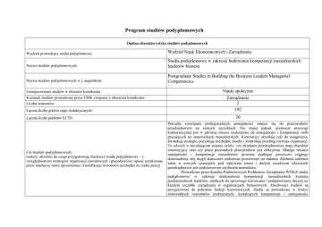 Program studiów podyplomowych Ogólna charakterystyka studiów podyplomowych Wydział prowadzący studia podyplomowe: Wydział Nauk Ekonomicznych i Zarządzania Nazwa studiów podyplomowych: Studia podyplomowe w zakresie budowania kompetencji menedżerskich leaderów biznesu Nazwa studiów podyplomowych w j. angielskim: Postgraduate Studies in Building the Business Leaders Managerial Competencies Umiejscowienie studiów w obszarze kształcenia: Kierunek studiów prowadzony przez UMK związany z obszarem kształcenia: Liczba semestrów: Łączna liczba godzin zajęć dydaktycznych: Łączna liczba punktów ECTS: Cel studiów podyplomowych: (należy: określić, do czego przygotowują słuchaczy studia podyplomowe – z uwzględnieniem wymogów organizacji zawodowych i pracodawców; opisać uzyskiwane przez słuchaczy nowe uprawnienia i kwalifikacje zawodowe niezbędne na rynku pracy) Nauki społeczne Zarządzanie 2 192 30 Potrzeba rozwijania profesjonalnych umiejętności odnosi się do pracowników przedsiębiorstw na różnych szczeblach. Nie mniej jednak uzyskanie przewagi konkurencyjnej jest w głównej mierze uzależnione od umiejętności i kompetencji osób pracujących na stanowiskach menedżerskich. Kierownicy określają cele do osiągnięcia, formułują strategie, pozyskują niezbędne zasoby i kontrolują przebieg rozwoju organizacji. To od nich w decydującym stopniu zależy czy działania przedsiębiorstwa mają charakter innowacyjny oraz czy praca pozostałych pracowników jest efektywna. Dlatego właśnie umiejętności i kompetencje menedżerów powinny podlegać procesowi ciągłego doskonalenia, aby mogli skutecznie realizować powierzone im zadania. Zdolność radzenia sobie w nowych sytuacjach, pod wpływem stresu i dużych oczekiwań właścicieli przedsiębiorstw jest podstawowym atrybutem menedżera. Prowadzone przez Katedrę Podstawowych Problemów Zarządzania WNEiZ studia podyplomowe w zakresie doskonalenia kompetencji menedżerskich kształcą profesjonalnych leaderów, zdolnych do sprawnego kierowania i podejmowania decyzji na każdym szczeblu zarządzania w organizacjach biznesowych. Absolwenci studiów są przygotowani do pełnienia funkcji kierowniczych. Studia są prowadzone w formie różnorodnych warsztatów praktycznych, kształcących kompetencje i umiejętności Wskazanie związku programu studiów podyplomowych z misją i strategią Wydziału: Wskazanie, czy w procesie określania efektów kształcenia i rozwiązań programowych uwzględniono opinie interesariuszy zewnętrznych i wewnętrznych: zapewniające rozwój kariery zawodowej w środowisku przedsiębiorczości i pozwalają absolwentom dostosować się do zmieniającego, turbulentnego środowiska (otoczenia) i wyzwań globalnej gospodarki. Umiejętności i kompetencje uzyskane w trakcie studiów umożliwiają absolwentom wykorzystywać różnorodne instrumenty zarządzania w sposób elastyczny. Absolwenci są przygotowani do zarządzania współczesną organizacją, tak aby była skuteczna i efektywna w osiąganiu założonych celów. Absolwenci nabywają umiejętności podejmowania decyzji integrujących wszystkie sfery funkcjonalne i zasoby organizacji. Potrafią sprawnie kierować zespołami ludzkimi. Dzięki pozyskanym w trakcie studiów umiejętnościom wpływania na ludzi, znajomościom technik prowadzenia negocjacji i kierowania konfliktami, komunikacji i twórczego rozwiązywania problemów są przygotowani do zarządzania w turbulentnym otoczeniu, wymagającym wprowadzaniu w instytucjach częstych, innowacyjnych zmian. Ważną umiejętnością jest przygotowanie do opracowania, wdrażania i kontroli programów operacyjnych i strategii rozwoju organizacji. Cele szczegółowe studiów: 1. Rozwój ogólnych umiejętności kierowniczych, 2. Zwiększanie kompetencji praktycznego zarządzania zespołem, 3. Nabycie umiejętności formułowania strategii, 4. Podniesienie umiejętności obrony przed stresem oraz kontrolowania emocji. Misja: kształcimy bazując na najnowszych osiągnięciach teorii i rozwiązaniach praktycznych, uwzględniając potrzeby zarówno regionalnej, jak i globalnej gospodarki. Strategia: Wykreowanie wizerunku uczelni bliskiej praktyce gospodarczej Studia prowadzone będą na podstawie umowy z globalną firmą konsultingową Ersnt&Young. Program studiów był opracowany i uzgodniony z partnerem. Efekty kształcenia dla studiów podyplomowych* Symbol Po ukończeniu studiów podyplomowych absolwent osiąga następujące efekty kształcenia: wiedza EK_W01 EK_W02 posiada wiedzę umożliwiającą zrozumienie istoty, mechanizmów i uwarunkowań funkcjonowania współczesnych instytucji, procesów zachodzących we współczesnych instytucjach i w ich otoczeniu; posiada wiedzę umożliwiającą zrozumienie relacji wewnętrznych i zewnętrznych instytucji z podmiotami w globalizującym się otoczeniu oraz wzajemnych powiązań procesów zarządzania i wdrażania zmian w instytucji EK_W03 EK_W04 EK_W05 EK_W06 EK_W07 zna, rozumie i rozpatruje z punktu widzenia właściwego dla nauk o zarządzaniu procesy zarządzania i wdrażania zmian w zakresie budowania pozytywnego potencjału organizacji dotyczące jej poszczególnych zasobów i sfer funkcjonowania, jak i organizacji jako całości zna, rozumie i rozpatruje z punktu widzenia właściwego dla nauk o zarządzaniu zasady i metody racjonalizacji decyzji, w tym szczególnie dotyczących decyzji strategicznych przedsiębiorstwa zna, rozumie i rozpatruje z punktu widzenia właściwego dla nauk o zarządzaniu procesy zarządzania wartością firmy, wzajemne zależności i długofalowe konsekwencje procesów zarządzania wartością firmy zna, rozumie i rozpatruje procesy zarządzania i wdrażania zmian w zakresie budowania wartości firmy dotyczące poszczególnych zasobów i sfer funkcjonowania przedsiębiorstwa, jak i przedsiębiorstwa jako całości zna, rozumie istotę i mechanizmów kreowania wartości firmy; rozumie zasady, p
