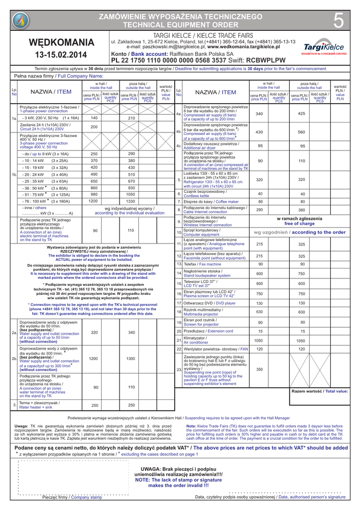 5 ZAMÓWIENIE WYPOSA¯ENIA TECHNICZNEGO TECHNICAL EQUIPMENT ORDER TARGI KIELCE / KIELCE TRADE FAIRS WÊDKOMANIA ul. Zak³adowa 1, 25-672 Kielce, Poland, tel.(+4841) 365-12-64, fax (+4841) 365-13-13 e-mail: [email protected], www.wedkomania.targikielce.pl 13-15.02.2014 Konto / Bank account: Raiffeisen Bank Polska SA PL 22 1750 1110 0000 0000 0568 3537 Swift: RCBWPLPW Termin zg³oszenia up³ywa w 30 dniu przed terminem rozpoczêcia targów / Deadline for submitting applications is 30 days prior to the fair’s commencement Pe³na nazwa firmy / Full Company Name: Lp. No. w hali / inside the hall NAZWA / ITEM poza hal¹ / outside the hall cena PLN / iloœæ sztuk cena PLN / iloœæ sztuk price PLN quantity price PLN quantity PCS PCS wartoœæ PLN / value PLN Przy³¹cze elektryczne 1-fazowe / 1-phase power connection 1a. - 3 kW, 230 V, 50 Hz (1 x 16A) Zasilanie 24 h (1x10A) 230V / Circuit 24 h (1x10A) 230V 140 210 200 Przy³¹cze elektryczne 3-fazowe 400 V, 50 Hz / 3-phase power connection voltage 400 V, 50 Hz 1b. - do / up to 9 kW (3 x 16A) 250 290 - 10 : 14 kW (3 x 25A) 370 380 - 15 : 19 kW (3 x 32A) 420 430 - 20 : 24 kW (3 x 40A) 490 510 - 25 : 35 kW (3 x 63A) 650 670 - 36 : 50 kW * (3 x 80A) 860 930 - 51 : 75 kW * (3 x 125A) 980 1050 - 76 : 100 kW * (3 x 160A) 1200 1330 - inne / others ................ kW (3 x ............ A) Pod³¹czenie przez TK jednego przy³¹cza elektrycznego do urz¹dzenia na stoisku / A connection of an (one) electric terminal of machines on the stand by TK wg indywidualnej wyceny / according to the individual evaluation Lp. No. 110 Doprowadzenie sprê¿onego powietrza 4b. 6 bar dla wydatku do 600 l/min */ Compressed air supply (6 bars) of a capacity of up to 600 l/min* Dodatkowy osuszacz powietrza / 4c. Additional air dryer Pod³¹czenie przez TK jednego przy³¹cza sprê¿onego powietrza do urz¹dzenia na stoisku / A connection of an (one) compressed air terminal of machines on the stand by TK Lodówka 130l - 55 x 60 x 85 cm z zasilaniem 24h (1x10A) 230V / 5. Refrigerator 130l - 55 x 60 x 85 cm with circuit 24h (1x10A) 230V Czajnik bezprzewodowy / 6. Cordless kettle 7. Ekspres do kawy / Coffee maker 8. 10. 11. Wystawca zobowi¹zany jest do podania w zamówieniu RZECZYWISTEJ mocy zainstalowanej / The exhibitor is obliged to declare in the booking the ACTUAL power of equipment to be installed. Do niniejszego zamówienia nale¿y do³¹czyæ rysunki stoiska z zaznaczonymi punktami, do których maj¹ byæ doprowadzone zamawiane przy³¹cza / It is necessary to supplement this order with a drawing of the stand with marked points where the ordered connecions shall be provided. * Pod³¹czenie wymaga wczeœniejszych ustaleñ z zespo³em technicznym TK - tel. (41) 365 12 76, 365 13 18 przeprowadzonych nie póŸniej ni¿ 30 dni przed rozpoczêciem targów. W przypadku braku w/w ustaleñ TK nie gwarantuj¹ wykonania pod³¹czeñ. * Connection requires to be agreed upon with the TK’s technical personnel (phone +4841 365 12 76, 365 13 18), and not later than 30 days prior to the fair. TK doesn’t guarantee making connections ordered after this date. Doprowadzenie wody z odp³ywem dla wydatku do 50 l/min. (bez pod³¹czenia) / 2a. Water supply and outlet connection of a capacity of up to 50 l/min (without connection) Doprowadzenie wody z odp³ywem dla wydatku do 300 l/min. * 2b. (bez pod³¹czenia) / Water supply and outlet connection of a capacityof up to 300 l/min* (without connection) Pod³¹czenie przez TK jednego przy³¹cza wodnego do urz¹dzenia na stoisku / A connection of an (one) water terminal of machines on the stand by TK 3. Terma + zlewozmywak / Water heater + sink 220 340 NAZWA / ITEM Doprowadzenie sprê¿onego powietrza 6 bar dla wydatku do 200 l/min / 4a. Compressed air supply (6 bars) of a capacity of up to 200 l/min 9. 90 w hali / inside the hall Pod³¹czenie do Internetu kablowego / Cable Internet connection Pod³¹czenie do Internetu bezprzewodowego / Wireless Internet connection Sprzêt komputerowy / Computer equipment £¹cze analogowe telefoniczne (z aparatem) / Analogue telephone point (with equipment) £¹cze telefaksowe (bez aparatu) / Facsimile point (without equipment) 90 1300 110 cena PLN / iloœæ sztuk / cena PLN / iloœæ sztuk / quantity quantity price PLN price PLN PCS PCS 340 425 430 560 95 95 90 110 320 320 40 40 80 80 290 380 wg uzgodnieñ / according to the order 325 215 325 90 90 Nag³oœnienie stoiska / 14. Stand loudspeaker system 600 750 Telewizor LCD 37’’ / 15. LCD TV set 37” 600 600 Ekran plazmowy lub LCD 42” / 16. Plasma screen or LCD TV 42” 750 750 17. Odtwarzacz DVD / DVD player 130 130 Rzutnik multimedialny / 18. Multimedia projector 12. 13. Telefax / Fax machine wartoœæ PLN / value PLN w ramach zg³oszenia free of charge 215 630 630 Ekran pod rzutnik / 19. Screen for projector 90 90 20. Przed³u¿acz / Extension cord 15 15 Klimatyzator / 21. Air conditioner 1200 poza hal¹ / outside the hall 1050 1050 22. Wentylator powietrza- obrotowy / FAN 120 120 Zawieszenie jednego punktu (linka) do kratownicy hali E lub F o udŸwigu do 50 kg bez podwieszenia elementu wystawcy / 23. Suspending one point (rope) of hoisting capacity up to 50 kg to the pavilion E or F truss without suspending exhibitor’s element 350 Razem wartoœæ / Total value: 250 250 Podwieszenie wymaga wczeœniejszych ustaleñ z Kierownikiem Hali / Suspending requires to be agreed upon with the Hall Manager Uwaga: TK nie gwarantuj¹ wykonania zamówieñ z³o¿onych póŸniej ni¿ 3. dnia przed rozpoczêciem targów. Zamówienia te realizowane bêd¹ w miarê mo¿liwoœci, nale¿noœæ za ich wykonanie jest wy¿sza o 30% i p³atna w momencie z³o¿enia zamówienia gotówk¹ lub kart¹ p³atnicz¹ w kasie TK. Zap³ata jest warunkiem niezbêdnym do realizacji zamówienia. Note: Kielce Trade Fairs (TK) does not guarantee to fulfill orders made 3 daysor less before the commencement of the fair. Such orders will be executedin so far as this is possible. The 