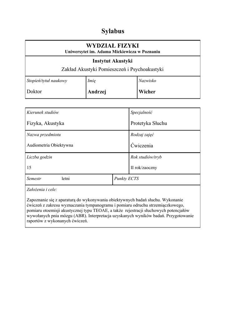 Sylabus WYDZIAŁ FIZYKI Uniwersytet im. Adama Mickiewicza w Poznaniu Instytut Akustyki Zakład Akustyki Pomieszczeń i Psychoakustyki Stopień/tytuł naukowy Imię Nazwisko Doktor Andrzej Wicher Kierunek studiów Specjalność Fizyka, Akustyka Protetyka Słuchu Nazwa przedmiotu Rodzaj zajęć Audiometria Obiektywna Ćwiczenia Liczba godzin Rok studiów/tryb 15 II rok/zaoczny Semestr letni Punkty ECTS Założenia i cele: Zapoznanie się z aparaturą do wykonywania obiektywnych badań słuchu. Wykonanie ćwiczeń z zakresu wyznaczania tympanogramu i pomiaru odruchu strzemiączkowego, pomiaru otoemisji akustycznej typu TEOAE, a także rejestracji słuchowych potencjałów wywołanych pnia mózgu (ABR). Interpretacja uzyskanych wyników badań. Przygotowanie raportów z wykonanych ćwiczeń. Tematyka zajęć (słowa kluczowe)/ Odsetek czasu zajęć Plan ćwiczeń: Ćwiczenie nr 1 (20%) Metodyka badań i aparatura stosowana w obiektywnych badaniach słuchu Cele i zadania: a) przedstawić najistotniejsze różnice pomiędzy subiektywnymi a obiektywnymi metodami badania słuchu, b) określić wskazania do wykonania obiektywnego badania słuchu, c) przedstawić metody badań oraz sposoby analizy wyników, d) zapoznać się ogólnie z aparaturą dostępną na pracowni. Ćwiczenie nr 2 (25%) Zastosowanie audiometrii impedancyjnej w diagnozowaniu stanu ucha środkowego Cele i zadania: a) zapoznać się z podstawowymi pojęciami stosowanymi w audiometrii impedancyjnej: tympanogram, podatność, impedancja, stymulacja ipsi- oraz kontralateralna, odruch strzemiączkowy, b) zapoznać się z budową i obsługą aparatury (tympanometr TYMP 4000M), c) wyznaczyć tympanogramy dla ucha prawego i lewego osoby badanej, d) dokonać porównania wyznaczonych tympanogramów, e) przeprowadzić test drożności trąbki słuchowej (test Williamsa), f) w warunkach stymulacji ipsi- oraz kontralateralnej wyznaczyć wartości progowe odruchu strzemiączkowego w zakresie częstotliwości 0,5 – 4 kHz dla ucha prawego i lewego, g) przeprowadzić analizę wyników badań i sformułować wnioski. Ćwiczenie nr 3 (25%) Ocena funkcjonowania ślimaka ucha wewnętrznego w oparciu o wyniki badań otoemisji akustycznej Cele i zadania: a) przypomnienie podstawowych wiadomości z zakresu funkcjonowania ślimaka ucha wewnętrznego i zjawiska otoemisji akustycznej (budowa i funkcjonowanie ślimaka, pojęcie nieliniowości układu, rodzaje otoemisji akustycznej), b) zapoznać się z budową, funkcjami oraz wyposażeniem dodatkowym urządzenia o nazwie „Kuba” (klawisze funkcyjne, sonda do badań, przedwzmacniacz), c) dokonać rejestracji i analizy otoemisji TEOAE dla ucha prawego i lewego osoby badanej (uwzględnić odpowiednie parametry badania – tryb akwizycji, intensywność bodźca, ilość uśrednień). d) podczas analizy wyników badań zarejestrować widmo sygnału otoemisji, oraz wartości współczynników korelacji wzajemnej obliczone w pasmach częstotliwości) e) wydrukować wszystkie uzyskane wyniki badań, f) przeprowadzić dyskusję wyników badań i sformułować wnioski. Ćwiczenie nr 4 (30%) Audiometria odpowiedzi elektrycznych – rejestracja i analiza słuchowych potencjałów wywołanych pnia mózgu (ABR) Cele i zadania: a) zapoznać się z podstawowymi pojęciami dotyczącymi potencjałów wywołanych oraz metodami ich rejestracji i analizy (mechanizm generacji słuchowych potencjałów wywołanych, podział słuchowych potencjałów wywołanych, latencja, elektrody, przedwzmacniacz, techniki uśredniania), b) dokonać rejestracji potencjałów stosując opcję „latencje”, oznaczyć fale I, III i V c) zarejestrować szereg natężeniowy stosując opcję „progi”, d) pomiary opisane w punktach b i c wykonać dla ucha prawego i lewego, e) wydrukować wszystkie wyniki badań, f) przeprowadzić dyskusję wyników, przedstawić wnioski. Sposoby oceny pracy studenta ocena ciągła (bieżące przygotowanie do zajęć i aktywność) Udział w ocenie końcowej 20 % śródsemestralne kolokwia pisemne/ustne końcowe zaliczenie pisemne/ustne 20 % egzamin pisemny egzamin ustny kontrola obecności 10 % Praca końcowa semestralna/roczna inne: protokół 50 % Literatura obowiązkowa 1. A. Pruszewicz, Audiologia Kliniczna- Zarys, Wydawnictwo Akademii Medycznej im. Karola Marcinkowskiego, 2003r. 2. E. Ozimek, Dźwięk i jego percepcja. Aspekty fizyczne i psychoakustyczne, Wydawnictwo Naukowe PWN, 2002r. 3. Opis wykonywanych ćwiczeń – opracowanie dostępne na pracowni. Literatura dodatkowa