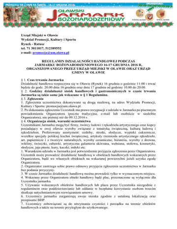 Urząd Miejski w Oławie Wydział Promocji, Kultury i Sportu Rynek - Ratusz tel. 71 3011017, 512389552 e-mail: [email protected] REGULAMIN DZIAŁALNOŚCI HANDLOWEJ PODCZAS JARMARKU BOŻONARODZENIOWEGO 16-17 GRUDNIA 2016 R, ORGANIZOWANEGO PRZEZ URZĄD MIEJSKI W OŁAWIE ORAZ URZĄD GMINY W OŁAWIE § 1. Czas trwania Jarmarku Działalność handlowa rozpoczyna się w Oławie (Rynek) 16 grudnia o godzinie 11:00 i trwać będzie do godz. 20.00 dnia 16 grudnia oraz dnia 17 grudnia od godziny 10.00 do 20.00. § 2. Godziny działalności stoisk handlowych i gastronomicznych w czasie trwania Jarmarku są takie same jak wskazane w § 1 Regulaminu. § 3. Zgłoszenia 1. Zgłoszenia uczestnictwa dokonywane są drogą mailową, na adres Wydziału Promocji, Kultury i Sportu: [email protected]. 2. Po dokonaniu zgłoszenia Uczestnik ma prawo rezygnacji z udziału w Jarmarku po pisemnym powiadomieniu Organizatora (poczta tradycyjna, e-mail lub osobiście w siedzibie Organizatora), nie później niż do 09.12.2016 r. § 4. Organizacja stoisk, warunki uczestnictwa Uczestnikami Jarmarku mogą być firmy, twórcy ludowi i rękodzieła artystycznego oraz kupcy posiadający w swej ofercie wyroby związane z tematyką świąteczną, kulturą ludową i rękodziełem. Preferowany asortyment: ozdoby, stroiki, słodycze, wypieki cukiernicze, wszelkie specjały polskiej kuchni świątecznej, artykuły rzemiosła artystycznego rękodzieło, art. papiernicze i z tworzyw naturalnych, wyroby ceramiczne, biżuteria, wyroby z drewna, wikliny, świeczki, zabawki, artystyczna galanteria skórzana, wełniana, stołowa, kosmetyki, słodycze, jaja ptasie, kury, kaczki, indyki etc. 1. Warunkiem udziału w Jarmarku jest potwierdzenie przyjęcia zgłoszenia przez Organizatora. Uczestnik może prowadzić działalność handlową w obiektach handlowych wskazanych przez Organizatora, bądź we własnych obiektach na wskazanej powierzchni jeżeli uzyska zgodę Organizatora. 2. Organizator zastrzega sobie prawo odmowy przyjęcia zgłoszenia uczestnictwa w Jarmarku bez podania przyczyny. 3. W czasie Jarmarku działalność handlową można prowadzić tylko w wyznaczonym miejscu. 4. Wskazany przez Organizatora obiekt handlowy bądź plac, przeznaczone są wyłącznie dla Uczestnika jarmarku. 5. Używanie wskazanych obiektów handlowych lub placu przez Uczestnika niezgodnie z regulaminem oraz poddzierżawianie lub oddanie w bezpłatne korzystanie osobom trzecim skutkuje natychmiastowym rozwiązaniem umowy. 6. Uczestnicy jarmarku zorganizują swoje stoiska zgodnie z ustaloną lokalizacją oraz przepisami BHP. 7. Uczestnicy zobowiązani są do utrzymania czystości i porządku na terenie obiektów handlowych a także na terenie przyległym do użytkowanego. 8. Organizatorowi służy uprawnienie wstępu do obiektu handlowego w obecności Uczestnika, w celu oceny przestrzegania wymogów określonych powyżej. 9. Obowiązuje zakaz wystawiania i reklamy towaru poza wyznaczonym miejscem, a także ingerencja w konstrukcję podnajętego domku handlowego, a w szczególności: wbijania gwoździ w elementy stoiska, wiercenia. 10. Każdy uczestnik wyposaża domek, stoisko w regały, półki we własnym zakresie. 11. Stoiska własne Uczestnika wymagają akceptacji Organizatora. 12. Wymagany jest estetyczny wygląd każdego stoiska. 13. Prowadzenie działalności gastronomicznej na przystosowanych do tego celu stoiskach może odbywać się tylko przy użyciu urządzeń elektrycznych oraz węglowych (elektryczne patelnie, rożna, grille, itp.). 14. Uczestnicy zobowiązani są do przestrzegania obowiązujących przepisów dotyczących oznaczenia placówki, wprowadzenia do obrotu handlowego towarów odpowiednio oznakowanych, posługiwania się narzędziami legalizowanymi, przestrzegania terminów przydatności do spożycia i trwałości towarów spożywczych przeznaczonych do sprzedaży. 15. Zabrania się sprzedaży produktów pirotechnicznych. 16. Uczestnik ma prawo do prowadzenia reklamy na powierzchni własnego stoiska w zakresie uzgodnionym z Organizatorem pod warunkiem, że nie zakłóca normalnego toku imprezy. Reklama poza stoiskiem wymaga pisemnej zgody organizatora i może być realizowana wyłącznie za jego pośrednictwem, w przeciwnym razie reklama taka podlega likwidacji na koszt uczestnika. 17. Uczestnik oświadcza, że działalność prowadzona przez niego na terenie Jarmarku nie będzie naruszać dobrych obyczajów, godności i uczuć religijnych. 18. Uczestnik zobowiązany jest do przestrzegania przepisów p. poż., sanitarnych, ochrony środowiska i BHP. 19. Po zakończeniu Jarmarku, bez dodatkowego wezwania, Uczestnik zobowiązuje się do: - niezwłocznego wydania Organizatorowi przedmiotu dzierżawy, - wydania go w stanie niepogorszonym, - przywrócenia stanu poprzedniego. § 5. Ubezpieczenia 1. Uczestnik ubezpiecza przedmiot działalności na własny koszt i ryzyko. 2. Organizator nie ponosi odpowiedzialności za uszkodzenia towarów przed, po i w trakcie trwania Jarmarku. 3. Organizator nie odpowiada za szkody spowodowane kradzieżą, ogniem, wichurą, opadem atmosferycznym, uderzeniem pioruna, eksplozją, zalaniem wodą, przerwą w dostawie prądu, wody i innymi przyczynami losowymi. 4. Uczestnik odpowiada za zaistniałe w wyniku jego działalności uszkodzenia i jest zobowiązany do pokrycia kosztów naprawy. § 6. Transport i zaopatrzenie 1. Do obowiązków Uczestników należy: – zorganizowanie dostawy i opuszczenie samochodami terenu Jarmarku najpóźniej do godziny 10:00 każdego dnia. – wjazd na teren imprezy możliwy jest od godziny: 16.12.2016 godz. 8:00, 17.12.2016 godz. 8:00 2. Niedostosowanie się do postanowień Regulaminu będzie karane przez przedstawicieli Policji lub Straży Miejskiej. 3. Likwidacja stoisk nie może odbywać się w trakcie imprez kulturalnych odbywających się w trakcie Jarmarku. 4. Całkowita likwidacja stoisk w ostatnim dniu Jarmarku tj. 17.12.2016 r. może odbywać się od godziny 16.00. § 7.