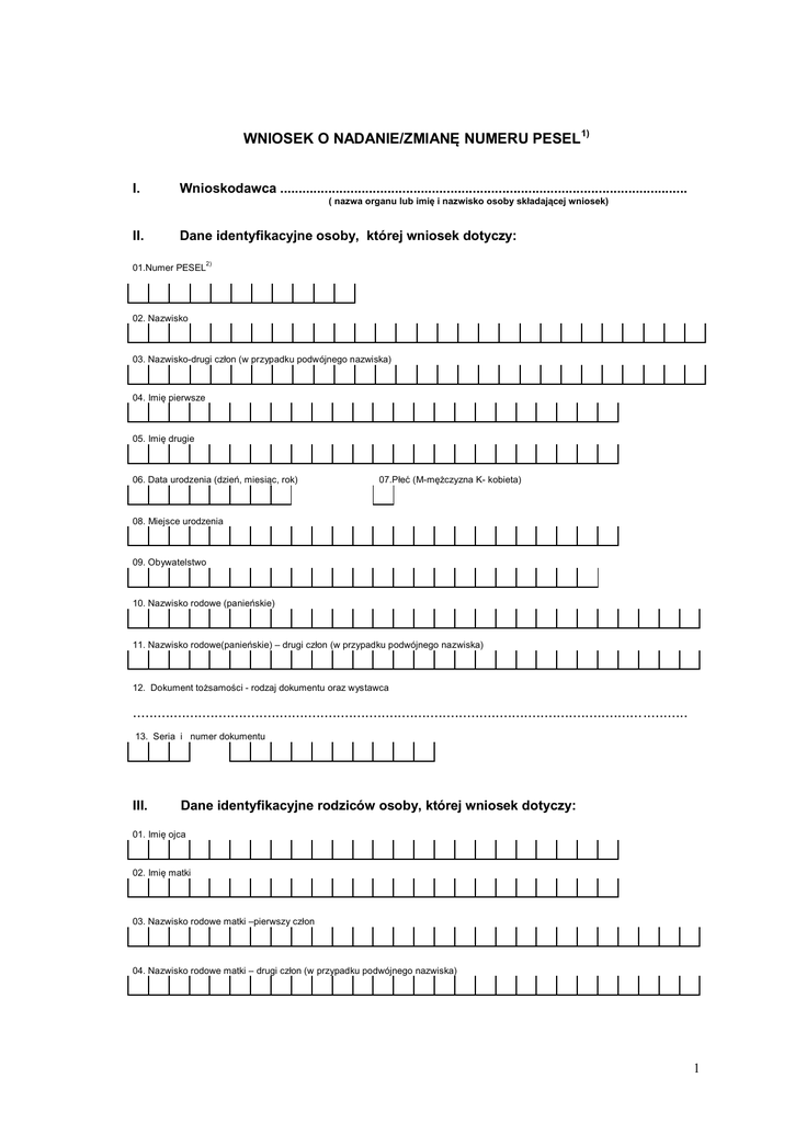 WNIOSEK O NADANIE/ZMIANĘ NUMERU PESEL1) I. Wnioskodawca .............................................................................................................. ( nazwa organu lub imię i nazwisko osoby składającej wniosek) II. Dane identyfikacyjne osoby, której wniosek dotyczy: 01.Numer PESEL 2) 02. Nazwisko 03. Nazwisko-drugi człon (w przypadku podwójnego nazwiska) 04. Imię pierwsze 05. Imię drugie 06. Data urodzenia (dzień, miesiąc, rok) 07.Płeć (M-mężczyzna K- kobieta) 08. Miejsce urodzenia 09. Obywatelstwo 10. Nazwisko rodowe (panieńskie) 11. Nazwisko rodowe(panieńskie) – drugi człon (w przypadku podwójnego nazwiska) 12. Dokument tożsamości - rodzaj dokumentu oraz wystawca ........................................................................................................................................ 13. Seria i numer dokumentu III. Dane identyfikacyjne rodziców osoby, której wniosek dotyczy: 01. Imię ojca 02. Imię matki 03. Nazwisko rodowe matki –pierwszy człon 04. Nazwisko rodowe matki – drugi człon (w przypadku podwójnego nazwiska) 1 Adres zameldowania na pobyt stały lub czasowy ponad dwa miesiące3) IV. 01. Pobyt ( S - stały, C-czasowy) 02.Kod terytorialny 4) 03. Województwo 04. Gmina 05. Kod pocztowy 06. Miejscowość 07. Ulica 08. Numer domu 09. Numer lokalu 10. Data zameldowania na pobyt stały (dzień, miesiąc, rok) 11. Czasokres zameldowania na pobyt czasowy od - do (dzień, miesiąc, rok) Adres zameldowania na pobyt stały za granicą 5) V. 01. Kraj Podstawa prawna upoważniająca do otrzymania numeru PESEL-wskazanie konkretnego przepisu przewidującego potrzebę posiadania numeru PESEL 6): ......................................................................................................................................................... ......................................................................................................................................................... ......................................................................................................................................................... ......................................................................................................................................................... VII. Powód zmiany numeru PESEL2): ......................................................................................................................................................... ......................................................................................................................................................... ......................................................................................................................................................... ......................................................................................................................................................... ......................................................................................................................................................... ......................................................................................................................................................... VI. Pieczątka i podpis wnioskodawcy Data Pouczenie: 1) niepotrzebne skreślić, 2) wypełnić w przypadku występowania o zmianę numeru PESEL, 3) dotyczy osób zameldowanych na terenie RP, 4) nie dotyczy osób składających wniosek w trybie art.31b. ust.1 ustawy z dnia 10 kwietnia 1974 r. o ewidencji ludności i dowodach osobistych, 5) dotyczy osób nie zameldowanych na pobyt stały na terenie RP, 6) dotyczy osób składających wniosek w trybie art.31b ust.1 ustawy, o której mowa w pkt.5. Do wniosku należy dołączyć aktualny odpis skrócony aktu urodzenia lub aktualny odpis skróconego aktu małżeństwa. 2