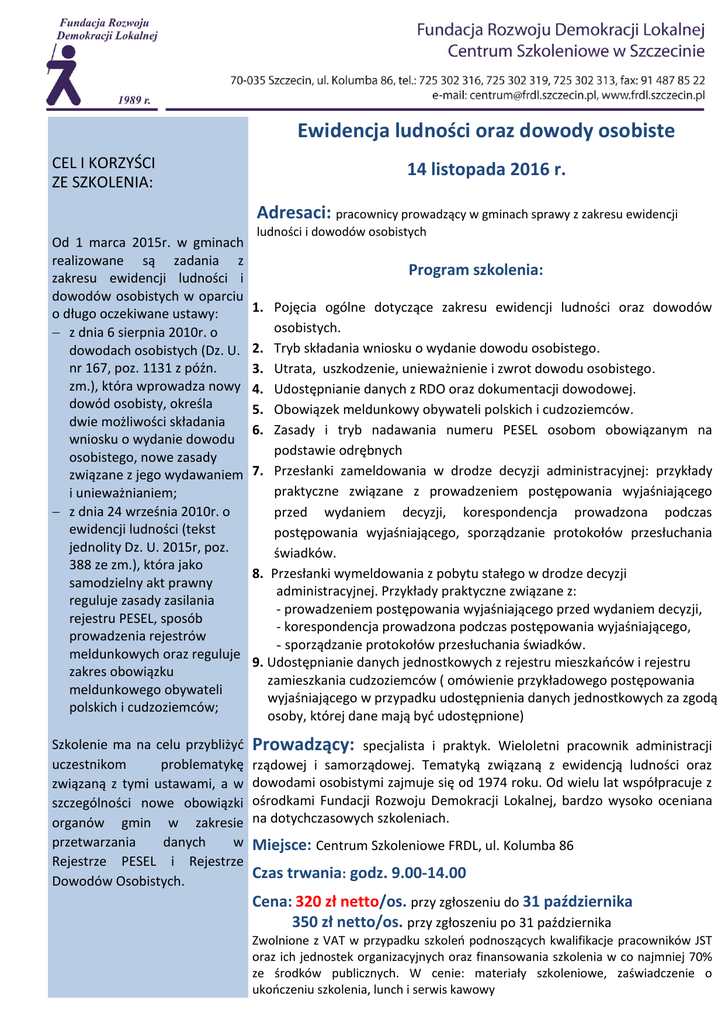Ewidencja ludności oraz dowody osobiste CEL I KORZYŚCI ZE SZKOLENIA: 14 listopada 2016 r. Adresaci: pracownicy prowadzący w gminach sprawy z zakresu ewidencji Od 1 marca 2015r. w gminach realizowane są zadania z zakresu ewidencji ludności i dowodów osobistych w oparciu o długo oczekiwane ustawy: z dnia 6 sierpnia 2010r. o dowodach osobistych (Dz. U. nr 167, poz. 1131 z późn. zm.), która wprowadza nowy dowód osobisty, określa dwie możliwości składania wniosku o wydanie dowodu osobistego, nowe zasady związane z jego wydawaniem i unieważnianiem; z dnia 24 września 2010r. o ewidencji ludności (tekst jednolity Dz. U. 2015r, poz. 388 ze zm.), która jako samodzielny akt prawny reguluje zasady zasilania rejestru PESEL, sposób prowadzenia rejestrów meldunkowych oraz reguluje zakres obowiązku meldunkowego obywateli polskich i cudzoziemców; Szkolenie ma na celu przybliżyć uczestnikom problematykę związaną z tymi ustawami, a w szczególności nowe obowiązki organów gmin w zakresie przetwarzania danych w Rejestrze PESEL i Rejestrze Dowodów Osobistych. ludności i dowodów osobistych Program szkolenia: 1. Pojęcia ogólne dotyczące zakresu ewidencji ludności oraz dowodów osobistych. 2. Tryb składania wniosku o wydanie dowodu osobistego. 3. Utrata, uszkodzenie, unieważnienie i zwrot dowodu osobistego. 4. Udostępnianie danych z RDO oraz dokumentacji dowodowej. 5. Obowiązek meldunkowy obywateli polskich i cudzoziemców. 6. Zasady i tryb nadawania numeru PESEL osobom obowiązanym na podstawie odrębnych 7. Przesłanki zameldowania w drodze decyzji administracyjnej: przykłady praktyczne związane z prowadzeniem postępowania wyjaśniającego przed wydaniem decyzji, korespondencja prowadzona podczas postępowania wyjaśniającego, sporządzanie protokołów przesłuchania świadków. 8. Przesłanki wymeldowania z pobytu stałego w drodze decyzji administracyjnej. Przykłady praktyczne związane z: - prowadzeniem postępowania wyjaśniającego przed wydaniem decyzji, - korespondencja prowadzona podczas postępowania wyjaśniającego, - sporządzanie protokołów przesłuchania świadków. 9. Udostępnianie danych jednostkowych z rejestru mieszkańców i rejestru zamieszkania cudzoziemców ( omówienie przykładowego postępowania wyjaśniającego w przypadku udostępnienia danych jednostkowych za zgodą osoby, której dane mają być udostępnione) Prowadzący: specjalista i praktyk. Wieloletni pracownik administracji rządowej i samorządowej. Tematyką związaną z ewidencją ludności oraz dowodami osobistymi zajmuje się od 1974 roku. Od wielu lat współpracuje z ośrodkami Fundacji Rozwoju Demokracji Lokalnej, bardzo wysoko oceniana na dotychczasowych szkoleniach. Miejsce: Centrum Szkoleniowe FRDL, ul. Kolumba 86 Czas trwania: godz. 9.00-14.00 Cena: 320 zł netto/os. przy zgłoszeniu do 31 października 350 zł netto/os. przy zgłoszeniu po 31 października Zwolnione z VAT w przypadku szkoleń podnoszących kwalifikacje pracowników JST oraz ich jednostek organizacyjnych oraz finansowania szkolenia w co najmniej 70% ze środków publicznych. W cenie: materiały szkoleniowe, zaświadczenie o ukończeniu szkolenia, lunch i serwis kawowy RABAT 10% dla każdej kolejnej osoby zgłoszonej z tej samej instytucji Zgłoszenia: należy dokonywać najpóźniej do dnia 7 listopada 2016 r. drogą elektroniczną poprzez stronę (www.frdl.szczecin.pl faksem (091 4878522) lub przesłać skan karty na mail: [email protected]