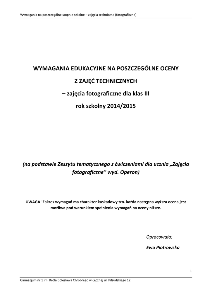 Wymagania na poszczególne stopnie szkolne – zajęcia techniczne (fotograficzne) WYMAGANIA EDUKACYJNE NA POSZCZEGÓLNE OCENY Z ZAJĘĆ TECHNICZNYCH – zajęcia fotograficzne dla klas III rok szkolny 2014/2015 (na podstawie Zeszytu tematycznego z ćwiczeniami dla ucznia „Zajęcia fotograficzne” wyd. Operon) UWAGA! Zakres wymagań ma charakter kaskadowy tzn. każda następna wyższa ocena jest możliwa pod warunkiem spełnienia wymagań na oceny niższe. Opracowała: Ewa Piotrowska 1 Gimnazjum nr 1 im. Króla Bolesława Chrobrego w Łęcznej ul. Piłsudskiego 12 Wymagania na poszczególne stopnie szkolne – zajęcia techniczne (fotograficzne) Ogólne kryteria ocen: Ocenę celującą otrzymuje uczeń, który: posiadł wiedze i umiejętności wykraczające poza program zajęć technicznych realizowany w gimnazjum uczestniczy w nadobowiązkowych formach zajęć technicznych, np. reprezentuje szkołę w konkursach wiedzy technicznej i osiąga sukcesy interesuje sie literatura fachowa, rozwijając zainteresowania technika potrafi samodzielnie i w sposób twórczy rozwiązywać problemy związane z technika, potrafi wypowiadać sie i dyskutować na tematy techniczne, uzasadniając poprawność rozumowania zawsze jest wzorowo zaangażowany w prace na lekcji i przygotowany do zajęć technicznych Ocenę bardzo dobra otrzymuje uczeń, który: opanował bez zastrzeżeń wiedze i umiejętności z zakresu programu zajęć technicznych realizowanego w gimnazjum ma bardzo duża wiedze merytoryczna oraz proponuje ciekawe rozwiązania techniczne w trakcie wykonywanych zadań, projektów i ćwiczeń zadania praktyczne realizuje prawidłowo, dobrze posługuje sie zdobytymi wiadomościami i umiejętnościami samodzielnie wykonuje zadania i ćwiczenia o wyższym stopniu trudności potrafi zastosować zdobyta wiedze techniczna do rozwiązania zadań i problemów w różnych sytuacjach jego prace spełniają wszystkie kryteria podane przez nauczyciela, terminowo wywiązuje sie ze wszystkich zadań, jest aktywny na zajęciach, pracuje systematycznie i efektywnie współdziała w grupie. Ocenę dobra otrzymuje uczeń, który: opanował większość wiadomości i umiejętności przewidzianych w programie zajęć technicznych dla gimnazjum poprawnie i samodzielnie rozwiązuje zadania praktyczne i teoretyczne, ale potrzebuje na to więcej czasu jest pracowity i chętny do pracy, ma przygotowanie i umiejętności z zakresu realizowanego tematu samodzielnie wykonuje zadania o średnim stopniu trudności wykazuje postępy w swojej pracy, ale nie opanował wszystkich umiejętności określonych w programie zajęć technicznych dba o ukończenie zadań praktycznych na zaplanowanym przez nauczyciela etapie oraz w wyznaczonym terminie zazwyczaj jest przygotowany do zajęć i czynnie w nich uczestniczy 2 Gimnazjum nr 1 im. Króla Bolesława Chrobrego w Łęcznej ul. Piłsudskiego 12 Wymagania na poszczególne stopnie szkolne – zajęcia techniczne (fotograficzne) Ocenę dostateczna otrzymuje uczeń, który: opanował w sposób zadowalający podstawowe umiejętności z zakresu programu zajęć technicznych realizowanego w gimnazjum, umożliwiające rozwiązywanie zadań o średnim stopniu trudności (czasem przy pomocy nauczyciela) wymaga zachęty do pracy i dłuższego czasu na jej wykonanie, potrzebuje pomocy nauczyciela zazwyczaj jest przygotowany do lekcji samodzielnie wykonuje zadania o podstawowym stopniu trudności stara sie pracować systematycznie, ale potrzebuje dodatkowej pomocy nauczyciela przy realizacji swoich prac Ocenę dopuszczająca otrzymuje uczeń, który: wykonuje proste zadania bywa przygotowany do zajęć, chociaż pracuje niesystematycznie, ma braki w wiadomościach i umiejętnościach, które jednak nie uniemożliwiają mu dalszej nauki samodzielnie lub z pomocą nauczyciela wykonuje większość zadań o podstawowym stopniu trudności zadania zlecone przez nauczyciela wykonuje z opóźnieniem korzysta z możliwości poprawiania prac praktycznych wykazuje bierny stosunek do przedmiotu 3 Gimnazjum nr 1 im. Króla Bolesława Chrobrego w Łęcznej ul. Piłsudskiego 12 Wymagania na poszczególne stopnie szkolne – zajęcia techniczne (fotograficzne) 1. Podstawy fotografii Wymagania, wiedza i umiejętności ucznia na ocenę DOPUSZCZAJĄCĄ wymieni najistotniejsze daty, nazwiska i wydarzenia w rozwoju fotografii wyjaśni słowo „fotografia” wymieni nazwy podstawowych aparatów fotograficznych np. aparat kompaktowy, lustrzanka zna zasady używania lampy błyskowej wymieni podstawowe formaty zdjęć (9x13, 10x15 itd.) zna podstawowe wartości ISO wymieni kilka popularnych formatów zapisu zdjęć wie co to jest autofokus potrafi włączyć i wyłączyć lampę błyskową w aparacie Wymagania, wiedza i umiejętności ucznia na ocenę DOSTATECZNĄ wymieni nazwy podstawowych aparatów fotograficznych np. aparat kompaktowy, lustrzanka i wyjaśni różnicę między nimi wyjaśni pojęcie „matryca”, „camera obscura” omówi najważniejsze cechy cyfrowych aparatów kompaktowych omówi najważniejsze cechy lustrzanek cyfrowych zna najpopularniejsze formaty zapisu zdjęć opisuje znaczenie symboli na wyświetlaczu lcd aparatu cyfrowego zna funkcję lampy błyskowej w swoim aparacie cyfrowym omawia zasady używania trybów tematycznych zna i stosuje zasady właściwej kompozycji zdjęcia zna podział kolorów z uwzględnieniem: barw prostych i złożonych barw achromatycznych monochromatycznych i chromatycznych barw podstawowych i wtórnych wyjaśnia zasady kompozycji barw harmonijnych i kontrastowych (koło barw) 4 Gimnazjum nr 1 im. Króla Bolesława Chrobrego w Łęcznej ul. Piłsudskiego 12 Wymagania na poszczególne stopnie szkolne – zajęcia techniczne (fotograficzne) Wymagania, wiedza i umiejętności ucznia na ocenę DOBRĄ porównuje budowę cyfrowego aparatu kompaktowego i lustrzanki cyfrowej wyjaśni pojęcia: „obiektyw”, „jasność obiektywu” i „ogniskowa” wymieni rodzaje