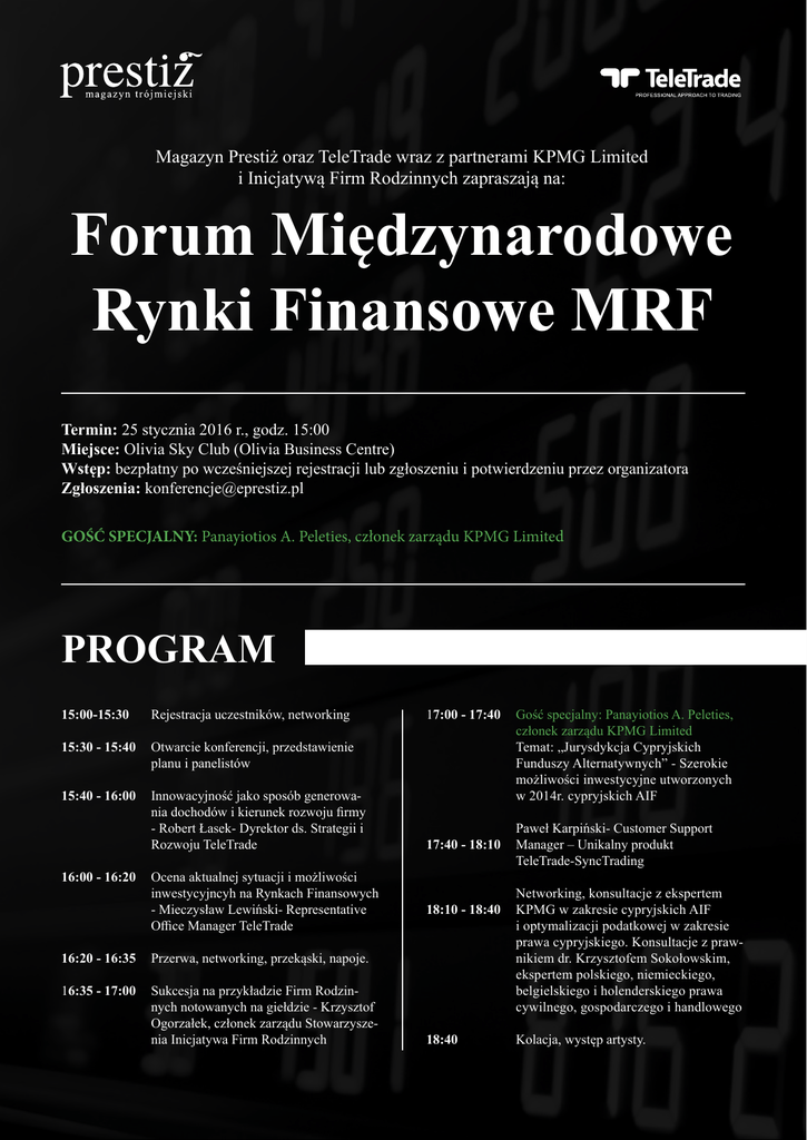 Magazyn Prestiż oraz TeleTrade wraz z partnerami KPMG Limited i Inicjatywą Firm Rodzinnych zapraszają na: Forum Międzynarodowe Rynki Finansowe MRF Termin: 25 stycznia 2016 r., godz. 15:00 Miejsce: Olivia Sky Club (Olivia Business Centre) Wstęp: bezpłatny po wcześniejszej rejestracji lub zgłoszeniu i potwierdzeniu przez organizatora Zgłoszenia: [email protected] GOŚĆ SPECJALNY: Panayiotios A. Peleties, członek zarządu KPMG Limited PROGRAM 15:00-15:30 Rejestracja uczestników, networking 15:30 - 15:40 Otwarcie konferencji, przedstawienie planu i panelistów 15:40 - 16:00 Innowacyjność jako sposób generowania dochodów i kierunek rozwoju firmy - Robert Łasek- Dyrektor ds. Strategii i Rozwoju TeleTrade 16:00 - 16:20 Ocena aktualnej sytuacji i możliwości inwestycyjncyh na Rynkach Finansowych - Mieczysław Lewiński- Representative Office Manager TeleTrade 16:20 - 16:35 Przerwa, networking, przekąski, napoje. 16:35 - 17:00 Sukcesja na przykładzie Firm Rodzinnych notowanych na giełdzie - Krzysztof Ogorzałek, członek zarządu Stowarzyszenia Inicjatywa Firm Rodzinnych 17:00 - 17:40 17:40 - 18:10 18:10 - 18:40 18:40 Gość specjalny: Panayiotios A. Peleties, członek zarządu KPMG Limited Temat: „Jurysdykcja Cypryjskich Funduszy Alternatywnych” - Szerokie możliwości inwestycyjne utworzonych w 2014r. cypryjskich AIF Paweł Karpiński- Customer Support Manager – Unikalny produkt TeleTrade-SyncTrading Networking, konsultacje z ekspertem KPMG w zakresie cypryjskich AIF i optymalizacji podatkowej w zakresie prawa cypryjskiego. Konsultacje z prawnikiem dr. Krzysztofem Sokołowskim, ekspertem polskiego, niemieckiego, belgielskiego i holenderskiego prawa cywilnego, gospodarczego i handlowego Kolacja, występ artysty. O FORUM W czasach niestabilnej sytuacji geopolitycznej, wahań na rynkach finansowych, jeszcze bardziej zwracamy uwagę na bezpieczeństwo naszych inwestycji. Podczas konferencji zaproszeni przez nas eksperci opowiedzą jak poruszać się po rynkach finansowych w okresie kryzysu, wskażą rynki i produkty odznaczające się bezpieczeństwem i zminimalizowanym ryzykiem. Zwrócą też uwagę na produkty i usługi innowacyjne, które mogą okazać się szansą rozwoju dla Twojej firmy. Wszystko w oparciu o giełdę i rynki finansowe. Gość specjalny, Panayiotios A. Peleties, członek zarządu KPMG Limited, jednej z największych światowych sieci firm doradczych i audytorskich, opowie o zaletach cypryjskich Inwestycyjnych Funduszy Alternatywnych (AIF) również w odniesieniu do polskiego sytemu podatkowego. W czasie konferencji do Państwa dyspozycji będą polscy konsultanci z KPMG Limited, z którymi będzie można porozmawiać również o optymalizacji podatkowej w oparciu o cypryjskie spółki prawa handlowego. Podczas konferencji poruszymy również na niezwykle istotną kwestię sukcesji w firmach rodzinnych. Nasi eksperci pokażą, że sukcesję można skutecznie przeprowadzić również w dużych firmach giełdowych. PARTNERZY TeleTrade Europe jest częścią TeleTrade Group, będącej brokerem zapewniającym dostęp do handlu i usług doradztwa finansowego dla szerokiego zakresu rynków finansowych. Firma posiada ponad 20-letnią historię oraz ponad 200 biur w 30 krajach, zatrudniając ponad 3000 profesjonalistów. TeleTrade jest brokerem licencjonowanym i nadzorowanym na terenie Unii Europejskiej, w swoim dorobku ma liczne nagrody przyznane przez najbardziej cenione instytucje finansowe na świecie. KPMG to międzynarodowa sieć firm świadczących usługi z zakresu audytu, doradztwa podatkowego i doradztwa gospodarczego. KPMG zatrudnia 174 tysiące pracowników w 155 krajach. KPMG posiada zespół doświadczonych specjalistów z różnych dziedzin, którzy doradzą Państwu w każdym zagadnieniu związanym z prowadzeniem działalności, również tej innowacyjnej i badawczo - rozwojowej. Ponadto KPMG, jako jedna z pierwszych dużych firm doradczych w Polsce, stworzyła zespół doświadczonych specjalistów z różnych dziedzin, którzy skupiają się na pracy przede wszystkim z firmami rodzinnymi. To pierwsza w Polsce organizacja zrzeszająca firmy rodzinne i nadal pozostaje jedynym tego typu stowarzyszeniem. Jego celem jest integracja środowiska, wspieranie rozwoju firm rodzinnych oraz pomoc w rozwiązywaniu specyficznych problemów przedsiębiorstw rodzinnych. Stowarzyszenie zrzesza nie tyko firmy rodzinne, ale także naukowców i ekspertów specjalizujących się w przedsiębiorczości rodzinnej.