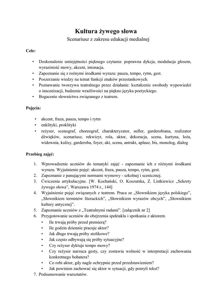 Kultura żywego słowa Scenariusz z zakresu edukacji medialnej Cele: • Doskonalenie umiejętności pięknego czytania: poprawna dykcja, modulacja głosem, wyrazistość mowy, akcent, intonacja. Zapoznanie się z rożnymi środkami wyrazu: pauza, tempo, rytm, gest. Poszerzanie wiedzy na temat funkcji znaków przestankowych. Poznawanie tworzywa teatralnego przez działanie: kształcenie swobody wypowiedzi o inscenizacji, budzenie wrażliwości na piękno języka poetyckiego. Bogacenie słownictwa związanego z teatrem. • • • • Pojęcia: • • • akcent, fraza, pauza, tempo i rytm enklityki, proklityki reżyser, scenograf, choreograf, charakteryzator, sufler, garderobiana, realizator dźwięków, scenariusz, rekwizyt, rola, aktor, dekoracja, scena, kurtyna, loża, widownia, kulisy, garderoba, foyer, akt, scena, antrakt, aplauz, bis, monolog, dialog Przebieg zajęć: 1. 2. 3. 4. 5. 6. 7. Wprowadzenie uczniów do tematyki zajęć - zapoznanie ich z różnymi środkami wyrazu. Wyjaśnienie pojęć: akcent, fraza, pauza, tempo, rytm, gest. Zapoznanie z panującymi normami wymowy - szkolnej i scenicznej. Ćwiczenia artykulacyjne. [W. Kochański, O. Koszutska, Z. Listkiewicz „Sekrety żywego słowa”, Warszawa 1974 r., 144] Wyjaśnienie pojęć związanych z teatrem. Praca ze „Słownikiem języka polskiego”, „Słownikiem terminów literackich”, „Słownikiem wyrazów obcych”, „Słownikiem kultury antycznej”. Zapoznanie uczniów z „Teatralnymi radami”. [załącznik nr 2] Przygotowanie uczniów do obejrzenia spektaklu i spotkania z aktorem. • Ile trwają próby przed premierą? • Ile godzin dziennie pracuje aktor? • Jak długo trwają próby stolikowe? • Jak często odbywają się próby sytuacyjne? • Czy reżyser dyktuje tempo mowy? • Czy reżyser narzuca gesty, czy zostawia wolność w interpretacji zachowania konkretnego bohatera? • Co robi aktor, gdy nagle ochrypnie przed przedstawieniem? • Jak powinien zachować się aktor w sytuacji, gdy pomyli tekst? Podsumowanie warsztatów. Literatura M. Kubiczek, J. Olejak, B. Stworowa, Lekcje języka polskiego w klasie V szkoły podstawowej; A. Janus-Sitarz, Przygotowanie ucznia do odbioru różnych tekstów kultury; Załącznik nr 1 Historia Budynku Budynek Teatru im. Wandy Siemaszkowej przy ul. Sokoła znany jest wszystkim rzeszowianom. Niewielu jednak zdaje sobie sprawę z tego, jak ten budynek wyglądał dawniej i jaka jest jego historia. Gmach powstał pod koniec XIX w. (budowany był w latach 1890-1900) jako siedziba Towarzystwa Gimnastycznego „Sokół". Stanął on na terenie nazywanym Relówką niedaleko stawu będącego pozostałością po dawnym Jeziorze Bernardyńskim. Budynek zaprojektował Albin Zagórski, zaś elewację Franciszek Skowron. Towarzystwo, którego głównym zadaniem było propagowanie kultury i sportu, zajmowało się również krzewieniem idei niepodległościowych. W sąsiedztwie gmachu zwanego wówczas „Sokolnią” były boiska, korty tenisowe, a nawet kręgielnia. Domeną członków „Sokoła” była nie tylko gimnastyka, ale także piłka nożna oraz kolarstwo. Nieobce też były rzeszowskim „sokolnikom" sporty zimowe. Staw w sąsiednim ogrodzie oraz korty zmieniały się w zimie w duże lodowisko. Sam budynek „Sokoła" służył również innym celom. W karnawale urządzano w nim słynne bale i zabawy. W roku 1895 odbył się w nim zjazd założycielski Stronnictwa Ludowego, zaś w roku 1911 przy rzeszowskim „Sokole" powstała pierwsza w mieście drużyna skautowa. Wielkie znaczenie „Sokoła" utrzymało się także w okresie II Rzeczypospolitej. Właśnie w tym gmachu odbywały się prawie wszystkie ważne wydarzenie polityczne lub kulturalne. Sprzyjała temu sala na 396 miejsc. W roku 1935 budynek przeszedł wielki remont, w trakcie którego zmodernizowano scenę i widownię oraz założono centralne ogrzewanie. Przyszła okupacja i lata Polski Ludowej. Władze komunistyczne rozwiązały Towarzystwo Gimnastyczne „Sokół", sprzęt przekazano klubom sportowym, a sam gmach stał się siedzibą działającego tu od 1944 roku teatru. Niestety, w latach sześćdziesiątych pod kierunkiem inżyniera, którego nazwisko litościwie tu przemilczymy, dokonano zbrodni na dawnym gmachu „Sokoła", niszcząc całkowicie jego wyjątkową elewację. Wanda Felicja Katarzyna Siemaszkowa (nazwisko rodowe: Sierpińska) (ur. 30 grudnia 1867 w Lipowej k. Kobrynia, zm. 6 sierpnia 1947 w Żarnowcu) - polska aktorką reżyser, dyrektorka teatrów. Uczęszczała do gimnazjum w Łomży, gdzie stawiała pierwsze kroki na scenie teatralnej w teatrze amatorskim. Stamtąd przeniosła się do Warszawy. Debiutowała 8 października 1887 roku w Krakowie w roli Helenki w przedstawieniu „Dziwak”. Początkowo grała role liryczne, przeważnie polskich dziewcząt. W czasie pobytu w Krakowie wyszła za mąż za Antoniego Siemaszkę, również aktora sceny krakowskiej. Stopniowo wzbogacała swój repertuar o role w sztukach klasycznych i romantycznych, wprowadzała na scenę literaturę polskich autorów (August Kisielewski, Lucjan Rydel). W latach 1924-1926 na zaproszenie Polonii przebywała w Ameryce. Występowała z patriotycznymi przedstawieniami (o odrodzonej Ojczyźnie i bohaterstwie Orląt Lwowskich) i zakładała liczne kółka dramatyczne przy szkółkach parafialnych w celu pielęgnowania mowy polskiej wśród młodego pokolenia polskiej emigracji. Spełniwszy tę misję wróciła do Polski, założyła we Lwowie studio aktorskie, w którym przygotowywała nowe zastępy aktorów. W czasie pierwszej okupacji sowieckiej Lwowa (1939-1942) występowała w polskim Teatrze dramatycznym, po zajęciu Lwowa przez wojska niemieckie wyjechała do Wieliczki. Załącznik 2 TEATRALNE RADY Ubierz się odświętnie. Nie szeleść papierkami od cukierków. Głośno rozmawiaj podczas spektaklu. Nie rozpychaj się łokciami w czasie wychodzenia z teatru. Fikaj koziołki z radości. Nie spóźnia