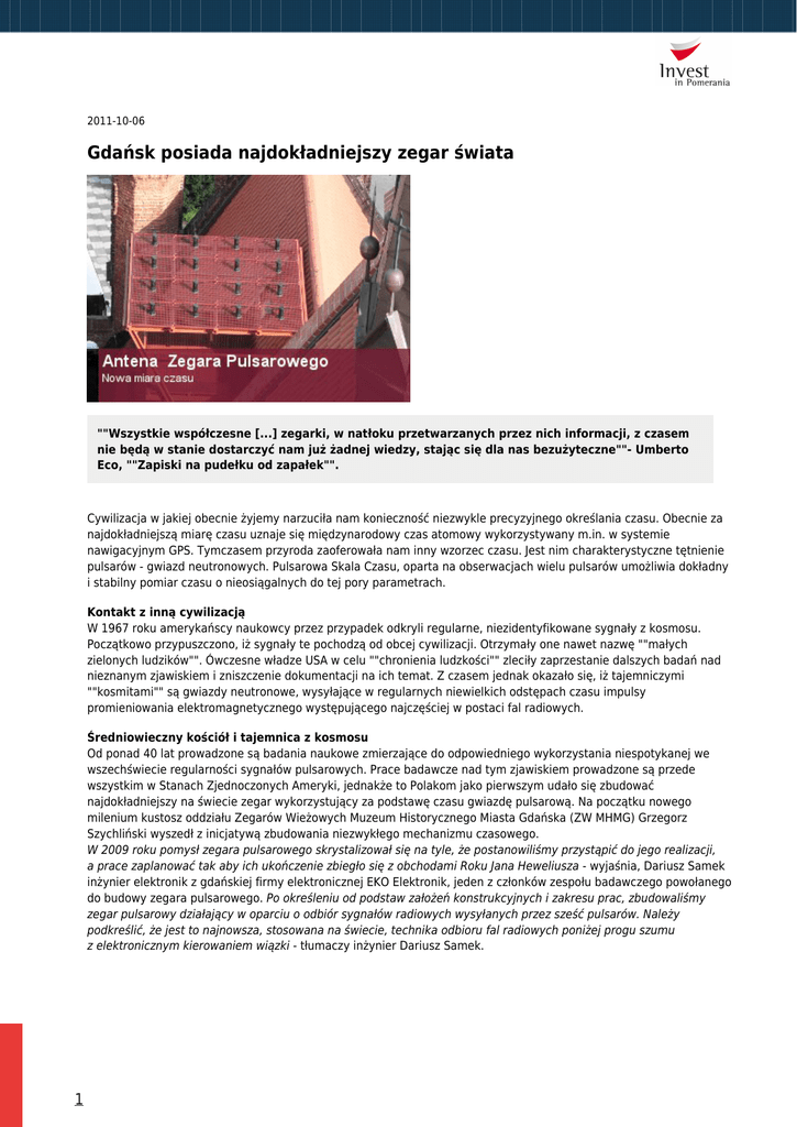 2011-10-06 Gdańsk posiada najdokładniejszy zegar świata ""Wszystkie współczesne [...] zegarki, w natłoku przetwarzanych przez nich informacji, z czasem nie będą w stanie dostarczyć nam już żadnej wiedzy, stając się dla nas bezużyteczne""- Umberto Eco, ""Zapiski na pudełku od zapałek"". Cywilizacja w jakiej obecnie żyjemy narzuciła nam konieczność niezwykle precyzyjnego określania czasu. Obecnie za najdokładniejszą miarę czasu uznaje się międzynarodowy czas atomowy wykorzystywany m.in. w systemie nawigacyjnym GPS. Tymczasem przyroda zaoferowała nam inny wzorzec czasu. Jest nim charakterystyczne tętnienie pulsarów - gwiazd neutronowych. Pulsarowa Skala Czasu, oparta na obserwacjach wielu pulsarów umożliwia dokładny i stabilny pomiar czasu o nieosiągalnych do tej pory parametrach. Kontakt z inną cywilizacją W 1967 roku amerykańscy naukowcy przez przypadek odkryli regularne, niezidentyfikowane sygnały z kosmosu. Początkowo przypuszczono, iż sygnały te pochodzą od obcej cywilizacji. Otrzymały one nawet nazwę ""małych zielonych ludzików"". Ówczesne władze USA w celu ""chronienia ludzkości"" zleciły zaprzestanie dalszych badań nad nieznanym zjawiskiem i zniszczenie dokumentacji na ich temat. Z czasem jednak okazało się, iż tajemniczymi ""kosmitami"" są gwiazdy neutronowe, wysyłające w regularnych niewielkich odstępach czasu impulsy promieniowania elektromagnetycznego występującego najczęściej w postaci fal radiowych. Średniowieczny kościół i tajemnica z kosmosu Od ponad 40 lat prowadzone są badania naukowe zmierzające do odpowiedniego wykorzystania niespotykanej we wszechświecie regularności sygnałów pulsarowych. Prace badawcze nad tym zjawiskiem prowadzone są przede wszystkim w Stanach Zjednoczonych Ameryki, jednakże to Polakom jako pierwszym udało się zbudować najdokładniejszy na świecie zegar wykorzystujący za podstawę czasu gwiazdę pulsarową. Na początku nowego milenium kustosz oddziału Zegarów Wieżowych Muzeum Historycznego Miasta Gdańska (ZW MHMG) Grzegorz Szychliński wyszedł z inicjatywą zbudowania niezwykłego mechanizmu czasowego. W 2009 roku pomysł zegara pulsarowego skrystalizował się na tyle, że postanowiliśmy przystąpić do jego realizacji, a prace zaplanować tak aby ich ukończenie zbiegło się z obchodami Roku Jana Heweliusza - wyjaśnia, Dariusz Samek inżynier elektronik z gdańskiej firmy elektronicznej EKO Elektronik, jeden z członków zespołu badawczego powołanego do budowy zegara pulsarowego. Po określeniu od podstaw założeń konstrukcyjnych i zakresu prac, zbudowaliśmy zegar pulsarowy działający w oparciu o odbiór sygnałów radiowych wysyłanych przez sześć pulsarów. Należy podkreślić, że jest to najnowsza, stosowana na świecie, technika odbioru fal radiowych poniżej progu szumu z elektronicznym kierowaniem wiązki - tłumaczy inżynier Dariusz Samek. 1 Pierwszy na świecie zegar pulsarowy został zbudowany w Gdańsku przez Grzegorza Szychlińskiego - kustosza Oddziału Zegarów Wieżowych MHMG, Eugeniusza Pazderskiego - astronoma z Centrum Astronomicznego Uniwersytetu Mikołaja Kopernika w Toruniu oraz Mirosława Owczynnika i Dariusza Samek inżynierów elektroników z gdańskiej firmy EKO Elektronik. Dokładność mechanizmu wskazywana w czasie rzeczywistym przewyższa zegary cezowe (atomowe), stanowiące dotychczas najdokładniejsze wzorce czasu. To niezwykłe urządzenie zostało zbudowane w murach Klasztoru Karmelitanów zaś zainstalowane na poddaszach trzynastowiecznego kościoła Świętej Katarzyny w Gdańsku. Wybór tego miejsca nie był przypadkowy. Dach niniejszej świątyni daje możliwości prowadzenia niezakłóconych obserwacji w bardzo długiej skali czasu liczonej w perspektywie nawet kilkuset lat. Nagła zagłada dotychczasowej cywilizacji Wyobraźmy sobie nagłą i nieprzewidzianą zagładę naszej cywilizacji spowodowaną wojną lub niewyobrażalnych rozmiarów kataklizmem - tłumaczy inżynier Mirosław Owczynnik, współtwórca najdokładniejszego zegara na świecie. W momencie odbudowywania jej pierwszą rzeczą jaką odtworzymy będzie jednostka czasu mierzona dzięki niezmiennie i regularnie wysyłanym z kosmosu sygnałom pulsarowym o dokładności 10 -18. Zbudowane przez nas urządzenie nie korzysta ze światowej sieci czasu wymagającej istnienia i funkcjonowania zegarów atomowych. Dodatkowo może zostać stworzone przy niewielkich nakładach finansowych i technicznych - dopowiada Mirosław Owczynnik. Wbrew pozorom tą ""apokaliptyczną"" wizję końca naszej cywilizacji nie koniecznie należy traktować w kategoriach fantasy czy science fiction. Naukowcy od lat obserwują na powierzchni Słońca tzw. ""burze słoneczne"" (erupcję), które w różny sposób oddziaływują na poszczególne planety układu w tym również i Ziemię. Pod koniec XIX wieku ""burza słoneczna"" spowodowała na naszej planecie paraliż ówczesnej sieci telegraficznej. Obecnie, ludzkość korzysta ze znaczniej bardziej zaawansowanej technologii. W związku z tym skutki erupcji mogą być znacznie dotkliwsze niż ponad 100 lat temu. Zdaniem naukowców taki moment może nastąpić na przełomie 2012 i 2013 roku. Źródła finansowania Innowacyjny pomysł czwórki naukowców znalazł poparcie między innymi u Prezydenta Miasta Gdańska, Pawła Adamowicza. Dodatkowo wsparcia udzieliła także Pomorska Specjalna Strefa Ekonomiczna (PSSE) i Gdański Park Naukowo-Technologiczny (GPN-T). Wspieramy najbardziej śmiałe pomysły technologiczne, które pozornie mogą wydawać się z pogranicza fantastyki wyjaśnia Teresa Kamińska, Prezes Pomorskiej Specjalnej Strefy Ekonomicznej. Wykorzystanie pulsarów przy określaniu czasu otwiera przed nami nieograniczone możliwości. To najdokładniejszy aktualnie sposób na świecie. Dodatkowo w przeciwieństwie do czasomierzy atomowych, funkcjonowanie zegara pulsarowego nie bazuje na satelitach, które można zestrzelić