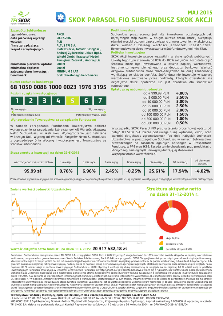 MAJ 2015 SKOK PARASOL FIO SUBFUNDUSZ SKOK AKCJI Szczegóły Subfunduszu typ subfunduszu: data pierwszej wyceny: waluta: firma zarządzająca: zespół zarządzających: minimalna pierwsza wpłata: minimalna dopłata: zalecany okres inwestycji: benchmark: AKCJI 20.07.2007 PLN ALTUS TFI S.A. Piotr Osiecki, Tomasz Gaszyński, Andrzej Zydorowicz, Jakub Ryba, Witold Chuść, Krzysztof Madej, Remigiusz Zalewski, Andrzej Lis 200 zł 200 zł MINIMUM 5 LAT brak określonego benchmarku Numer rachunku bankowego 68 1050 0086 1000 0023 1976 3195 Profil inwestora Subfundusz przeznaczony jest dla inwestorów oczekujących jak najwyższych stóp zwrotu w długim okresie czasu, którzy akceptują również wysoki poziom ryzyka związany z inwestowaniem w akcje oraz duże wahania zmiany wartości jednostek uczestnictwa. Rekomendowany okres inwestowania w Subfundusz wynosi min. 5 lat. Polityka inwestycyjna SKOK Akcji inwestuje przede wszystkim w akcje spółek publicznych. Lokaty tego typu stanowią od 80% do 100% aktywów. Pozostała część środków może być inwestowana w dłużne papiery wartościowe, instrumenty rynku pieniężnego oraz depozyty bankowe. Wartość aktywów subfunduszu może charakteryzować się dużą zmiennością wynikającą ze składu portfela. Subfundusz nie inwestuje w papiery wartościowe emitowane przez podmioty, których działalność ma negatywne skutki społeczne lub jest szkodliwa dla środowiska naturalnego. Opłaty przy nabywaniu jednostek do 4 999,99 PLN od 5 000,00 PLN od 10 000,00 PLN od 25 000,00 PLN od 50 000,00 PLN od 100 000,00 PLN od 300 000,00 PLN od 500 000,00 PLN Poziom ryzyka inwestycyjnego 2 1 3 4 5 7 6 Wyższe ryzyko Niższe ryzyko Potencjalnie niższy zysk Potencjalnie wyższy zysk Wynagrodzenie Towarzystwa za zarządzanie Funduszem W ramach zarządzania Funduszem Towarzystwo pobiera wynagrodzenie za zarządzanie, które stanowi 4% Wartości Aktywów Netto Subfunduszu w skali roku. Wynagrodzenie jest naliczane w każdym Dniu Wyceny od Wartości Aktywów Netto Subfunduszu z poprzedniego Dnia Wyceny i wypłacane jest Towarzystwu ze środków Subfunduszu. Stopa zwrotu z inwestycji na dzień 22-5-2015 4,00% 3,50% 3,00% 2,50% 2,00% 1,50% 1,00% 0,50% W przypadku SKOK Parasol FIO przy ustalaniu procentowej opłaty od nabyć TFI SKOK S.A. bierze pod uwagę sumę wpłacanej kwoty oraz wartość dotychczas zgromadzonych (do dnia nabycia) Jednostek Uczestnictwa w poszczególnym Subfunduszu w ramach Subrejestrów prowadzonych na zasadach ogólnych opisanych w Prospektach Funduszy, w PPE oraz IKZE. Zasada ta nie obowiązuje przy produktach, których regulaminy bądź umowy wykluczają jej stosowanie. Więcej na stronie www.tfiskok.pl wartość jednostki uczestnictwa 1 miesiąc 3 miesiące 6 miesięcy 12 miesięcy 36 miesięcy 60 miesięcy od pierwszej wyceny 95,99 zł 0,76% 6,96% 2,45% -0,25% 25,61% 17,94% -4,02% Prezentowane wyniki inwestycyjne nie stanowią gwarancji osiągnięcia podobnych wyników w przyszłości, są wynikiem inwestycyjnym osiągniętym w konkretnym okresie historycznym. Struktura aktywów netto na dzień 31-12-2014 r. Zmiana wartości Jednostki Uczestnictwa akcje 94,75% depozyty 4,75% Wartość aktywów netto funduszu na dzień 30-4-2015: 20 317 432,18 zł pozostałe aktywa 0,50% Fundusze i Subfundusze zarządzane przez TFI SKOK S.A., z wyjątkiem SKOK Akcji i SKOK Etyczny 2, mogą lokować do 100% wartości swoich aktywów w papiery wartościowe emitowane, poręczane lub gwarantowane przez Skarb Państwa lub Narodowy Bank Polski, a w przypadku SKOK Obligacji również przez międzynarodową instytucję finansową, której członkiem jest Rzeczpospolita Polska lub co najmniej jedno państwo członkowskie Unii Europejskiej, pod warunkiem, że papier wartościowy lub emitent, lub poręczyciel lub gwarant posiada co najmniej rating inwestycyjny nadany przez co najmniej jedną z renomowanych agencji ratingowych. SKOK Akcji cechuje się dużą zmiennością ze względu na co najmniej 80 % udział akcji w portfelu inwestycyjnym Subfunduszu. SKOK Etyczny 2 cechuje się dużą zmiennością ze względu na co najmniej 60 % udział akcji w portfelu inwestycyjnym Funduszu. Inwestycja w jednostki uczestnictwa Funduszy Inwestycyjnych nie jest lokatą bankową i wiąże się z ryzykiem, ich wartość może podlegać znacznym wahaniom zaś Uczestnik musi liczyć się z możliwością poniesienia straty. Szczegółowe opisy czynników ryzyka związanych z inwestycją w Fundusze i Subfundusze zarządzane przez TFI SKOK, S.A. zawarte są w prospektach informacyjnych Funduszy, dostępnych na stronie internetowej www.tfiskok.pl, u Dystrybutorów oraz w siedzibie Towarzystwa przy ul. Kościuszki 47 w Sopocie. Aktualne informacje finansowe o Funduszach i Subfunduszach w tym między innymi informacje o opłatach za zarządzanie znajdują się na stronie internetowej www.tfiskok.pl. Indywidualna stopa zwrotu z inwestycji uzależniona jest od wartości jednostki uczestnictwa w momencie jej zbycia i odkupienia przez Fundusz oraz od wysokości opłat manipulacyjnych pobieranych przy nabywaniu jednostek uczestnictwa. Skala i wysokość opłat manipulacyjnych określona jest w aktualnej Tabeli Opłat ustalonej przez Towarzystwo, udostępnionej na stronie internetowej www.tfiskok.pl oraz u Dystrybutora. Wypłata kwoty uzyskanej z tytułu odkupienia jednostek uczestnictwa następuje po potrąceniu należnych opłat oraz kwoty podatku do pobrania których Fundusz jest zobowiązany zgodnie z obowiązującymi przepisami prawa. Towarzystwo Funduszy Inwestycyjnych Spółdzielczych Kas Oszczędnościowo-Kredytowych S.A.(TFI SKOK S.A.) ul.Kościuszki 47, 81-702 Sopot; www.tfiskok.pl; infolinia 801 33 22 44 lub 22 541 77 67, NIP 585 14 03 031, REGON 192994951, KRS 0000183712 Sąd Rejonowy Gdańsk-Północ Wydział VIII Gospodarczy Krajowego Rejestru Sądowego, Kapitał zakładowy 4.000.000 zł wpłacony w całości TFI SKOK S.A. działa na podstawie decyzji Komisji Papierów Wart