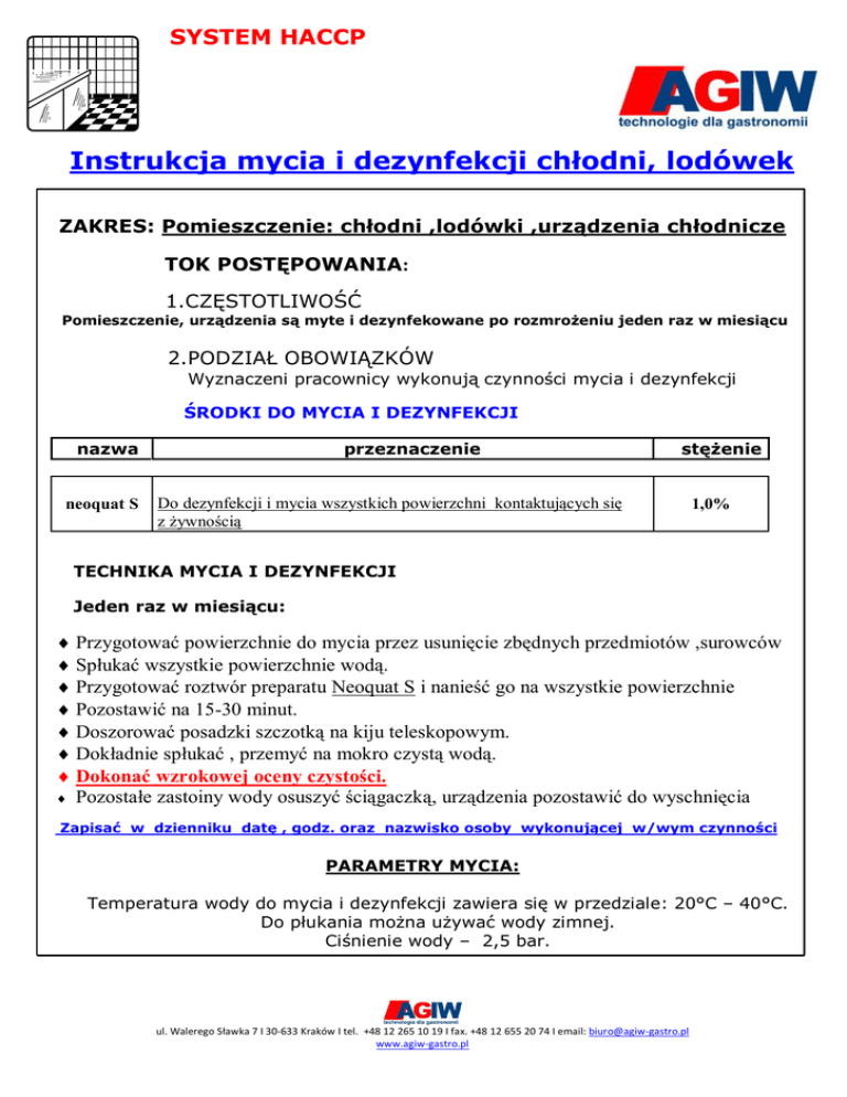SYSTEM HACCP Instrukcja mycia i dezynfekcji chłodni, lodówek ZAKRES: Pomieszczenie: chłodni ,lodówki ,urządzenia chłodnicze TOK POSTĘPOWANIA: 1.CZĘSTOTLIWOŚĆ Pomieszczenie, urządzenia są myte i dezynfekowane po rozmrożeniu jeden raz w miesiącu 2.PODZIAŁ OBOWIĄZKÓW Wyznaczeni pracownicy wykonują czynności mycia i dezynfekcji ŚRODKI DO MYCIA I DEZYNFEKCJI nazwa neoquat S przeznaczenie stężenie Do dezynfekcji i mycia wszystkich powierzchni kontaktujących się z żywnością 1,0% TECHNIKA MYCIA I DEZYNFEKCJI Jeden raz w miesiącu: Przygotować powierzchnie do mycia przez usunięcie zbędnych przedmiotów ,surowców Spłukać wszystkie powierzchnie wodą. Przygotować roztwór preparatu Neoquat S i nanieść go na wszystkie powierzchnie Pozostawić na 15-30 minut. Doszorować posadzki szczotką na kiju teleskopowym. Dokładnie spłukać , przemyć na mokro czystą wodą. Dokonać wzrokowej oceny czystości. Pozostałe zastoiny wody osuszyć ściągaczką, urządzenia pozostawić do wyschnięcia Zapisać w dzienniku datę , godz. oraz nazwisko osoby wykonującej w/wym czynności PARAMETRY MYCIA: Temperatura wody do mycia i dezynfekcji zawiera się w przedziale: 20°C – 40°C. Do płukania można używać wody zimnej. Ciśnienie wody – 2,5 bar. ul. Walerego Sławka 7 I 30-633 Kraków I tel. +48 12 265 10 19 I fax. +48 12 655 20 74 I email: [email protected] www.agiw-gastro.pl