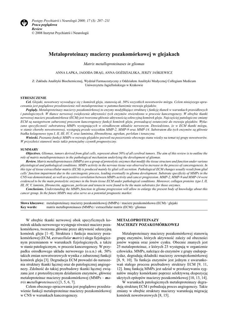 Postêpy Psychiatrii i Neurologii 2008; 17 (3): 207211 Praca pogl¹dowa Review © 2008 Instytut Psychiatrii i Neurologii Metaloproteinazy macierzy pozakomórkowej w glejakach Matrix metalloproteinases in gliomas ANNA £APKA, JAGODA DR¥G, ANNA GODZIALSKA, JERZY JAKIEWICZ Z: Zak³adu Analityki Biochemicznej, Wydzia³ Farmaceutyczny z Oddzia³em Analityki Medycznej Collegium Medicum Uniwersytetu Jagielloñskiego w Krakowie STRESZCZENIE Cel. Glejaki, nowotwory wywodz¹ce siê z komórek gleju, stanowi¹ ok. 50% wszystkich nowotworów mózgu. Celem niniejszego opracowania jest pogl¹dowe przedstawienie roli metaloproteinaz w patomechanizmie rozwoju glejaków. Pogl¹dy. Metaloproteinazy macierzy pozakomórkowej to enzymy modyfikuj¹ce strukturê i funkcjê tkanek w warunkach prawid³owych i patologicznych. W tkance nerwowej zwiêkszenie aktywnoci tych enzymów stwierdzono w procesie kancerogenezy. W obrêbie tkanki nerwowej macierz pozakomórkowa (ECM) jest tworzona g³ównie aktywnoci¹ sekrecyjn¹ komórek gleju. Najczêciej patologiczne zmiany ECM s¹ nastêpstwem zaburzonej procesem kancerogenezy funkcji komórek gleju, prowadz¹cej ostatecznie do rozwoju glejaków. Wykazano specyficznoæ substratow¹ MMPs wystêpuj¹cych w orodkowym uk³adzie nerwowym. Dowiedziono, ¿e w ECM tkanki mózgu, w stanie choroby nowotworowej, wystêpuj¹ przede wszystkim MMP-2, MMP-9 oraz MMP-14. Substratem dla tych enzymów s¹ g³ównie bia³ka kolagenowe typu I, II, III, IV, V, oraz laminina, fibronektyna, agrekan, perlekan i tenascyna. Wnioski. Poznanie funkcji MMPs w rozwoju glejaków pozwoli na poszerzenie obecnego stanu wiedzy na temat tej grupy nowotworów. W przysz³oci stanowiæ mo¿e tak¿e potencjalny czynnik prognostyczny. SUMMARY Objectives. Gliomas, tumors derived from glial cells, represent about 50% of all cerebral tumors. The aim of this review is to outline the role of matrix metalloproteinases in the pathological mechanism underlying the development of gliomas. Review. Matrix metalloproteinases (MMPs) are a group of proteolytic enzymes that modify the tissue structure and function under various physiological and pathological conditions. MMPs activity in the nervous tissue was observed to increase in the process of cancerogenesis. In this type of tissue extracellular matrix (ECM) is produced mainly by glial cell secretion. Pathological ECM changes usually result from glial cells function impairment due to the carcinogenic process, leading eventually to glioma development. Substrate specificity of MMPs in the CNS was demonstrated, as well as a positive correlation between MMPs activity and cancer progression. MMP-2, MMP-9 and MMP-14 were evidenced to be the main proteolytic enzymes in the brain tissue ECM under pathological conditions. Moreover, collagen proteins type I, II, III, IV, V, laminin, fibronectin, aggrecan, perlecan and tenascin were found to be the main substrates for those enzymes. Conclusions. Understanding the MMPs function in glioma progression will allow to enlarge the present body of knowledge about this cancer group. In the future MMPs may also serve as a potential prognostic marker. S³owa kluczowe: metaloproteinazy macierzy pozakomórkowej (MMPs) / macierz pozakomórkowa (ECM) / glejaki Key words: matrix metalloproteinases (MMPs) / extracellular matrix (ECM) / gliomas W obrêbie tkanki nerwowej obok specyficznych komórek uk³adu nerwowego wystêpuje równie¿ macierz pozakomórkowa, tworzona g³ównie przez aktywnoæ sekrecyjn¹ komórek gleju [14]. Struktura i funkcja macierzy pozakomórkowej (ECM, extracellular matrix) ulega fizjologicznym przemianom w warunkach fizjologicznych, a tak¿e w stanie patologicznym, w procesie kancerogenezy. W przypadku orodkowego uk³adu nerwowego (o.u.n.) ok. 50% takich zmian nowotworowych wynika z zaburzonej funkcji komórek gleju [3]. Degradacja ECM prowadzi do naruszenia struktury tkanki ³¹cznej oraz do patologicznej angiogenezy. Zdolnoæ do takiej przebudowy tkanki ³¹cznej zwi¹zana jest z proteolitycznym dzia³aniem enzymów, g³ównie metaloproteinaz macierzy pozakomórkowej (MMPs matrix metalloproteinases) [3, 5, 6, 7]. Celem obecnego opracowania jest pogl¹dowe przedstawienie funkcji metaloproteinaz macierzy pozakomórkowej w CNS w warunkach kancerogenezy. METALOPROTEINAZY MACIERZY POZAKOMÓRKOWEJ Metaloproteinazy macierzy pozakomórkowej stanowi¹ grupê enzymów, których aktywnoæ zale¿y od obecnoci jonów wapnia oraz jonów cynku. Obecnie znanych jest 25 metaloproteinaz, z których 23 wystêpuj¹ w organizmie cz³owieka. MMPs, nale¿¹ce do enzymów z grupy endopeptydaz, degraduj¹ sk³adniki macierzy zewn¹trzkomórkowej [8, 9, 10]. Ta funkcja enzymów jest jednym z uwarunkowañ sta³ego procesu przebudowy struktury ECM [9, 11, 12]. Inn¹ funkcj¹ MMPs jest udzia³ w przekazywaniu sygna³ów miêdzy komórkami poprzez selektywn¹ ekspozycjê ukrytych epitopów macierzy pozakomórkowej [10, 13, 14]. W warunkach patologicznych metaloproteinazy degraduj¹ strukturê ECM i pobudzaj¹ proces angiogenezy. Takie zmiany w obrêbie struktury macierzy warunkuj¹ migracjê komórek nowotworowych [8, 15]. 208 Anna £apka, Jagoda Dr¹g, Anna Godzialska, Jerzy Jakiewicz Budowa metaloproteinaz macierzy pozakomórkowej Metaloproteinazy to bia³ka o masie cz¹steczkowej pomiêdzy 28 a 92 kDa, zawieraj¹ce w swej cz¹steczce atomy wapnia oraz atomy cynku. Enzymy te zosta³y podzielone na grupy ze wzglêdu na specyfikê substratow¹ oraz budowê. Wród MMPs wyró¿nia siê kolagenazy, ¿elatynazy, stromielizyny, matrylizyny, enamelizynê, metaloelastazê, metaloproteinazy b³onowe, oraz pozosta³e enzymy, nie zaklasyfikowane do ¿adnej z wymienionych grup [8, 9, 11, 12]. Wszystkie MMPs posiadaj¹ w swej budowie charakterystyczne dla ca³ej rodziny domeny, oraz domeny specyficzne dla poszczególnej grupy enzymów. Klasyfikacja MMPs oraz ich nazwy zwyczajowe zosta³y przedstawione w tabeli 1 [8, 9, 12]. Tablica 1. Metaloproteinazy macierzy p