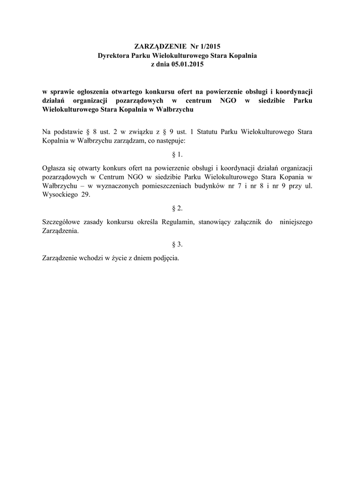 ZARZĄDZENIE Nr 1/2015 Dyrektora Parku Wielokulturowego Stara Kopalnia z dnia 05.01.2015 w sprawie ogłoszenia otwartego konkursu ofert na powierzenie obsługi i koordynacji działań organizacji pozarządowych w centrum NGO w siedzibie Parku Wielokulturowego Stara Kopalnia w Wałbrzychu Na podstawie § 8 ust. 2 w związku z § 9 ust. 1 Statutu Parku Wielokulturowego Stara Kopalnia w Wałbrzychu zarządzam, co następuje: § 1. Ogłasza się otwarty konkurs ofert na powierzenie obsługi i koordynacji działań organizacji pozarządowych w Centrum NGO w siedzibie Parku Wielokulturowego Stara Kopania w Wałbrzychu – w wyznaczonych pomieszczeniach budynków nr 7 i nr 8 i nr 9 przy ul. Wysockiego 29. § 2. Szczegółowe zasady konkursu określa Regulamin, stanowiący załącznik do Zarządzenia. § 3. Zarządzenie wchodzi w życie z dniem podjęcia. niniejszego Załącznik nr 1 do Zarządzenia Nr 1/2015 Dyrektora Parku Wielokulturowego Stara Kopalnia z dnia 05.01.2015 REGULAMIN Dyrektor Parku Wielokulturowego Stara Kopalnia ogłasza otwarty konkurs ofert na powierzenie obsługi i koordynacji działań organizacji pozarządowych w Centrum NGO w siedzibie Parku Wielokulturowego Stara Kopania w Wałbrzychu w wyznaczonych pomieszczeniach budynków nr 7, nr 8 i nr 9 przy ul. Wysockiego 29 oraz realizacji zadań nałożonych na Centrum NGO. I. Cel konkursu Wybór podmiotu odpowiedzialnego za obsługę i koordynację działań organizacji pozarządowych w Centrum NGO w siedzibie Parku Wielokulturowego Stara Kopania w Wałbrzychu. Dla ww. podmiotu przeznacza się parter budynku nr 9 (dawny szyb Dampf) przy ul. Wysockiego 29 wraz z realizacją zadań nałożonych na Centrum NGO. II. Rodzaje zadań objętych konkursem. Ustala się rodzaje zadań Centrum NGO w siedzibie Parku Wielokulturowego Stara Kopalnia : 1. Wspieranie organizacji pozarządowych działających na terenie Aglomeracji Wałbrzyskiej m.in. poprzez: a) udostępnianie adresu siedziby, korespondencyjnego i odbiór poczty, b) udostępnianie stanowiska pracy na godziny z dostępem do komputera, internetu, telefonu, faksu, drukarki i ksera, c) udostępnianie sal: konferencyjnej, warsztatowej, konsultacyjnej i innych pomieszczeń w celu prowadzenia spotkań organizacyjnych i szkoleniowych, konferencji, seminariów, wystaw, happeningów, imprez etc., d) świadczenie fachowego doradztwa w zakresie zagadnień ogólnych związanych z funkcjonowaniem i zarządzaniem organizacji pozarządowych, pozyskiwania środków na działalność statutową, księgowości, zagadnień prawnych, organizacji imprez (w tym również masowych) i na rzecz społeczności lokalnych oraz informatyki doradztwo będzie się odbywać drogą telefoniczną, e-mailową i poprzez kontakt bezpośredni, e) tutoring i coaching wynikający z diagnozy potrzeb organizacji pozarządowej, f) wymiana informacji i doświadczeń między organizacjami i instytucjami poprzez m.in. spotkania, newsletter, tablice prezentacyjne, podstronę internetową, profil na facebooku, g) współdziałanie z organizacjami i instytucjami udzielającymi dotacji w pozyskiwaniu środków finansowych dla organizacji pozarządowych Aglomeracji Wałbrzyskiej, 2. Wspieranie oraz doradztwo dla organizacji pozarządowych jako pracodawców poszukujących kompetentnych pracowników, praktykantów i wolontariuszy, w tym m.in.: a) poprawne formułowanie ofert pracy, b) tworzenie profilu stanowiska pracy, c) preselekcja dokumentów aplikacyjnych kandydatów. 3. Szkolenia / warsztaty / zajęcia edukacyjne dotyczące wzmacniania idei społeczeństwa obywatelskiego, demokratyzacji życia społecznego, integracji społecznej, profesjonalizacji organizacji pozarządowych, działalności społecznej -zawodowej, animacyjno-kulturowej i prowadzeniem wolontariatu, w tym m.in.: a) przygotowujące do współpracy z organizacjami pozarządowymi; b) podnoszące kompetencje osób działających w organizacjach pozarządowych; c) umiejętności działań partnerskich, d) organizacji imprez (w tym masowych). 4. Animacja organizacji pozarządowych, środowisk młodzieżowych, kulturalnych i senioralnych do działania na rzecz społeczności lokalnej oraz na rzecz Parku Wielokulturowego – Stara Kopalnia: a) inicjowanie zajęć / warsztatów kierowanych do beneficjentów Wielokulturowego – Stara Kopalnia, b) inspirowanie tworzenia ekspozycji i podnoszenie ich atrakcyjności c) wspólne przedsięwzięcia organizowane na rzecz beneficjentów Wielokulturowego – Stara Kopalnia. Parku Parku 5. Integrowanie środowiska organizacji pozarządowych oraz aktywnych obywateli, m.in. poprzez: a) spotkania i fora, b) prezentacje, pikniki i targi. 6. Wspieranie rozwoju wolontariatu poprzez: a) b) c) d) e) f) g) przygotowywanie organizacji pozarządowych do przyjęcia wolontariusza, szkolenie wolontariuszy, prowadzenie klubu wolontariusza, włączanie wolontariuszy w działania Parku Wielokulturowego – Stara Kopalnia animację, happeningi, flash mob itp., prowadzenie wolontariatu międzynarodowego, promocję idei wolontariatu. 7. Prowadzenie działań, których celem będzie inicjowanie i umacnianie partnerstwa lokalnego organizacji pozarządowych z administracją publiczną, instytucjami kultury, a także biznesem. 8. Promocja działań / przedsięwzięć realizowanych w Centrum NGO na rzecz Parku Wielokulturowego – Stara Kopalnia w lokalnych i regionalnych mediach. 9. Promocja współpracy transgranicznej i międzynarodowej: a) inicjowanie partnerskich projektów z organizacjami i instytucjami zagranicznymi, b) organizacja spotkań, konferencji, seminariów i warsztatów z udziałem partnerów zagranicznych. III. Warunki składania ofert 1. Podmiotami uprawnionymi do złożenia oferty są: organizacje pozarządowe w rozumieniu art. 3 ust. 2 ustawy z dnia 24 kwietnia 2003 roku o działalności pożytku publicznego i o wolontariacie (Dz. U. z 2014. poz. 1118 z późniejszymi zmianami) 2. Oferta powinna być złożona: 1) w jednym egzemplarz