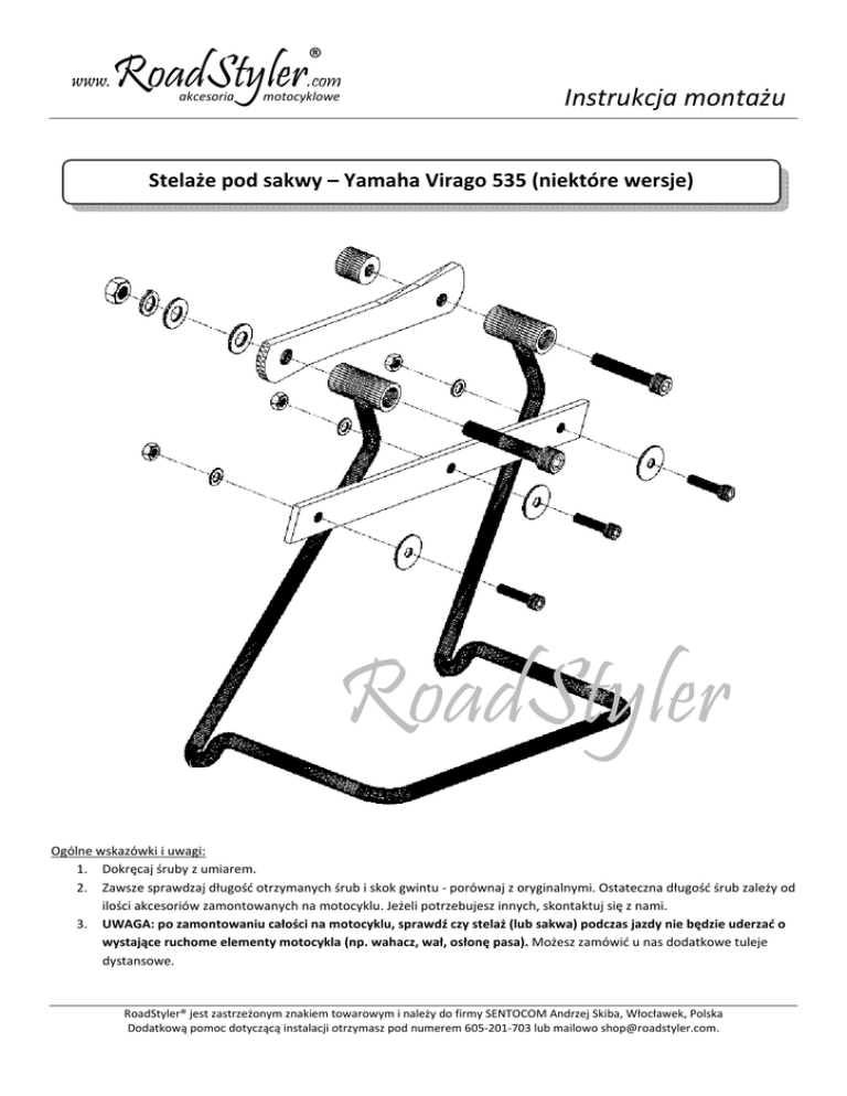 www. ® RoadStyler.com akcesoria motocyklowe Instrukcja montażu Stelaże pod sakwy – Yamaha Virago 535 (niektóre wersje) RoadStyler Ogólne wskazówki i uwagi: 1. Dokręcaj śruby z umiarem. 2. Zawsze sprawdzaj długość otrzymanych śrub i skok gwintu - porównaj z oryginalnymi. Ostateczna długość śrub zależy od ilości akcesoriów zamontowanych na motocyklu. Jeżeli potrzebujesz innych, skontaktuj się z nami. 3. UWAGA: po zamontowaniu całości na motocyklu, sprawdź czy stelaż (lub sakwa) podczas jazdy nie będzie uderzać o wystające ruchome elementy motocykla (np. wahacz, wał, osłonę pasa). Możesz zamówić u nas dodatkowe tuleje dystansowe. RoadStyler® jest zastrzeżonym znakiem towarowym i należy do firmy SENTOCOM Andrzej Skiba, Włocławek, Polska Dodatkową pomoc dotyczącą instalacji otrzymasz pod numerem 605-201-703 lub mailowo [email protected].