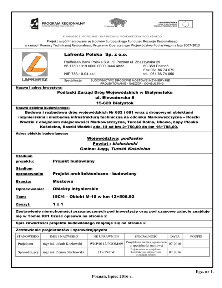 Projekt współfinansowany ze środków Europejskiego Funduszu Rozwoju Regionalnego w ramach Pomocy Technicznej Regionalnego Programu Operacyjnego Województwa Podlaskiego na lata 2007-2013 Lafrentz Polska Sp. z o.o. Raiffeisen Bank Polska S.A. /O Poznań ul. Zbąszyńska 29 56 1750 1019 0000 0000 0444 4833 60-359 Poznań Fax 061 86 74 079 NIP 783-10-04-441 tel. 061 86 74 050 Nazwa i adres Inwestora: Specjalizacja BUDOWNICTWO DROGOWE MOSTOWE INŻYNIERYJNE PROJEKTOWANIE - NADZÓR - CONSULTING Podlaski Zarząd Dróg Wojewódzkich w Białymstoku ul. Elewatorska 6 15-620 Białystok Nazwa obiektu budowlanego: Budowa i rozbudowa dróg wojewódzkich Nr 682 i 681 wraz z drogowymi obiektami inżynierskimi i niezbędną infrastrukturą techniczną na odcinku Markowszczyzna – Roszki Wodźki z obejściem miejscowości Markowszczyzna, Turośń Dolna, Uhowo, Łapy Płonka Kościelna, Roszki Wodźki odc. III od km 2+750,00 do km 16+788,00. Adres obiektu budowlanego: Stadium Województwo: podlaskie Powiat : białostocki Gmina: Łapy, Turośń Kościelna projektu: Projekt budowlany opracowania: Projekt architektoniczno - budowlany Opracowanie: Obiekty inżynierskie Stadium Branża: Tom: Zeszyt: Mostowa IIIC/4 – Obiekt M-10 w km 12+506.92 1z1 Zestawienie nieruchomości przeznaczonych pod inwestycję oraz pod czasowe zajęcie znajduje się w Tomie IC/1 Część opisowa na stronie 2 Spis zawartości projektu budowlanego znajduje się na stronie 2 Zestawienie projektantów i sprawdzających: STANOWISKO IMIĘ I NAZWISKO NR UPRAWNIEŃ Projektant mgr inż. Jakub Kozłowski WKP/0112/POOM/09 Sprawdzający mgr inż. Zenon Stachowski 119/79/PW SPECJALNOŚĆ DATA Projektowanie w specjalności konstrukcyjno-inżynieryjnej w zakresie mostów 07.2016 Projektowanie bez ograniczeń 07.2016 w specjalności mostowej Poznań, lipiec 2016 r. PODPIS Egz. nr 1. Spis zawartości projektu budowlanego PROJEKT ZAGOSPODAROWANIA TERENU TOM IA/1 Część opisowa Zeszyt 1 TOM IA/2 Część rysunkowa Zeszyt 1 PROJEKT ARCHITEKTONICZNO - BUDOWLANY TOM IIA TOM IIA/1 Część opisowa Roboty drogowe TOM IIA/2 Część rysunkowa Zeszyt 1 Zeszyt 1 Rys nr 3. Plan sytuacyjny skala 1:500 Rys nr 4. Przekroje podłużne skala 1:100/ 1:1000 Zeszyt 2 TOM IIIA Rys nr 5. Przekroje normalne Obiekty inżynierskie TOM IIIA/1 Obiekt M-1 w km 0+881.92 TOM IIIA/2 Obiekt M-2 w km 1+091.00 TOM IIIA/3 Przepusty pod trasą zasadniczą TOM IIIA/4 Przepusty pod drogami poprzecznymi TOM IIIA/5 Przepusty pod drogami dojazdowymi skala 1:50 Zeszyt 1 Zeszyt 1 Zeszyt 1 Zeszyt 1 Zeszyt 1 TOM IVA Budowa kanalizacji deszczowej, przebudowa kanalizacji sanitarnej oraz sieci wodociągowej TOM VA Przebudowa sieci gazowej TOM VIA Budowa oświetlenie drogowego i przebudowa kolizji elektrycznych TOM VIIA Budowa kanalizacji teletechnicznej i przebudowa urządzeń telekomunikacyjnych TOM VIIIA Przebudowa urządzeń melioracyjnych TOM IX/1A Opracowanie gospodarki zielenią – Nasadzenia zieleni TOM IX/2A Opracowanie gospodarki zielenią – Plan wycinki Zeszyt 1 Zeszyt 1 Zeszyt 1 Zeszyt 1 Zeszyt 1 Zeszyt 1 Zeszyt 1 OPIS TECHNICZNY 1. Tytuł opracowania 2. Zamawiający 3. Podstawa opracowania 4. Podstawa prawna, wykorzystane normy: Budowa i rozbudowa dróg wojewódzkich Nr 682 i 681 wraz z drogowymi obiektami inżynierskimi i niezbędną infrastrukturą techniczną na odcinku Markowszczyzna – Roszki Wodźki wraz z obejściem miejscowości Markowszczyzna, Turośń Dolna, Uhowo, Łapy, Płonka Kościelna, Roszki Wodźki odc. III od km 2+750,00 do km 16+788,00 - obiekt M-10. Podlaski Zarząd Dróg Wojewódzkich w Białymstoku ul. Elewatorska 6, 15-620 Białystok Dokumentacja geologiczno–inżynierska dla określenia warunków geologiczno - inżynierskich na potrzeby projektu mostowych obiektów inżynierskich w ramach inwestycji p.n.: Markowszczyzna – Roszki Wodźki – rozbudowa dróg wojewódzkich nr 682 i nr 681 wraz z drogowymi obiektami inżynierskimi i niezbędną infrastrukturą Inwentaryzacja geodezyjna istniejącego terenu Mapa sytuacyjno-wysokościowa w skali 1:500 do celów projektowych Projekt branży drogowej budowy i rozbudowy drogi wojewódzkiej nr 681 Projekty branżowe – przebudowa urządzeń obcych Specyfikacje Istotnych Warunków Zamówienia 5. Ustawa z dnia 7 lipca 1994 roku "Prawo budowlane" wraz z późniejszymi zmianami (tekst jednolity Dziennik Ustaw nr 207 z 2003 roku poz. 2016). "Rozporządzenie Ministra Transportu i Gospodarki Morskiej z dnia 2 marca 1999 roku w sprawie warunków technicznych, jakim powinny odpowiadać drogi publiczne i ich usytuowanie" zawarte w Dzienniku Ustaw Rzeczypospolitej Polskiej nr 43 z dnia 14 maja 1999 roku Rozporządzenie Ministra Transportu i Gospodarki Morskiej z dnia 30 maja 2000 roku "W sprawie warunków technicznych, jakim powinny odpowiadać drogowe obiekty inżynierskie i ich usytuowanie" Rozporządzenie Ministra Infrastruktury z dnia 1 kwietnia 2010 r zmieniające rozporządzenie w sprawie warunków technicznych jakim powinny odpowiadać drogowe obiekty inżynierskie i ich usytuowanie Rozporządzenie Ministra Transportu, Budownictwa i Gospodarki Morskiej z dnia 29 maja 2012 r zmieniające rozporządzenie w sprawie warunków technicznych jakim powinny odpowiadać drogowe obiekty inżynierskie i ich usytuowanie Rozporządzenie Ministra Transportu, Budownictwa i Gospodarki Morskiej z dnia 7 maja 2013 r zmieniające rozporządzenie w sprawie warunków technicznych jakim powinny odpowiadać drogowe obiekty inżynierskie i ich usytuowanie Rozporządzenie Ministra Infrastruktury i Rozwoju z dnia 27 czerwca 2014 r zmieniające rozporządzenie w sprawie warunków technicznych jakim powinny odpowiadać drogowe obiekty inżynierskie i ich usytuowanie Rozporządzenie Ministra Infrastruktury i Rozwoju z dnia 10 marca 2015 r zmieniające rozporządzenie w sprawie warunków technicznych jakim powinny odpowiadać drogowe obiekty inżynierskie i ich usytuowanie PN-85/S-10030. Obiekty mostowe. Obciążenia Cel opracowania Celem 