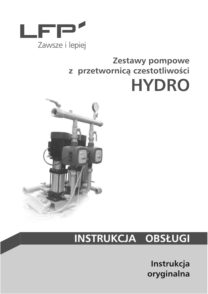 2 3 Spis treści. 1. Informacje dotyczące bezpieczeństwa. 5 1.1. Informacje ogólne 5 1.2. Uwagi i ostrzeżenia dotyczące bezpieczeństwa. 5 1.3. Kwalifikacje personelu. 5 2. Przeznaczenie i obszar użytkowania. 2.1. Dane techniczne. 3. Budowa zestawu. 6 6 6 3.1. Część pompowa. 6 3.2. Pompy. 8 3.3. Armatura. 8 3.4. Rama nośna. 9 3.5. Przetwornica PWM 230. 9 4. Zakres dostawy. 10 5. Klucz oznaczeń zestawu. 10 6. Zasady podłączenia i uruchomienia zestawu. 10 6.1. Warunki dla pomieszczeń. 10 6.2. Podłączenie hydrauliczne. 10 6.3. Podłączenie elektryczne. 11 6.3.1. Podłączenie zasilania do przetwornicy. 11 6.3.2. Podłączenie silnika pompy do przetwornicy 12 6.4. Uruchomienie zestawu. 12 6.5. Sterowanie. 12 6.5.1. Zasada działania. 13 6.5.2. Wprowadzanie nastaw do przetwornicy. 14 6.5.3. Opis parametrów pracy wyświetlanych na panelu przetwornicy 16 6.5.4. Nastawy użytkownika i wyświetlanie nastaw. 17 6.5.4.1. Wejścia dwustanowe definiowane. 17 6.5.4.2. Praca w systemie dwóch wartości zadanych. 18 6.5.4.3. Wyjścia dwustanowe. 19 7. Awarie. 21 8. Konserwacja. 21 8.1. Konserwacja pomp WR. 21 8.2. Konserwacja przetwornicy częstotliwości. 21 8.3. Części zamienne. 22 9. Serwis. 22 10. Przegląd zakłóceń. 22 11. Karta gwarancyjna. 24 4 1. INFORMACJE DOTYCZĄCE BEZPIECZEŃSTWA. 1.1. Informacje ogólne. W instrukcji obsługi zawarto istotne informacje dotyczące bezpiecznego instalowania i użytkowania wyrobu. Przed podjęciem czynności związanych z zainstalowaniem, uruchomieniem i użytkowaniem należy dokładnie przeczytać niniejszą instrukcję obsługi. Instrukcję należy zachować do przyszłego użytku w miejscu dostępnym przez obsługę. 1.2. Uwagi i ostrzeżenia dotyczące bezpieczeństwa. Instrukcja obsługi zaopatrzona jest w uwagi i ostrzeżenia dotyczące bezpieczeństwa. Znak umieszczono obok zaleceń zawartych w instrukcji, których nieprzestrzeganie może wpływać na bezpieczeństwo. Znak UWAGA umieszczono obok zaleceń zawartych w instrukcji, które należy wziąć pod uwagę ze względu na bezpieczną pracę urządzenia. W celu zapewnienia bezpieczeństwa podczas montażu, obsługi i eksploatacji należy: - stosować urządzenie zgodnie z przeznaczeniem, - nie stosować zestawu w otoczeniu zagrożonym wybuchem gazu, - podczas wykonywania prac w komorach i zbiornikach nigdy nie pracować w pojedynkę, - wykluczyć zagrożenie porażenia prądem elektrycznym, - przed przystąpieniem do wykonywania prac przy urządzeniach mogących znajdować się pod napięciem odłączyć zasilanie elektryczne przez spowodowanie widocznej przerwy, - nie zbliżać rąk do wlotu pompy i innych przedmiotów jeżeli pompa jest podłączona do zasilania elektrycznego, - przed odłączeniem przewodów silnika sprawdzić bezwzględnie, czy jest on odłączony od zasilania, a następnie odłączyć najpierw przewód fazowy a następnie przewód ochronny, - stosować przy wymianie i naprawie wyłącznie oryginalne części zamienne. Nieprzestrzeganie tego zalecenia zwalnia producenta z odpowiedzialności za jakiekolwiek skutki mogące powstać z zastosowania innych części, - po zakończeniu prac ponownie zamontować lub załączyć wszelkie urządzenia ochronne i zabezpieczające. 1.3. Kwalifikacje personelu. Prace związane z montażem, podłączeniem do sieci elektrycznej, obsługą, konserwacją i przeglądem powinien wykonywać wykwalifikowany personel, posiadający odpowiednie uprawnienia. 5 2. Przeznaczenie i obszar użytkowania. Zestaw przeznaczony jest do tłoczenia wody czystej nieagresywnej chemicznie o pH = 6 – 8 i do podwyższania ciśnienia w instalacjach. Może być zasilany bezpośrednio z sieci wodociągowej lub też ze zbiornika otwartego przy zachowaniu napływu wody na zestaw odpowiednio do zastosowanych pomp. Zabezpieczenie przed suchobiegiem realizowane jest bezpośrednio przez przetwornicę częstotliwości. Główne obszary użytkowania: budynki mieszkalne, budynki użyteczności publicznej, instalacje przemysłowe, 2.1. Dane techniczne. HYDRO.….. 1 Typ zestawu Liczba pomp 1 HYDRO…… 2 2 HYDRO…… 3 3 Wys. podnoszenia do 87 m do 87 m do 87 m Max. ciś. robocze 1,0 MPa 1,0 MPa 1,0 MPa do 12 m3/h do 24 m3/h do 36 m3/h Wydajność Zakres temperatury do 35 oC do 35 oC do 35 oC Temperatura otoczenia max.40 oC max.40 oC max.40 oC Obroty silnika 2900 min-1 2900 min-1 2900 min-1 Średnica przyłączy - ssanie 25 ÷ 32 mm 25 ÷ 32 mm 25 ÷ 40 mm 40 ÷ 50 mm 50 ÷ 65 mm - tłoczenie 40 mm 3. Budowa zestawu. Zestaw pompowy HYDRO składa się z jednej lub dwóch pomp, kolektorów, ramy wsporczej i sterowania. Sterowanie pompami odbywa się poprzez przetwornice częstotliwości. Szczegółowy opis budowy, zasady działania oraz sterowania znajduje się w dalszej części instrukcji obsługi. 3.1. Część pompowa. Część pompowa zestawu HYDRO to jedna lub dwie pompy z kolektorem tłocznym dla wykonania jednopompowego i ssąco tłocznym dla wykonania dwu pompowego oraz armaturą zwrotną i odcinającą. Pompy ( lub pompa ) znajdują się na ramie nośnej wykonanej ze stali nierdzewnej. Zestaw przy zastosowaniu pomp typoszeregu WRN, których części stykające się z czynnikiem tłocznym wykonane są ze stali nierdzewnej, może być w całości wykonany ze stali nierdzewnej. Na kolektorze tłocznym każdej pompy umieszczona jest przetwornica częstotliwości i manometr do pomiaru ciśnienia . Rysunki 1 i 2 przedstawiają budowę zestawów jedno i dwu-pompowych HYDRO. 6 1. 2. 3. 4. 5. 6. 7. 8. Pompa Rama Zawór zwrotny Zawór kulowy Manometr Kolektor tłoczny Przetwornica częstotliwości Kolektor ssący Rysunek 1. Zestaw HYDRO……1. Rysunek 2. Zestaw HYDRO…… 2. 5 6 4 7 3 1 8 2 Rysunek 3. Zestaw HYDRO…… 3 7 3.2. Pompy. W skład zestawu HYDRO wchodzą pompy wirowe typoszeregu WR. Pompa typoszeregu WR jest normalnie ssącą pionową wielostopniową pompą odśrodkową wyposażoną w standardowy silnik. Pompa posiada nie wymagające konserwacj