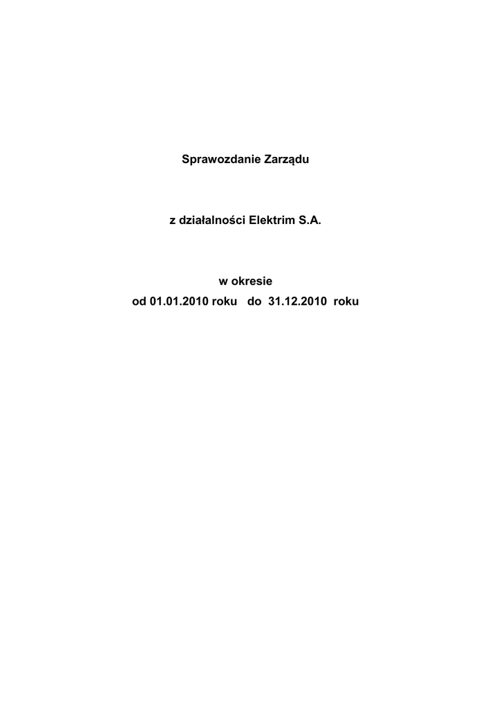 Sprawozdanie Zarządu z działalności Elektrim S.A. w okresie od 01.01.2010 roku do 31.12.2010 roku Sprawozdanie Zarządu 1. Wprowadzenie Spółka Elektrim S.A. („Spółka”) powstała w wyniku prywatyzacji dawnego PTHZ Elektrim. W pierwszym okresie po prywatyzacji, Spółka prowadziła działalność za pośrednictwem ponad 140 spółek reprezentujących różne branże. Od 1999 roku struktura holdingu została gruntownie zreorganizowana W Grupie Elektrim pozostały spółki z branży energetycznej i telekomunikacyjnej. Od drugiej połowy 2001 roku działalność holdingu skoncentrowała się na sektorze energetycznym, co było spowodowane pogarszającą się sytuacją na rynkach telekomunikacyjnych oraz w branży IT, jak też kondycją finansową Elektrimu. Restrukturyzacja i pomyślne wdrożenie nowej strategii zostały w istotny sposób zakłócone przez szereg niekorzystnych dla Elektrimu okoliczności i wydarzeń, spowodowanych zarówno błędnymi decyzjami kolejnych zarządów w okresie 2001-2002, jak również okolicznościami, na które w dużej części Spółka była pozbawiona wpływu. W dniu 21 sierpnia 2007 r. Sąd Rejonowy dla m.st. Warszawy, Sąd Gospodarczy, X Wydział Gospodarczy dla spraw upadłościowych i naprawczych wydał postanowienie o ogłoszeniu upadłości spółki Elektrim S.A. z możliwością zawarcia układu. Złożenie przez Zarząd wniosku o ogłoszenie upadłości wynikało z wielu przyczyn. Majątek Elektrim SA niemal w całości zabezpieczony był na rzecz Obligatariuszy obligacji wyemitowanych przez Elektrim Finance BV a gwarantowanych przez Elektrim S.A.. Zabezpieczenia te, tak jak i szereg innych rozwiązań, zostały wprowadzone w wyniku zmiany Umowy Powierniczej i Warunków Obligacji w listopadzie 2002 roku przez nałożenie na Elektrim wyłącznie zobowiązań i nadanie uprawnień jedynie Obligatariuszom. Chociaż w 2006 roku Spółka jednorazowo spłaciła kwotę 525 mln EURO z tytułu kwoty głównej wraz z odsetkami, to spłata ta nie spowodowała umorzenia obligacji ani zwolnienia jakiegokolwiek zabezpieczenia ustanowionego na majątku Elektrim S.A.. Dodatkowo, w czerwcu 2007 roku okazało się, że zachodzi konieczność kolejnej płatności na rzecz Obligatariuszy w wysokości około 40 mln EURO. Zobowiązanie to wynikało ze zwłoki Powiernika w przekazaniu Obligatariuszom wyżej wymienionych i zapłaconych wcześniej przez Spółkę kwot. Majątek Elektrimu był również obciążony zabezpieczeniami na rzecz Vivendi SA, które wraz z jej spółką zależną Elektrim Telekomunikacja Sp. z o.o. (ET) mnożyło nieuzasadnione roszczenia wobec Elektrimu , choć to ET i Vivendi nie podporządkowały się wyrokowi Trybunału Arbitrażowego w Wiedniu z dnia 26 listopada 2004 roku. Działania te podejmowane kosztem innych podmiotów i ze szkodą dla wykonywania przez Elektrim zobowiązań wobec osób trzecich, w tym spółek zależnych, spowodowały, iż Elektrim został uwikłany przez Vivendi i ET w kilkadziesiąt sporów sądowych i arbitrażowych toczących się w Polsce i za granicą W dniu 17 grudnia 2010 r. Sąd Rejonowy dla m.st. Warszawy, na wniosek wszystkich wierzycieli Elektrimu, wpisanych na listę wierzytelności lub ubiegających się o wpisanie na tę listę, wydał postanowienie o umorzeniu postępowania upadłościowego prowadzonego wobec Elektrim S.A. Postanowienie to uprawomocniło się z dniem 31 grudnia 2010 r. Spółka Elektrim S.A. notowana była od 1992 roku do 2007 roku na Giełdzie Papierów Wartościowych w Warszawie. W związku z ogłoszeniem upadłości, Zarząd Elektrim S.A. złożył do Zarządu Giełdy Papierów Wartościowych w Warszawie S.A. wniosek o wykluczenie akcji Elektrim z obrotu giełdowego. W dniu 5 listopada 2007 r. Zarząd Giełdy Papierów Wartościowych w Warszawie SA podjął uchwalę w sprawie wykluczenia z obrotu giełdowego akcji Elektrim S.A., ale Elektrim pozostał spółką publiczną w rozumieniu ustawy o ofercie publicznej i warunkach wprowadzania instrumentów finansowych do zorganizowanego systemu obrotu oraz o spółkach publicznych . 1 Sprawozdanie Zarządu 2. Wykaz akcjonariuszy Spółki na dzień 31.12.2010 r. posiadających, bezpośrednio lub pośrednio przez podmioty zależne, co najmniej 5% w ogólnej liczbie głosów na Walnym Zgromadzeniu Elektrim S.A. * Akcjonariusze Ilość posiadanych akcji Udział procentowy 65 691 802 78, 42 POLARIS FINANCE B.V *Według informacji przekazanej przez akcjonariuszy 3. Zmiany w strukturze akcjonariatu Elektrim S.A., jakie nastąpiły w roku 2010 Zgodnie z informacjami przekazanymi Elektrim S.A. przez jego akcjonariuszy, w 2010 roku nastąpiły zmiany w składzie akcjonariatu Spółki. Spółka otrzymała następujące zawiadomienia: 1. Spółka Polsat Media B.V. z siedzibą w Amsterdamie w wyniku obowiązków informacyjnych wynikających z art. 69 Ustawy z dnia 29 lipca 2005r. (Dz.U. z 2009r., Nr 185 poz. 1439 ze zm.) o ofercie publicznej i warunkach wprowadzania instrumentów finansowych do zorganizowanego systemu obrotu oraz o spółkach publicznych, zawiadomiła, iż w dniu 11 sierpnia 2010r. zbyła 31.861.697 (trzydzieści jeden milionów osiemset sześćdziesiąt jeden tysięcy sześćset dziewięćdziesiąt siedem) akcji spółki Elektrim S.A. z siedzibą w Warszawie, co stanowiło 38,03% kapitału zakładowego Elektrim S.A.. Akcje uprawniały do 31.861.697 głosów na walnym zgromadzeniu Elektrim S.A., co stanowiło 38,03% ogólnej liczby głosów na walnym zgromadzeniu Spółki. Polsat Media B.V. zawiadomił, że po zbyciu o którym mowa powyżej aktualnie nie posiada akcji Elektrim S.A. 2. Spółka Polaris Finance B.V. z siedzibą w Amsterdamie w wyniku obowiązków informacyjnych wynikających z art. 69 Ustawy z dnia 29 lipca 2005r. (Dz.U. z 2009r., Nr 185 poz. 1439 ze zm.) o ofercie publicznej i warunkach wprowadzania instrumentów finansowych do zorganizowanego systemu obrotu oraz o spółkach publicznych zawiadomiła, iż w dni