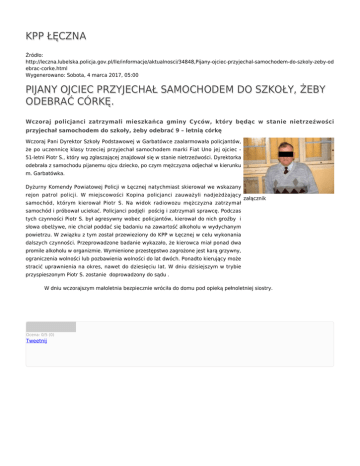 KPP ŁĘCZNA Źródło: http://leczna.lubelska.policja.gov.pl/lle/informacje/aktualnosci/34848,Pijany-ojciec-przyjechal-samochodem-do-szkoly-zeby-od ebrac-corke.html Wygenerowano: Sobota, 4 marca 2017, 05:00 PIJANY OJCIEC PRZYJECHAŁ SAMOCHODEM DO SZKOŁY, ŻEBY ODEBRAĆ CÓRKĘ. Wczoraj policjanci zatrzymali mieszkańca gminy Cyców, który będąc w stanie nietrzeźwości przyjechał samochodem do szkoły, żeby odebrać 9 – letnią córkę Wczoraj Pani Dyrektor Szkoły Podstawowej w Garbatówce zaalarmowała policjantów, że po uczennicę klasy trzeciej przyjechał samochodem marki Fiat Uno jej ojciec 51-letni Piotr S., który wg zgłaszającej znajdował się w stanie nietrzeźwości. Dyrektorka odebrała z samochodu pijanemu ojcu dziecko, po czym mężczyzna odjechał w kierunku m. Garbatówka. Dyżurny Komendy Powiatowej Policji w Łęcznej natychmiast skierował we wskazany rejon patrol policji. W miejscowości Kopina policjanci zauważyli nadjeżdżający samochód, którym kierował Piotr S. Na widok radiowozu mężczyzna zatrzymał załącznik samochód i próbował uciekać. Policjanci podjęli pościg i zatrzymali sprawcę. Podczas tych czynności Piotr S. był agresywny wobec policjantów, kierował do nich groźby i słowa obelżywe, nie chciał poddać się badaniu na zawartość alkoholu w wydychanym powietrzu. W związku z tym został przewieziony do KPP w Łęcznej w celu wykonania dalszych czynności. Przeprowadzone badanie wykazało, że kierowca miał ponad dwa promile alkoholu w organizmie. Wymienione przestępstwo zagrożone jest karą grzywny, ograniczenia wolności lub pozbawienia wolności do lat dwóch. Ponadto kierujący może stracić uprawnienia na okres, nawet do dziesięciu lat. W dniu dzisiejszym w trybie przyspieszonym Piotr S. zostanie doprowadzony do sądu . W dniu wczorajszym małoletnia bezpiecznie wróciła do domu pod opieką pełnoletniej siostry. Ocena: 0/5 (0) Tweetnij