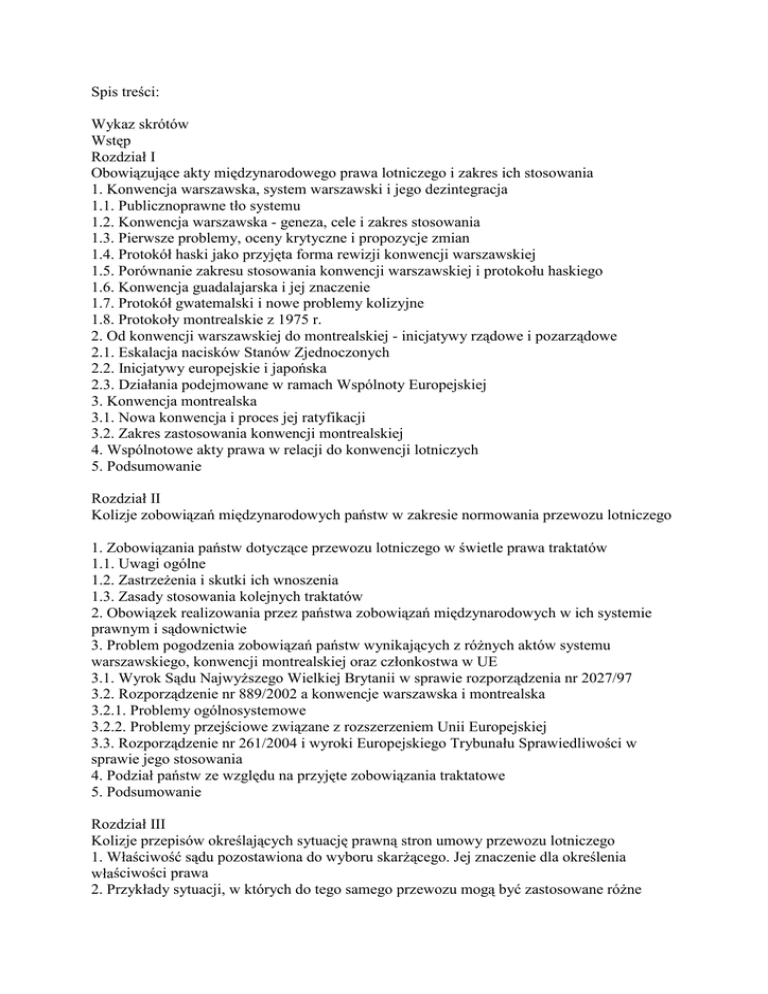 Spis treści: Wykaz skrótów Wstęp Rozdział I Obowiązujące akty międzynarodowego prawa lotniczego i zakres ich stosowania 1. Konwencja warszawska, system warszawski i jego dezintegracja 1.1. Publicznoprawne tło systemu 1.2. Konwencja warszawska - geneza, cele i zakres stosowania 1.3. Pierwsze problemy, oceny krytyczne i propozycje zmian 1.4. Protokół haski jako przyjęta forma rewizji konwencji warszawskiej 1.5. Porównanie zakresu stosowania konwencji warszawskiej i protokołu haskiego 1.6. Konwencja guadalajarska i jej znaczenie 1.7. Protokół gwatemalski i nowe problemy kolizyjne 1.8. Protokoły montrealskie z 1975 r. 2. Od konwencji warszawskiej do montrealskiej - inicjatywy rządowe i pozarządowe 2.1. Eskalacja nacisków Stanów Zjednoczonych 2.2. Inicjatywy europejskie i japońska 2.3. Działania podejmowane w ramach Wspólnoty Europejskiej 3. Konwencja montrealska 3.1. Nowa konwencja i proces jej ratyfikacji 3.2. Zakres zastosowania konwencji montrealskiej 4. Wspólnotowe akty prawa w relacji do konwencji lotniczych 5. Podsumowanie Rozdział II Kolizje zobowiązań międzynarodowych państw w zakresie normowania przewozu lotniczego 1. Zobowiązania państw dotyczące przewozu lotniczego w świetle prawa traktatów 1.1. Uwagi ogólne 1.2. ZastrzeŜenia i skutki ich wnoszenia 1.3. Zasady stosowania kolejnych traktatów 2. Obowiązek realizowania przez państwa zobowiązań międzynarodowych w ich systemie prawnym i sądownictwie 3. Problem pogodzenia zobowiązań państw wynikających z róŜnych aktów systemu warszawskiego, konwencji montrealskiej oraz członkostwa w UE 3.1. Wyrok Sądu NajwyŜszego Wielkiej Brytanii w sprawie rozporządzenia nr 2027/97 3.2. Rozporządzenie nr 889/2002 a konwencje warszawska i montrealska 3.2.1. Problemy ogólnosystemowe 3.2.2. Problemy przejściowe związane z rozszerzeniem Unii Europejskiej 3.3. Rozporządzenie nr 261/2004 i wyroki Europejskiego Trybunału Sprawiedliwości w sprawie jego stosowania 4. Podział państw ze względu na przyjęte zobowiązania traktatowe 5. Podsumowanie Rozdział III Kolizje przepisów określających sytuację prawną stron umowy przewozu lotniczego 1. Właściwość sądu pozostawiona do wyboru skarŜącego. Jej znaczenie dla określenia właściwości prawa 2. Przykłady sytuacji, w których do tego samego przewozu mogą być zastosowane róŜne systemy prawa 3. ZróŜnicowanie systemów prawa w zaleŜności od umownej trasy przewozu oraz od statusu przewoźnika 3.1. ZaleŜność od umownej trasy przewozu 3.2. Dodatkowe zróŜnicowanie - według statusu przewoźnika 4. Zestawienie czynników mogących decydować o zastosowanym systemie prawa i reŜimie odpowiedzialności przewoźnika 4.1. Czynniki decydujące według zobowiązań międzynarodowych (w tym wspólnotowych) 4.2. Czynniki mogące dodatkowo decydować o zastosowanym reŜimie odpowiedzialności przewoźnika 5. Obowiązek informowania o obowiązujących prawach 6. Podsumowanie Rozdział IV Działania przewoźników lotniczych wobec dezintegracji systemu i kolizji praw 1. Przyjęcie jednostronnych zobowiązań omijających kolizje praw 1.1. Porozumienie montrealskie z 1966 r. 1.2. Umowy IATA - MIA, IIA i IPA 2. Problemy kolizyjne związane z umowami dotyczącymi podziału kodów lotniczych 3. Ogólne warunki przewozu - regulaminy i ogólne warunki umów 3.1. Uwagi ogólne 3.2. Znaczenie prawne ogólnych warunków (regulaminów) 3.3. Zalecenia IATA dotyczące ogólnych warunków przewozu 3.4. Odrębne pojęcie - ogólne warunki umów 3.5. Szczególne problemy dotyczące stosowania ogólnych warunków przewozu (regulaminów) i warunków umów 4. Podsumowanie Rozdział V Rozwiązania typu ubezpieczeniowego 1. Ubezpieczenia lotnicze 2. Projekty systemów quasi-ubezpieczeniowych 3. Podsumowanie Rozdział VI Problemy kolizyjne na gruncie prawa polskiego 1. Prawo polskie - rozszerzenie zasad stosowania prawa międzynarodowego 2. Regulaminy przewoźników działających w Polsce 3. Podsumowanie Wnioski końcowe Bibliografia Źródła prawa i dokumenty