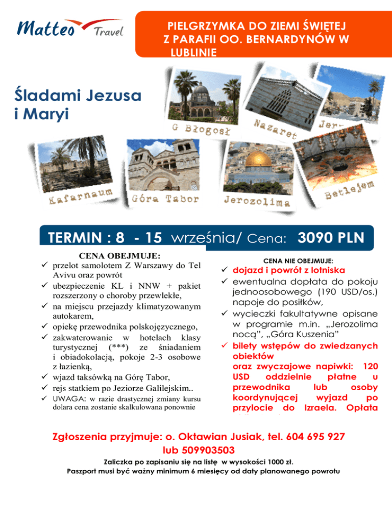PIELGRZYMKA DO ZIEMI ŚWIĘTEJ Z PARAFII OO. BERNARDYNÓW W LUBLINIE Śladami Jezusa i Maryi TERMIN : 8 - 15 września/ Cena: 3090 PLN CENA OBEJMUJE: przelot samolotem Z Warszawy do Tel Avivu oraz powrót ubezpieczenie KL i NNW + pakiet rozszerzony o choroby przewlekłe, na miejscu przejazdy klimatyzowanym autokarem, opiekę przewodnika polskojęzycznego, zakwaterowanie w hotelach klasy turystycznej (***) ze śniadaniem i obiadokolacją, pokoje 2-3 osobowe z łazienką, wjazd taksówką na Górę Tabor, rejs statkiem po Jeziorze Galilejskim.. UWAGA: w razie drastycznej zmiany kursu dolara cena zostanie skalkulowana ponownie CENA NIE OBEJMUJE: dojazd i powrót z lotniska ewentualna dopłata do pokoju jednoosobowego (190 USD/os.) napoje do posiłków, wycieczki fakultatywne opisane w programie m.in. „Jerozolima nocą”, „Góra Kuszenia” bilety wstępów do zwiedzanych obiektów oraz zwyczajowe napiwki: 120 USD oddzielnie płatne u przewodnika lub osoby koordynującej wyjazd po przylocie do Izraela. Opłata obligatoryjna Zgłoszenia przyjmuje: o. Oktawian Jusiak, tel. 604 695 927 lub 509903503 Zaliczka po zapisaniu się na listę w wysokości 1000 zł. Paszport musi być ważny minimum 6 miesięcy od daty planowanego powrotu PIELGRZYMKA ŚLADAMI JEZUSA I MARYI SAMOLOTOWO – AUTOKAROWA PIELGRZYMKA DO ZIEMI ŚWIĘTEJ – IZRAELA 1. 2. 3. 4. 5. 6. 7. 8. DZIEŃ: Wyjazd z Lublina z parkingu pod kościołem oo. Bernardynów. Wylot z Warszawy o ….. i przelot do Tel Avivu. Przylot ok …… i przejazd do hotelu w Nazarecie na obiadokolację i nocleg. DZIEŃ: TABHA, KAFARNAUM G. BŁOGOSŁAWIEŃSTW, NAZARET. Śniadanie. Przejazd dookoła Jeziora Galilejskiego: Góra Błogosławieństw, Tabha - miejsce cudownego rozmnożenia ryb i chleba oraz miejsce prymatu Piotra, Kafarnaum: Dom Piotra i stara synagoga, rejs po Jeziorze Galilejskim z modlitwą, śpiewaniem i tańcami. Dla chętnych możliwość degustacji ryby św. Piotra (ok. 20 USD/os). Zwiedzanie Nazaretu: Bazylika Zwiastowania i dom św. Józefa, gdzie mieszkała Święta Rodzina. Obiadokolacja i nocleg w Nazarecie. DZIEŃ: KANA, G. TABOR, HAJFA, CEZAREA Śniadanie. Przejazd do Kany Galilejskiej, gdzie Jezus przemienił wodę w wino: dla chętnych możliwość odnowienia przyrzeczeń małżeńskich oraz zakupu wina. Następnie wjazd taksówkami wieloosobowymi (tzw. szerut taxi) na górę Tabor. Następnie Hajfa: kościół Stella Maris, klasztor Karmelitański, panorama na ogrody Bahajskie i zatokę Hajfa. Przejazd do Cezarei Nadmorskiej: akwedukt z czasów rzymskich. Obiadokolacja i nocleg w Betlejem. DZIEŃ: BETLEJEM, EIN KAREM, YAD VASHEM. Śniadanie. Zwiedzanie Betlejem - Bazylika Narodzenia Pana Jezusa. Kościół ten powstał w miejscu narodzenia Jezusa i jest najstarszym czynnym kościołem na świecie, Grota Mleczna, Grota św. Hieronima w kościele św. Katarzyny. Pole Pasterzy - gdzie aniołowie obwieścili pasterzom narodzenie Chrystusa. Przejazd do Ein Karem (kościół Nawiedzenia św. Elżbiety i Narodzenia św. Jana Chrzciciela). Muzeum Holokaustu: Yad Vashem. Obiadokolacja i nocleg. DZIEŃ: JEROZOLIMA: G. OLIWNA, G. SYJON. Śniadanie. Wyjazd autokarem na Górę Oliwną panoramiczny widok na Wzgórze Świątynne oraz mury Starego Miasta. Następnie zwiedzanie kościoła Pater Noster - Ojcze Nasz, Kościół Dominus Flevit (Pan zapłakał), Ogród Oliwny – Getsemani i Bazylika Męki Pańskiej, kościół grobu Maryi. Góra Syjon – Bazylika Zaśnięcia Najświętszej Maryi Panny, Wieczernik oraz grób króla Dawida. Kościół In Galicantu. Obiadokolacja i nocleg w Betlejem. Dla chętnych zwiedzanie „Jerozolimy nocą” (ok. 25 USD/os). DZIEŃ: WADI QELT, JERYCHO, MORZE MARTWE, QUMRAN, KACAR EL JAHUD. Śniadanie. Przejazd do Betanii – kościół i grobowiec Łazarza, dalej Przejazd do kanionu Wadi Qelt (panorama), Jerycho (najstarsze miasto świata) - krótki postój pod Qarantal - Góra Kuszenia Jezusa oraz zdjęcia pod drzewem Sykomora. Dla chętnych możliwość wjazdu na Górę Kuszenia kolejką linową do Klasztoru Kuszenia (15 USD/os). Plażowanie i kąpiel w Morzu Martwym na prywatnej plaży (największa depresja na świecie – 417 m ppm). Zwiedzanie Qumran – panorama na groty, gdzie znaleziono słynne zwoje Pisma Świętego. Możliwość odnowienia chrztu dla Pielgrzymów w rzece Jordan – Kacar El Jahud – prawdziwe miejsce chrztu Pana Jezusa. Obiadokolacja i nocleg w Betlejem. DZIEŃ: JEROZOLIMA: DROGA KRZYŻOWA . Śniadanie. Wyjazd do Jerozolimy. Przejście przez bramę Św. Szczepana, Kościół św. Anny i sadzawka Betesda, Droga Krzyżowa (nabożeństwo) od miejsca skazania Jezusa - Via Dolorosa - do Golgoty i Bazyliki Grobu Pańskiego. Czas na osobistą modlitwę. Zwiedzanie Kotel Maarawi (Ściana Płaczu). Obiadokolacja i nocleg w Betlejem. DZIEŃ: TEL AVIV – LUBLIN. Śniadanie. Przejazd na lotnisko i odlot do kraju. Przylot do Polski powrót do Lublina specjalnym autokarem