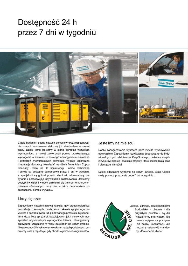 Dost´pnoÊç 24 h przez 7 dni w tygodniu Ciàgłe badanie i ocena nowych pomysłów oraz rozpoznawanie nowych zastosowaƒ stało si´ ju˝ standardem w naszej pracy. Dzi´ki temu jesteÊmy w stanie sprostaç wszystkim wymaganiom, a nawet zaoferowaç pomoc przekraczajàcà wymagania w zakresie czasowego udost´pniania rozwiàzaƒ i urzàdzeƒ wytwarzajàcych powietrze. Wiedza techniczna i reputacja dostawcy rozwiàzaƒ wyró˝nia firm´ Atlas Copco Specialty Rental na tle konkurencji. Pomoc techniczna i serwis sà dost´pne całodobowo przez 7 dni w tygodniu, a specjaliÊci sà gotowi pomóc klientowi, odpowiadajàc na pytania i opracowujàc indywidualne zastosowania. JesteÊmy dost´pni w dzieƒ i w nocy, zajmiemy si´ transportem, uruchomieniem oferowanych urzàdzeƒ, a tak˝e demonta˝em po zakoƒczeniu okresu wynajmu. JesteÊmy na miejscu Nasze zaanga˝owanie wykracza poza zwykłe wykonywanie obowiàzków. Zapewniamy rozwiàzania dopasowane do indywidualnych potrzeb klientów. Zespół naszych doÊwiadczonych in˝ynierów planuje i realizuje projekty, które oszcz´dzajà czas i pieniàdze klientów! Dzi´ki oddzia∏om wynajmu na ca∏ym Êwiecie, Atlas Copco słu˝y pomocà przez całà dob´ 7 dni w tygodniu. Liczy si´ czas Zapewniamy natychmiastowà reakcj´, gdy przedsi´biorstwa potrzebujà czasowych rozwiàzaƒ w zakresie spr´˝onego powietrza z powodu awarii lub planowanego przestoju. Dysponujemy du˝à flotà spr´˝arek bezolejowych jak i olejowych, aby sprostaç indywidualnym wymaganiom klienta. Udost´pniamy przewoêne urzàdzenia w wielu miejscach na całym Êwiecie. NiezawodnoÊç i b∏yskawiczna reakcja - na tych podstawach budujemy naszà reputacj´, gdy chodzi o jakoÊç obsługi klientów. JakoÊç, zdrowie, bezpieczeƒstwo i Êrodowisko - obecnie i dla przyszłych pokoleƒ - sà dla naszej firmy priorytetem. Nie mamy wpływu na poczynania naszej konkurencji, ale mo˝emy ustanowiç standardy, które ocenià klienci. OgólnoÊwiatowa sieç wynajmu Biura wynajmu: Gdaƒsk 80-297 Miszewko k/ Gdaƒska ul. S∏oneczna 4 tel. (058) 320 71 94 fax (058) 306 30 94 tel. kom. 510 025 784 Najwy˝sze Standardy Dywizja Specialty Rental spełniła wszystkie wymagania i została potrójnie certyfikowana w zakresie JakoÊci - ISO 9001:2000, Ochrony Ârodowiska - ISO 14001:2004 oraz Bezpieczeƒstwa i Higieny Pracy - OHSAS 18001 przez Lloyd’s Register Quality Assurance (LRQA). Potrójna certyfikacja potwierdza nasze zaanga˝owanie w najwy˝szà jakoÊç dostarczanych usług, naszà dbałoÊç o Êrodowisko naturalne oraz zdrowie naszych pracowników i klientów. www.atlascopco.pl Katowice 40-173 Katowice ul. Katowicka 32 tel. (032) 608 90 30/31 fax (032) 608 90 29 tel. kom. 510 025 782 Warszawa 05-090 Raszyn, S´kocin Nowy Al. Krakowska 61 A tel. (022) 572 68 00/22 fax (022) 572 68 09 tel. kom. 510 025 780 Atlas Copco Wynajem dla przemys∏u Powietrze w 100% bezolejowe W przemyÊle farmaceutycznym, spo˝ywczym, przy produkcji precyzyjnych urzàdzeƒ elektronicznych, a tak˝e w wielu innych podobnych gał´ziach nie ma miejsca na ryzyko zwiàzane z zanieczyszczeniem olejem w wytwarzanym powietrzu. Gdy chodzi o czyste, ca∏kowicie wolne od oleju, spr´˝one powietrze potrzebne do procesów o kluczowym znaczeniu, nie mo˝na sobie pozwoliç na kompromis. 100% czystoÊç powietrza to sprawa najwy˝szej wagi zarówno dla procesu wytwarzania, jak i produktów finalnych, od których zale˝y reputacja przedsi´biorstwa. Atlas Copco zapoczàtkowała rozwój bezolejowej technologii Êrubowej prawie szeÊçdziesiàt lat temu. Obecnie dla zastosowaƒ, w których jest wymagana 100 % czystoÊç powietrza, oferowana jest szeroka gama specjalnie zaprojektowanych bezolejowych spr´˝arek Êrubowych. Atlas Copco Specialty Rental oferuje doskonałe rozwiàzania dla firm, które w procesach produkcyjnych wymagajà czystego, suchego i całkowicie wolnego od oleju powietrza. W ramach Êwiadczonych usług w przypadku awarii lub planowanego przestoju firma Atlas Copco Specialty Rental mo˝e zapewniç szybkà instalacj´ sprawnych i niezawodnych urzàdzeƒ w celu zachowania ciàgłoÊci procesu produkcyjnego. Bezolejowe spr´˝arki Êrubowe zapewniajà powietrze pozbawione oleju, w przeciwieƒstwie do spr´˝arek z wtryskiem oleju wyposa˝onych w filtry sieciowe. Szeroka gama oferowanych urzàdzeƒ umo˝liwia zaproponowanie rozwiàzaƒ idealnie dopasowanych do specyficznych wymagaƒ przedsi´biorstw – oferujemy zarówno rozwiàzania jedno-, jak i wielospr´˝arkowe wraz ze wszystkimi potrzebnymi akcesoriami. Atlas Copco Specialty Rental ma ogromne doÊwiadczenie w wynajmie urzàdzeƒ wytwarzajàcych powietrze dla przemysłu. Nasze spr´˝arki i osuszacze dostarczajàce powietrze całkowicie bezolejowe i spełniajàce najwy˝sze normy, stanowià doskonałe rozwiàzanie, gdy wa˝na jest jakoÊç powietrza, które musi pozostaç czyste i wolne od zanieczyszczeƒ. Lider w technologii powietrza ca∏kowicie wolnego od oleju Atlas Copco było pierwszà firmà, która w 1957 roku wprowadziła na rynek spr´˝arki bezolejowe. Od tego czasu, poprzez nieustanne badania i rozwój, Atlas Copco utrzymuje pozycj´ Êwiatowego lidera w technologii bezolejowego wytwarzania spr´˝onego powietrza. Ostatnim osiàgni´ciem i kamieniem milowym stało si´ przyznanie firmie jako pierwszemu i jedynemu producentowi na Êwiecie certyfikatu potwierdzajàcego spełnianie kryteriów dotyczàcych czystoÊci spr´˝onego powietrza wg ISO 8573-1 KLASA 0. Jako lider na rynku technologii spr´˝onego powietrza całkowicie bezolejowego Atlas Copco wystàpiła do znanej na całym Êwiecie organizacji Technical Monitoring Association TÜV o przetestowanie bezolejowych spr´˝arek powietrza. Wytypowane zostały ró˝ne rodzaje spr´˝arek, a nast´pnie poddane zostały najbardziej rygorystycznym testom, w szerokim zakresie temperatur i ciÊnieƒ pracy. Spr´˝one przez nie powietrze poddano analizie na obecnoÊç wszelkich mo˝liwych form