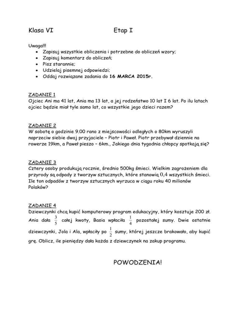 Klasa VI Etap I Uwaga!!! Zapisuj wszystkie obliczenia i potrzebne do obliczeń wzory; Zapisuj komentarz do obliczeń; Pisz starannie; Udzielaj pisemnej odpowiedzi; Oddaj rozwiązane zadania do 16 MARCA 2015r. ZADANIE 1 Ojciec Ani ma 41 lat, Ania ma 13 lat, a jej rodzeństwo 10 lat I 6 lat. Po ilu latach ojciec będzie miał tyle samo lat, co wszystkie jego dzieci razem? ZADANIE 2 W sobotę o godzinie 9.00 rano z miejscowości odległych o 80km wyruszyli naprzeciw siebie dwaj przyjaciele – Piotr i Paweł. Piotr przebywał dziennie na rowerze 19km, a Paweł pieszo – 6km., Jakiego dnia tygodnia chłopcy spotkają się? ZADANIE 3 Cztery osoby produkują rocznie, średnio 500kg śmieci. Wielkim zagrożeniem dla przyrody są odpady z tworzyw sztucznych, które stanowią 0,4 wszystkich śmieci. Ile ton odpadów z tworzyw sztucznych wyrzuca w ciągu roku 40 milionów Polaków? ZADANIE 4 Dziewczynki chcą kupić komputerowy program edukacyjny, który kosztuje 200 zł. 3 1 Ania dała całej kwoty, Basia wpłaciła pozostałej sumy. Dwie ostatnie 5 4 1 dziewczynki, Jola i Ala, wpłaciły po sumy, której jeszcze brakowało, aby kupić 2 grę. Oblicz, ile pieniędzy dała każda z dziewczynek na zakup programu. POWODZENIA! Klasa V Etap I Uwaga!!! Zapisuj wszystkie obliczenia i potrzebne do obliczeń wzory; Zapisuj komentarz do obliczeń; Pisz starannie; Udzielaj pisemnej odpowiedzi; Oddaj rozwiązane zadania do 16 MARCA 2015r. ZADANIE 1 Obwód trójkąta wynosi 0,28m i jest o 16cm większy od najdłuższego boku. Najkrótszy bok tego trójkąta ma długość 0,7dm. Jaką długość mają pozostałe boki? ZADANIE 2 Wyobraź sobie, że robisz zakupy na obiad według przygotowanej przez mamę listy. Wygląda ona następująco : LISTA ZAKUPÓW Schab 1,25 kg Ziemniaki 75 dag Ogórki 350 g Pomidory 130 dag Zakupiłeś już wszystko, tak jak życzyła sobie mama i chcesz zapakować zakupy, ale masz do dyspozycji tylko torebki foliowe, które utrzymują ciężar 2,5kg. Wylicz ciężar zakupów i odpowiedz, jakiej najmniejszej ilości torebek potrzebujesz? ZADANIE 3 W dwóch torebkach mamy 30 cukierków. Jeżeli z pierwszej z nich przełożymy do drugiej 2 cukierki, to w pierwszej zostanie dwa razy więcej cukierków niż w drugiej. Po ile cukierków było w każdej z torebek? ZADANIE 4 Koń waży dwa razy mniej niż żyrafa, żyrafa waży o 400kg więcej niż żubr, a żubr waży tonę. Ile kilogramów ważą wszystkie zwierzęta razem? POWODZENIA! Klasa IV Etap I Uwaga!!! Zapisuj wszystkie obliczenia i potrzebne do obliczeń wzory; Zapisuj komentarz do obliczeń; Pisz starannie; Udzielaj pisemnej odpowiedzi; Oddaj rozwiązane zadania do 16 MARCA 2015r. ZADANIE 1 Jacek chce kupić komputer za 4500zł. Co miesiąc dostaje od ojca 185zł. Ma już 2740zł. Za ile miesięcy może kupić ten komputer? ZADANIE 2 Na rysunku poniżej każdy zwierzak to inna liczba. Na końcu każdego rzędu podano sumę liczb w rzędzie. Analogicznie z kolumnami. Jakie liczby odpowiadają poszczególnym zwierzętom? ZADANIE 3 Ela mieszka w wieżowcu, pod numerem mieszkania 79. Na parterze jest 6 mieszkań, a na każdym piętrze po 8. Na którym piętrze mieszka Ela? ZADANIE 4 Pani Irena kupiła w promocji szampon I proszek do prania. Za 4 butelki szamponu zapłaciła 16zł, a za 3 pudełka proszku tylko 12zł. Sąsiadka odkupiła od pani Ireny 3 butelki szamponu I 1 pudełko proszku. Ile pieniędzy dostała pani Irena od sąsiadki? POWODZENIA!
