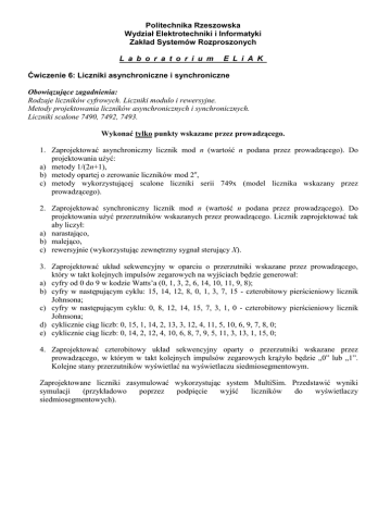 Politechnika Rzeszowska Wydział Elektrotechniki i Informatyki Zakład Systemów Rozproszonych L a b o r a t o r i u m E L i A K Ćwiczenie 6: Liczniki asynchroniczne i synchroniczne Obowiązujące zagadnienia: Rodzaje liczników cyfrowych. Liczniki modulo i rewersyjne. Metody projektowania liczników asynchronicznych i synchronicznych. Liczniki scalone 7490, 7492, 7493. Wykonać tylko punkty wskazane przez prowadzącego. 1. Zaprojektować asynchroniczny licznik mod n (wartość n podana przez prowadzącego). Do projektowania użyć: a) metody 1/(2n+1), b) metody opartej o zerowanie liczników mod 2n, c) metody wykorzystującej scalone liczniki serii 749x (model licznika wskazany przez prowadzącego). 2. Zaprojektować synchroniczny licznik mod n (wartość n podana przez prowadzącego). Do projektowania użyć przerzutników wskazanych przez prowadzącego. Licznik zaprojektować tak aby liczył: a) narastająco, b) malejąco, c) rewersyjnie (wykorzystując zewnętrzny sygnał sterujący X). 3. Zaprojektować układ sekwencyjny w oparciu o przerzutniki wskazane przez prowadzącego, który w takt kolejnych impulsów zegarowych na wyjściach będzie generował: a) cyfry od 0 do 9 w kodzie Watts’a (0, 1, 3, 2, 6, 14, 10, 11, 9, 8); b) cyfry w następującym cyklu: 15, 14, 12, 8, 0, 1, 3, 7, 15 - czterobitowy pierścieniowy licznik Johnsona; c) cyfry w następującym cyklu: 0, 8, 12, 14, 15, 7, 3, 1, 0 - czterobitowy pierścieniowy licznik Johnsona; d) cyklicznie ciąg liczb: 0, 15, 1, 14, 2, 13, 3, 12, 4, 11, 5, 10, 6, 9, 7, 8, 0; e) cyklicznie ciąg liczb: 0, 14, 2, 12, 4, 10, 6, 8, 7, 9, 5, 11, 3, 13, 1, 15, 0; 4. Zaprojektować czterobitowy układ sekwencyjny oparty o przerzutniki wskazane przez prowadzącego, w którym w takt kolejnych impulsów zegarowych krążyło będzie „0” lub „1”. Kolejne stany przerzutników wyświetlać na wyświetlaczu siedmiosegmentowym. Zaprojektowane liczniki zasymulować wykorzystując system MultiSim. Przedstawić wyniki symulacji (przykładowo poprzez podpięcie wyjść liczników do wyświetlaczy siedmiosegmentowych).