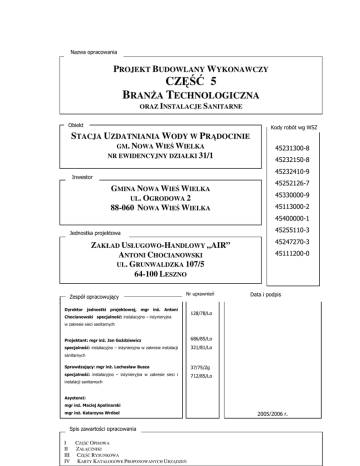 Nazwa opracowania PROJEKT BUDOWLANY WYKONAWCZY CZĘŚĆ 5 BRANŻA TECHNOLOGICZNA ORAZ INSTALACJE SANITARNE Obiekt Kody robót wg WSZ STACJA UZDATNIANIA WODY W PRĄDOCINIE GM. NOWA WIEŚ WIELKA NR EWIDENCYJNY DZIAŁKI 31/1 45231300-8 45232150-8 45232410-9 Inwestor GMINA NOWA WIEŚ WIELKA UL. OGRODOWA 2 88-060 NOWA WIEŚ WIELKA 45252126-7 45330000-9 45113000-2 45400000-1 45255110-3 Jednostka projektowa ZAKŁAD USŁUGOWO-HANDLOWY „AIR” ANTONI CHOCIANOWSKI UL. GRUNWALDZKA 107/5 64-100 LESZNO 1. Zespół opracowujący Nr uprawnień Dyrektor jednostki projektowej, mgr inż. Antoni Chocianowski specjalność: instalacyjno – inżynieryjna 45247270-3 45111200-0 Data i podpis 128/78/Lo w zakresie sieci sanitarnych Projektant: mgr inż. Jan Goździewicz 686/85/Lo specjalność: instalacyjno – inżynieryjna w zakresie instalacji 321/81/Lo sanitarnych Sprawdzający: mgr inż. Lechosław Busza 37/75/Zg specjalność: instalacyjno – inżynieryjna w zakresie sieci i 712/85/Lo instalacji sanitarnych Asystenci: mgr inż. Maciej Apolinarski mgr inż. Katarzyna Wróbel Spis zawartości opracowania I II III IV CZĘŚĆ OPISOWA ZAŁĄCZNIKI CZĘŚĆ RYSUNKOWA KARTY KATALOGOWE PROPONOWANYCH URZĄDZEŃ 2005/2006 r. PROJEKT BUDOWLANY - BRANŻA TECHNOLOGICZNA SUW w Prądocinie gm. Nowa Wieś Wielka ZAWARTOŚĆ OPRACOWANIA I CZĘŚĆ OPISOWA 1. Przedmiot i zakres opracowania................................................................................ 6 2. Inwestor oraz lokalizacja inwestycji. ....................................................................... 8 3. Zestawienie materiałów wykorzystanych w opracowaniu. ...................................... 9 4. Podstawa prawna opracowania. ............................................................................... 9 5. Bilans zapotrzebowania wody. ............................................................................... 10 6. Ujęcie wody. ............................................................................................................ 11 6.1. Warunki hydrogeologiczne .........................................................................................12 6.2. Pobór wody podziemnej.............................................................................................12 6.3. Parametry techniczne studni. .....................................................................................12 6.3.1. Studnia wiercona nr 1..................................................................................................12 6.3.2. Studnia wiercona nr 2..................................................................................................13 6.3.3. Obudowa i wyposażenie studni nr 1 i 2 .........................................................................14 6.4. Jakość ujmowanej wody ............................................................................................17 6.5. Strefy ochrony ujęcia. ................................................................................................19 7. Układ technologiczny – uzdatnianie wody i zasilanie sieci..................................... 20 7.1. Ujęcie wody ..............................................................................................................21 7.2. Napowietrzanie wody i komora reakcji ........................................................................22 7.2.1. Parametry strumienicy na rurociągu tłocznym ze st. nr 1 ................................................24 7.2.2. Parametry strumienicy na rurociągu tłocznym ze st. nr 2 ................................................25 7.3. Pompownia przerzutowa ............................................................................................26 7.4. Filtry ciśnieniowe .......................................................................................................27 7.4.1. Filtracja......................................................................................................................27 7.4.2. Płukanie .....................................................................................................................29 ZAKŁAD USŁUGOWO-HANDLOWY „AIR”, ul. Grunwaldzka 24, 64-100 Leszno str. 2 PROJEKT BUDOWLANY - BRANŻA TECHNOLOGICZNA SUW w Prądocinie gm. Nowa Wieś Wielka 7.4.3. Zestawienie parametrów technologicznych filtrów ..........................................................31 7.5. Dezynfekcja wody .....................................................................................................32 7.6. Zbiornik wody czystej ................................................................................................34 7.7. Pompownia sieciowa..................................................................................................35 7.8. Instalacje technologiczne w budynku. .........................................................................36 7.9. Rodzaj urządzeń pomiarowych ...................................................................................37 8. Ogrzewanie i wentylacja......................................................................................... 37 9. Agregat prądotwórczy............................................................................................. 39 10. Instalacja i rurociągi międzyobiektowe kanalizacyjne .................................... 40 10.1. Charakterystyka ścieków generowanych przez obiekt..............................................40 10.2. Odstojnik wód popłucznych ...................................................................................43 11. Instalacja sanitarna wodociągowa .................................................................. 44 12. Rurociągi wody surowej i uzdatnionej............................................................. 45 13. Instalacje kanalizacyjne................................................................................... 45 14. Wytyczne wykonania...........................................
