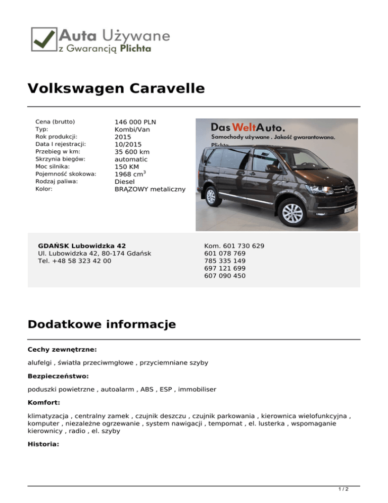 Volkswagen Caravelle Cena (brutto) Typ: Rok produkcji: Data I rejestracji: Przebieg w km: Skrzynia biegów: Moc silnika: Pojemność skokowa: Rodzaj paliwa: Kolor: 146 000 PLN Kombi/Van 2015 10/2015 35 600 km automatic 150 KM 1968 cm3 Diesel BRĄZOWY metaliczny GDAŃSK Lubowidzka 42 Ul. Lubowidzka 42, 80-174 Gdańsk Tel. +48 58 323 42 00 Kom. 601 730 629 601 078 769 785 335 149 697 121 699 607 090 450 Dodatkowe informacje Cechy zewnętrzne: alufelgi , światła przeciwmgłowe , przyciemniane szyby Bezpieczeństwo: poduszki powietrzne , autoalarm , ABS , ESP , immobiliser Komfort: klimatyzacja , centralny zamek , czujnik deszczu , czujnik parkowania , kierownica wielofunkcyjna , komputer , niezależne ogrzewanie , system nawigacji , tempomat , el. lusterka , wspomaganie kierownicy , radio , el. szyby Historia: 1/2 pierwszy właściciel , bezwypadkowy , serwisowany w ASO Gwarancja: Gwarancja Fabryczna Gwarancja Szanowni Państwo, Pragniemy Państwa poinformować, iż firma Plichta – Autoryzowany Dealer Škoda Auto prowadzi skup oraz sprzedaż samochodów używanych wszystkich marek, oferując także samochody używane z gwarancją objęte programem „Auta używane z Gwarancją Plichta”. W ramach programu „Auta Używane z Gwarancją Plichta ” każdy Klient otrzymuje atrakcyjny pakiet zniżek pozwalający zoptymalizować koszty eksploatacji samochodu: -50% na serwis klimatyzacji -50% na ustawienie zbieżności -50% na kosmetykę auta -50% na ścieżkę diagnostyczną -25% na wymiany oleju -25% na zakup opon + 5zł na sezon za hotelowanie opon -15% na części i akcesoria Oferujemy również kompleksową obsługę w zakresie finansowania i ubezpieczenia: - kredyty już od 4,99% - leasingi i kredyty bez zaświadczeń - uproszczone procedury – decyzja już od 30 min. - atrakcyjne pakiety AC/OC/NW/ASS wiodących firm ubezpieczeniowych Możliwość pozostawienia dotychczas użytkowanego auta w rozliczeniu – BEZPŁATNA WYCENA!!! Zapraszamy wszystkich Klientów na jazdę próbną wybranym autem. Numer oferty: D1175 Informacja nie stanowi oferty w rozumieniu art. 66 KC. Podane dane mają charakter wyłącznie informacyjny. 2/2 Powered by TCPDF (www.tcpdf.org)