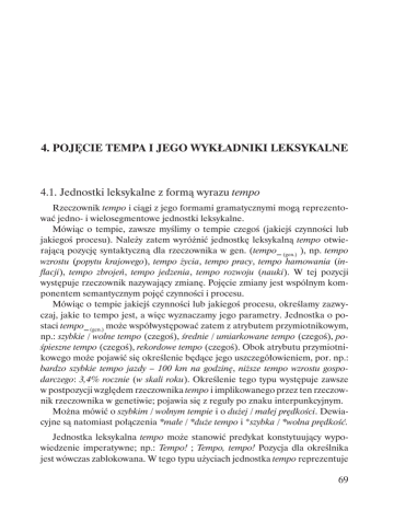 4. POJĘCIE TEMPA I JEGO WYKŁADNIKI LEKSYKALNE 4.1. Jednostki leksykalne z formą wyrazu tempo Rzeczownik tempo i ciągi z jego formami gramatycznymi mogą reprezentować jedno- i wielosegmentowe jednostki leksykalne. Mówiąc o tempie, zawsze myślimy o tempie czegoś (jakiejś czynności lub jakiegoś procesu). Należy zatem wyróżnić jednostkę leksykalną tempo otwierającą pozycję syntaktyczną dla rzeczownika w gen. (tempo_ (gen.) ), np. tempo wzrostu (popytu krajowego), tempo życia, tempo pracy, tempo hamowania (inflacji), tempo zbrojeń, tempo jedzenia, tempo rozwoju (nauki). W tej pozycji występuje rzeczownik nazywający zmianę. Pojęcie zmiany jest wspólnym komponentem semantycznym pojęć czynności i procesu. Mówiąc o tempie jakiejś czynności lub jakiegoś procesu, określamy zazwyczaj, jakie to tempo jest, a więc wyznaczamy jego parametry. Jednostka o postaci tempo_ (gen.) może współwystępować zatem z atrybutem przymiotnikowym, np.: szybkie / wolne tempo (czegoś), średnie / umiarkowane tempo (czegoś), pośpieszne tempo (czegoś), rekordowe tempo (czegoś). Obok atrybutu przymiotnikowego może pojawić się określenie będące jego uszczegółowieniem, por. np.: bardzo szybkie tempo jazdy – 100 km na godzinę, niższe tempo wzrostu gospodarczego: 3,4% rocznie (w skali roku). Określenie tego typu występuje zawsze w postpozycji względem rzeczownika tempo i implikowanego przez ten rzeczownik rzeczownika w genetiwie; pojawia się z reguły po znaku interpunkcyjnym. Można mówić o szybkim / wolnym tempie i o dużej / małej prędkości. Dewiacyjne są natomiast połączenia *małe / *duże tempo i *szybka / *wolna prędkość. Jednostka leksykalna tempo może stanowić predykat konstytuujący wypowiedzenie imperatywne; np.: Tempo! ; Tempo, tempo! Pozycja dla określnika jest wówczas zablokowana. W tego typu użyciach jednostka tempo reprezentuje 69 Polskie przysłówki tempa klasę wykrzykników apelatywnych. Nadawca za jej pomocą wykonuje bowiem działania, które mają doprowadzić do zmiany stanu rzeczy w świecie pozajęzykowym, a dokładniej mają spowodować działania adresata, działania zgodne z wolą nadawcy (por. Bogusławski 1974a, Grochowski 1996a). Zdaniem A. Bogusławskiego rozkaźnik można uznać „za symboliczną czy magiczną inicjację bezpośredniego nacisku na odbiorcę” (Bogusławski 1974a: 196). Wybór formy rozkaźnika przez nadawcę komunikatu wynika z konkretnej motywacji nadawcy, a mianowicie z chęci wpłynięcia na odbiorcę, wywołania w nim określonych skutków (zob. Bogusławski 1974a: 195). Odbiorca, na podstawie wyboru samej formy wypowiedzi, ma uznać, że nadawca chce… (tego a tego). Nadawca nie może być jednak pewien, że odbiorca zastosuje się do treści rozkaźnika. Może jedynie zakładać, że nastąpi jakaś czynna reakcja odbiorcy: odbiorca zastosuje się do żądania nadawcy lub zareaguje na nie werbalnie. Wyrażenie imperatywne Tempo, tempo! jest więc konstytuowane semantycznie przez ciąg „chcę spowodować, żeby…”. Mówiąc Tempo, tempo! chcemy spowodować, by ktoś zwiększył prędkość wykonywanej czynności, by robił coś szybciej, niż robi, por. też: Szybciej, szybciej! Skoro użycie wykrzyknika w funkcji apelatywnej implikuje w o l ę nadawcy, by spowodować nowy stan rzeczy, zainicjować działania odbiorcy komunikatu, za sprzeczne należy uznać zdanie: (103) *Mówiąc „tempo, tempo”, nie mówię, że chcę przez to spowodować, żebyś robił szybciej to, co robisz. Należy odróżnić jednostkę leksykalną w tempie (ekwiwalent wyrażenia w szybkim tempie / szybko) od homonimicznej konstrukcji syntaktycznej – połączenia przyimka w z rzeczownikiem tempo w loc. Jednostka w tempie jest awalencyjna, por.: (104) Trudno było w tempie tę wystawę pokazać. (105) Masz to, co było w tempie gdzieś zapisane? (106) Stadion budowany w tempie będzie gotowy na przyjazd prezydenta. Analogicznie do jednostki szybko, ciąg w tempie jest dodawany (jako jednostka autonomiczna) do innej jednostki leksykalnej. Dystrybucja jednostki szybko jest inkluzywna w stosunku do dystrybucji jednostki w tempie. Przysłówek szybko może określać tempo zarówno czynności, jak i procesu. Może być zatem składnikiem zdań typu ‘ktoś robi coś’ jak i zdań o strukturze ‘coś się dzieje z kimś / czymś’. Wyrażenie w tempie przysługiwać może jedynie czynnościom. W tempie jako konstrukcja otwiera miejsce dla gen. Jest to cecha pochodna od jednostki tempo_ (gen.), dziedziczona po niej. Por. np. 70 Pojęcie tempa i jego wykładniki leksykalne (107) Woźny zamiatał chodnik, posuwając się w tempie maszyny, która obok usuwała śnieg z jezdni. (108) Wspaniała symfoniczna wariacja, momentami utrzymana znów w tempie walca. (109) Wśród utworków dominują miniaturki w tempie walca. (110) W tempie walca kręcił się nad moją głową gwiezdny firmament. Ciąg w tempie_ (gen.) (w tempie «czegoś») otwiera zatem pozycję dla swego uzupełnienia. Może być również rozsunięty przez atrybut przymiotnikowy (por. «jakieś» tempo «czegoś»), por. np.: (111) Wiruje wszechświat w szalonym tempie walca. (112) Równie ciekawa jest kompozycja „Dansons la Gigue”, napisana do słów francuskiego poety Paula Verlaine’a i utrzymana w tempie szybkiego walca. Jeśli coś dzieje się w tempie czegoś, to dzieje się z szybkością właściwą jakiejś innej czynności lub taką, jak coś innego, porównywalnego. Mówiąc o tempie walca, mamy na myśli nie prędkość, z jaką tańczy się walca, ale raczej jego wewnętrzny rytm, regularność, powtarzalność pewnych sekwencji dźwięków. W zdaniach (108)–(112) jednostka tempo może być substytuowana przez jednostkę rytm. Tempo jest również częścią jednostki przysłówkowej na tempo. Według ISJP „Jeśli robimy coś na tempo, to robiąc to, śpieszymy się, ponieważ ktoś nas ponagla”. Rzeczownik tempo należy do kla