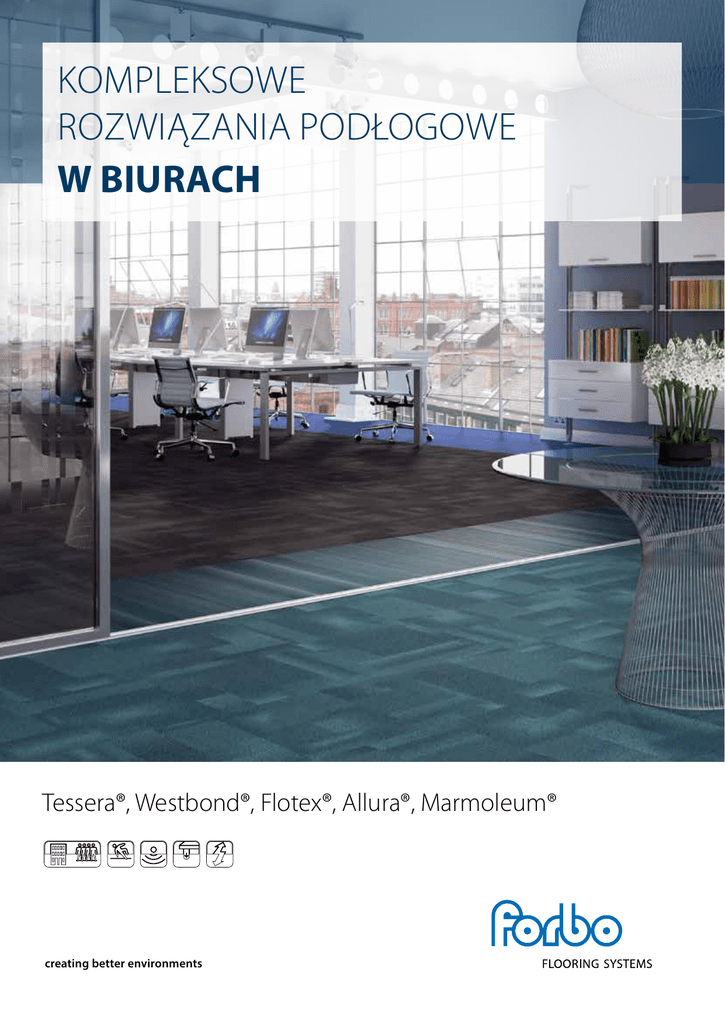 KOMPLEKSOWE ROZWIĄZANIA PODŁOGOWE W BIURACH Tessera®, Westbond®, Flotex®, Allura®, Marmoleum® creating better environments FUNKCJONALNA I LUKSUSOWA PODŁOGA Tessera® Westbond® Natural Westbond® Tessera® Dobrze dobrana wykładzina odgrywa kluczową rolę w tworzeniu odpowiedniego charakteru wnętrza w każdym miejscu pracy. Forbo Flooring posiada bogate portfolio produktów przeznaczonych do pomieszczeń biurowych o doskonałych parametrach użytkowych i bogatej palecie kolorystycznej. Dzięki najwyższej jakości wykonania, właściwościom higienicznym i dbaniu o środowisko naturalne, rozwiązania te sprzyjają tworzeniu zdrowszego, inspirującego i bezpiecznego środowiska pracy. Tessera® - zaprojektowana z myślą o biurach Najwyższa jakość? Westbond®! Tessera to wysokiej jakości płytki dywanowe od lat cenione za jakość, trwałość i funkcjonalność. Dzięki swojej modułowości pozwalają na znaczne obniżenie kosztów związanych z przeorganizowaniem pomieszczeń biurowych oraz oferują więcej możliwości dekoracyjnych, niż tradycyjne wersje w rolkach. Z łatwością można je instalować na podłogach podniesionych, skutecznie chowając metry przewodów komputerowych w przestrzeniach podpodłogowych, a niezliczona ilość rotujących kółek meblowych nie zagraża ich trwałości. W ofercie dostępne są płytki Tessera o różnorodnej strukturze, wzorach i kolorystyce do każdego pomieszczenia. Płytki dywanowe Westbond są synonimem elegancji i luksusu. Dzięki zaawansowanej technologii wytwarzania (‚Fusion Bonded’) powstaje wykładzina o gęstej i zwartej budowie oferująca ponadprzeciętny komfort użytkowania oraz najwyższą jakość. Wykładzina Westbond nadaje każdej podłodze pięknego, intensywnego i niepowtarzalnego wyglądu wyznaczając nowe standardy dla pokryć podłogowych w biurach. Płytki Tessera, od lat cenione na naszym rynku, to najczęściej wybierane rozwiązanie podłogowe do biur. Westbond® SPECJALISTYCZNE ROZWIĄZANIA Flotex® Linear Allura® Flex Panele Allura® Flex gotowe do użytku tego samego dnia Flotex® - dla zdrowszego otoczenia w biurze Flotex jest jedyną na rynku wykładziną łączącą zalety elastycznego, zmywalnego, trwałego i trudnościeralnego materiału podłogowego z ciepłem i wygodą, jakie daje wykładzina dywanowa. Dzięki modułowej budowie i właściwościach tłumiących dźwięki idealnie sprawdza się w biurach. Krótkie włókna nie gromadzą zanieczyszczeń, a środek Sanitized® zabezpiecza wykładzinę przed rozmnażaniem się roztoczy kurzu, odpowiedzialnych za większość alergii i problemów z układem oddechowym. Wykładzina Flotex to higiena, komfort i wygoda użytkowania. Płytki i panele Allura Flex to produkt typu „loose-lay”, który instaluje się w prosty sposób bez użycia kleju i 3 razy szybciej niż inne panele winylowe. Ogromnym atutem płytek jest ich trwałość, łatwość pielęgnacji, oraz nowoczesny wygląd drewnianej lub kamiennej podłogi w biurze. Allura Flex idealnie sprawdza się przy podłogach podniesionych i można ją dowolnie łączyć z płytkami dywanowymi. Flotex® Linear Flotex®/ Allura® Flex RÓŻNORODNE WZORNICTWO Marmoleum® Modular linoleum w nowej odsłonie Marmoleum Modular to kolekcja płytek linoleum, która daje niezmiernie szerokie możliwości aranżacji powierzchni podłogowych. Dostępność w różnych rozmiarach, kolorach i kształtach płytek, które można dowolnie łączyć, pozwala na stworzenie unikalnych wzorów podłogowych niespotykanych w żadnym innym biurze. Bogata kolorystyka we wnętrzu sprzyja kreatywności oraz może podkreślać indywidualny charakter budynku. Marmoleum® Modular Forbo posiada ogromne doświadczenie w zakresie rozwiązań podłogowych dla powierzchni biurowych. Świadczą o tym tysiące metrów kwadratowych naszych wykładzin zainstalowanych w Polsce. Siedziba Asseco Poland, Wilanów Office Park w Warszawie – Tessera Apex Biurowiec LC Corp w Warszawie – Tessera Apex Miasteczko Orange, Siedziba TP S.A. w Warszawie – Tessera Apex Lotnisko Chopina w Warszawie – Tessera Apex Platinium Business Park w Warszawie –Tessera Apex Stadion Narodowy w Warszawie – Tessera Apex Bonarka Office Park w Krakowie – Tessera Format LC Corp Tower Katowice – Tessera Apex Biurowiec Skylight w Warszawie – Allura Flex Stadion Legii w Warszawie – Tessera Basis Biurowiec Orco w Warszawie – Tessera Basis Biura TVN w Warszawie – Tessera Apex Biura TVP w Warszawie – Tessera Basis, Tessera Apex Salon Rolls - Royce w Warszawie – Westbond Kapitanat Portu w Gdyni – Westbond Biura firmy D&H Engineering w Gdańsku – Allura, Flotex Biurowiec Garnizon w Gdańsku – Tessera Apex Biurowiec Alchemia w Gdańsku: Biura firmy Kemira – Tessera Alignment Biurowiec Zarządu Portu Gdynia – Allura Biura firmy Semeko w Redzie – Eternal Biura Alstom w Elblągu – Eternal Biura firmy Żabka w Będzieszynie – Tessera Apex Leasing Polski w Gdańsku – Flotex Jabil w Bydgoszczy – Flotex Unipil w Gdyni – Fotex Bims Plus w Bydgoszczy – Flotex Technopark Pomerania w Szczecinie – Alignment, Allura Flex, Marmoleum Biurowiec Kosmos w Szczecinie – Tessera Apex Delloitte oddział w Szczecinie – Tessera Apex ING Oddział w Szczecinie – Westbond Piastów Office Park w Szczecinie – Tessera Basis Biurowiec Philips w Pile – Flotex, Apex Biurowiec Prosta Tower w Warszawie – Alignment Urząd Dozoru Technicznego w Białymstoku – Tessera Create Space 1 Biuro: Forbo Flooring Polska ul. Jeleniogórska 16 60-179 Poznań Tel.: + 48 (61) 862 13 82 Fax: + 48 (61) 622 99 71 E-mail: [email protected] www.forbo-flooring.pl Naszą ambicją jest to, aby poprzez nasze rozwiązania podłogowe wpływać w pozytywny sposób na zdrowie i komfort jednostki. Dla nas nasze zaangażowanie w zrównoważony rozwój oznacza dbałość o zdrowie każdego człowieka. creating better environments