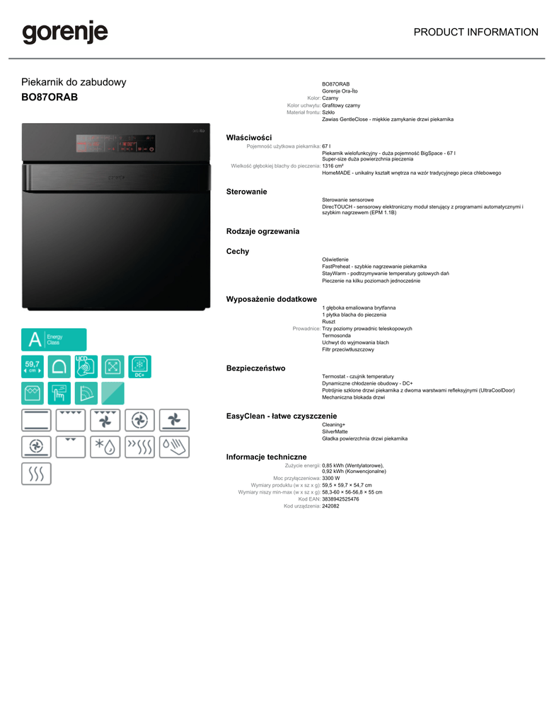 PRODUCT INFORMATION Piekarnik do zabudowy BO87ORAB BO87ORAB Gorenje Ora-Ïto Kolor: Czarny Kolor uchwytu: Grafitowy czarny Materiał frontu: Szkło Zawias GentleClose - miękkie zamykanie drzwi piekarnika Właściwości Pojemność użytkowa piekarnika: 67 l Piekarnik wielofunkcyjny - duża pojemność BigSpace - 67 l Super-size duża powierzchnia pieczenia Wielkość głębokiej blachy do pieczenia: 1316 cm² HomeMADE - unikalny kształt wnętrza na wzór tradycyjnego pieca chlebowego Sterowanie Sterowanie sensorowe DirecTOUCH - sensorowy elektroniczny moduł sterujący z programami automatycznymi i szybkim nagrzewem (EPM 1.1B) Rodzaje ogrzewania Cechy Oświetlenie FastPreheat - szybkie nagrzewanie piekarnika StayWarm - podtrzymywanie temperatury gotowych dań Pieczenie na kilku poziomach jednocześnie Wyposażenie dodatkowe 1 głęboka emaliowana brytfanna 1 płytka blacha do pieczenia Ruszt Prowadnice: Trzy poziomy prowadnic teleskopowych Termosonda Uchwyt do wyjmowania blach Filtr przeciwtłuszczowy Bezpieczeństwo Termostat - czujnik temperatury Dynamiczne chłodzenie obudowy - DC+ Potrójnie szklone drzwi piekarnika z dwoma warstwami refleksyjnymi (UltraCoolDoor) Mechaniczna blokada drzwi EasyClean - łatwe czyszczenie Cleaning+ SilverMatte Gładka powierzchnia drzwi piekarnika Informacje techniczne Zużycie energii: 0,85 kWh (Wentylatorowe), 0,92 kWh (Konwencjonalne) Moc przyłączeniowa: 3300 W Wymiary produktu (w x sz x g): 59,5 × 59,7 × 54,7 cm Wymiary niszy min-max (w x sz x g): 58,3-60 × 56-56,8 × 55 cm Kod EAN: 3838942525476 Kod urządzenia: 242082