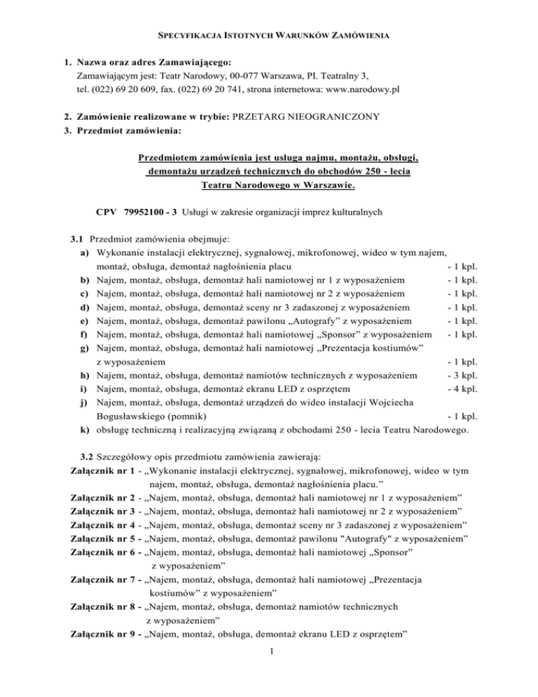 SPECYFIKACJA ISTOTNYCH WARUNKÓW ZAMÓWIENIA 1. Nazwa oraz adres Zamawiającego: Zamawiającym jest: Teatr Narodowy, 00-077 Warszawa, PI. Teatralny 3, tel. (022) 69 20 609, fax. (022) 69 20 741, strona internetowa: www.narodowy.pl 2. Zamówienie realizowane w trybie: PRZETARG NIEOGRANICZONY 3. Przedmiot zamówienia: Przedmiotem zamówienia jest usługa najmu, montażu, obsługi, demontażu urządzeń technicznych do obchodów 250 - lecia Teatru Narodowego w Warszawie. CPV 79952100 - 3 Usługi w zakresie organizacji imprez kulturalnych 3.1 Przedmiot zamówienia obejmuje: a) Wykonanie instalacji elektrycznej, sygnałowej, mikrofonowej, wideo w tym najem, b) c) d) e) f) g) h) i) j) k) montaż, obsługa, demontaż nagłośnienia placu - 1 kpl. Najem, montaż, obsługa, demontaż hali namiotowej nr 1 z wyposażeniem - 1 kpl. Najem, montaż, obsługa, demontaż hali namiotowej nr 2 z wyposażeniem - 1 kpl. Najem, montaż, obsługa, demontaż sceny nr 3 zadaszonej z wyposażeniem - 1 kpl. Najem, montaż, obsługa, demontaż pawilonu „Autografy” z wyposażeniem - 1 kpl. Najem, montaż, obsługa, demontaż hali namiotowej „Sponsor” z wyposażeniem - 1 kpl. Najem, montaż, obsługa, demontaż hali namiotowej „Prezentacja kostiumów” z wyposażeniem - 1 kpl. Najem, montaż, obsługa, demontaż namiotów technicznych z wyposażeniem - 3 kpl. Najem, montaż, obsługa, demontaż ekranu LED z osprzętem - 4 kpl. Najem, montaż, obsługa, demontaż urządzeń do wideo instalacji Wojciecha Bogusławskiego (pomnik) - 1 kpl. obsługę techniczną i realizacyjną związaną z obchodami 250 - lecia Teatru Narodowego. 3.2 Szczegółowy opis przedmiotu zamówienia zawierają: Załącznik nr 1 - „Wykonanie instalacji elektrycznej, sygnałowej, mikrofonowej, wideo w tym najem, montaż, obsługa, demontaż nagłośnienia placu.” Załącznik nr 2 - „Najem, montaż, obsługa, demontaż hali namiotowej nr 1 z wyposażeniem” Załącznik nr 3 - „Najem, montaż, obsługa, demontaż hali namiotowej nr 2 z wyposażeniem” Załącznik nr 4 - „Najem, montaż, obsługa, demontaż sceny nr 3 zadaszonej z wyposażeniem” Załącznik nr 5 - „Najem, montaż, obsługa, demontaż pawilonu "Autografy" z wyposażeniem” Załącznik nr 6 - „Najem, montaż, obsługa, demontaż hali namiotowej „Sponsor” z wyposażeniem” Załącznik nr 7 - „Najem, montaż, obsługa, demontaż hali namiotowej „Prezentacja kostiumów” z wyposażeniem” Załącznik nr 8 - „Najem, montaż, obsługa, demontaż namiotów technicznych z wyposażeniem” Załącznik nr 9 - „Najem, montaż, obsługa, demontaż ekranu LED z osprzętem” 1 Załącznik nr 10 -„ Najem, montaż, obsługa, demontaż urządzeń do wideo instalacji Wojciecha Bogusławskiego (pomnik)” Załącznik nr 11 – „Obsługa techniczna i realizacyjna związana z obchodami 250 - lecia Teatru Narodowego” Załącznik nr 12 - „Plan sytuacyjny” Załącznik nr 13 - „Rzut hali namiotowej nr 1 z usytuowaną sceną, widownią, wejściami dla publiczności ” Załącznik nr 14 - „Rzut hali namiotowej nr 1 z rozmieszczonymi gniazdami obwodów regulowanych, nieregulowanych sceny” Załącznik nr 15 - „Rzut hali namiotowej nr 1 z rozmieszczoną konstrukcją wewnętrzną quadrosystemu” Załącznik nr 16 - „Rzut hali namiotowej nr 2 z usytuowaną sceną, widownią, wejściami dla publiczności ” Załącznik nr 17 - „Rzut hali namiotowej nr 2 z rozmieszczonymi gniazdami obwodów regulowanych, nieregulowanych sceny” Załącznik nr 18 - „Rzut hali namiotowej nr 2 z rozmieszczoną konstrukcją wewnętrzną quadrosystemu” Załącznik nr 19 – „Kosztorys ofertowy wykonania przedmiotu zamówienia”. Załączniki nr 1, 2, 3, 4, 5, 6, 7, 8, 9, 10, 11, 12, 13, 14, 15, 16, 17,18 , 19 stanowią integralną część SIWZ. 3.3 Zaleca się aby, Oferenci przed złożeniem ofert, dokonali wizji lokalnej terenu - Placu Teatralnego w Warszawie, na którym będą organizowane obchody 250-lecia Teatru Narodowego. Termin wizji lokalnej musi być zgłoszony pisemnie do Zamawiającego. 3.4 Do oferty Oferenci załączą „Projekt - koncepcję poprowadzenia tras instalacji elektrycznych wraz z odpowiednimi zabezpieczeniami”, gwarantujący zachowanie bezpieczeństwa uczestników obchodów 250-lecia Teatru (publiczności). Koncepcja ta w szczególności musi uwzględniać zabezpieczenie zorganizowania obchodów 250-lecia Teatru bez względu na pogodę (występujące warunki atmosferyczne). 4. Zamawiający nie dopuszcza możliwości składania ofert częściowych oraz ofert wariantowych. 5. Zamawiający nie przewiduje udzielania zamówień uzupełniających. 6. Termin realizacji zamówienia: Realizacja przedmiotu zamówienia, o którym mowa w pkt. 3.1 od a) do k) SIWZ w terminie: od poniedziałku 7.09.2015 r. od godziny 00:05, do poniedziałku 14.09.2015 r. do godz. 5:30, w tym dostawa i montaż najmowanych urządzeń (tzw. gotowość potwierdzona pisemnie przez Zamawiającego) w następujących terminach następujących pozycji: 2 a) do piątku 11.09.2015 r. do godz. 8:00 dostawa i montaż najmowanych urządzeń określonych w Załącznikach nr 1, nr 2, nr 3, nr 4, nr 8, nr 9, do SIWZ, b) do piątku 11.09.2015 r. do godz. 12:00 dostawa i montaż najmowanych urządzeń określonych w Załącznikach nr 10 do SIWZ, c) do piątku 11.09.2015 r. do godz. 20:00 dostawa i montaż najmowanych urządzeń określonych w Załącznikach nr 5, nr 6, nr 7 do SIWZ. 7. Zamawiający nie będzie udzielał zaliczek na poczet wykonania zamówienia. 8. Warunki udziału w postępowaniu oraz opis sposobu dokonywania oceny spełnienia tych warunków. Do udziału w postępowaniu mogą przystąpić Wykonawcy, którzy spełniają warunki określone w art. 22 ust.1 ustawy „Prawo zamówień publicznych", dotyczące: 8.1 posiadania uprawnień do wykonywania określonej działalności lub czynności, jeżeli przepisy prawa nakładają obowiązek ich posiadania, 8.2 posiadania wi