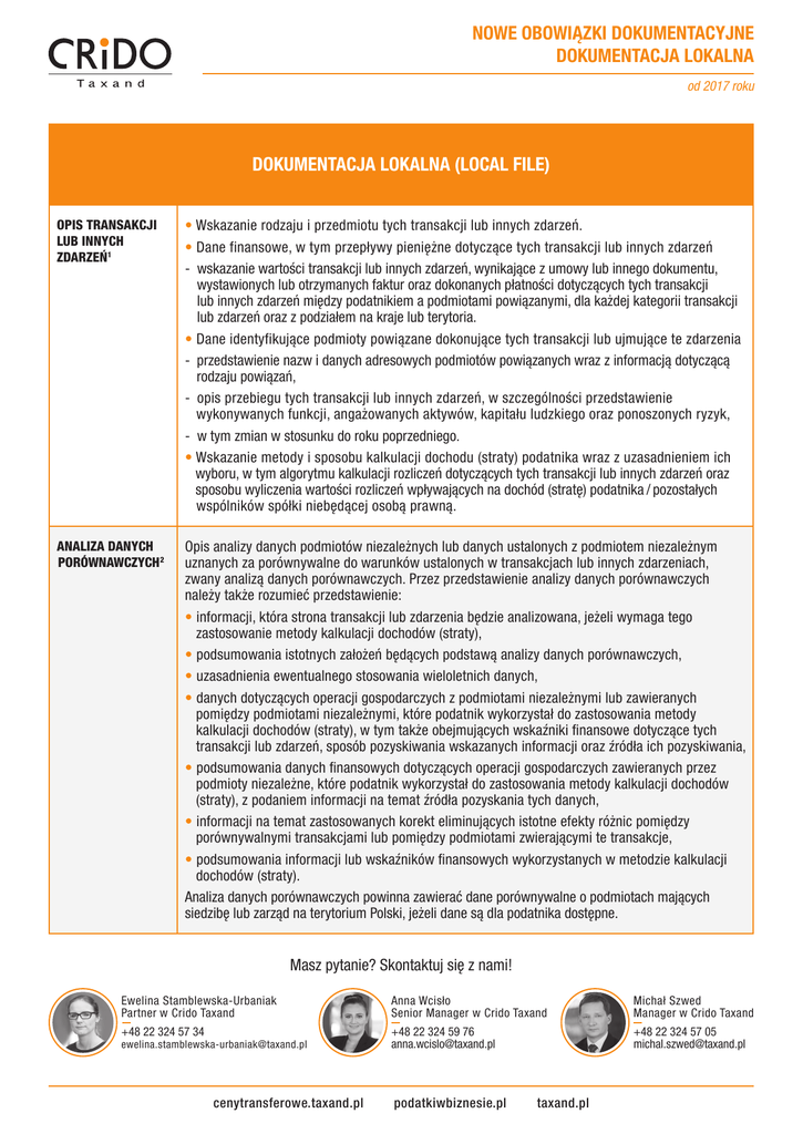 NOWE OBOWIĄZKI DOKUMENTACYJNE DOKUMENTACJA LOKALNA od 2017 roku DOKUMENTACJA LOKALNA (LOCAL FILE) OPIS TRANSAKCJI LUB INNYCH ZDARZEŃ1 • Wskazanie rodzaju i przedmiotu tych transakcji lub innych zdarzeń. • Dane finansowe, w tym przepływy pieniężne dotyczące tych transakcji lub innych zdarzeń - wskazanie wartości transakcji lub innych zdarzeń, wynikające z umowy lub innego dokumentu, wystawionych lub otrzymanych faktur oraz dokonanych płatności dotyczących tych transakcji lub innych zdarzeń między podatnikiem a podmiotami powiązanymi, dla każdej kategorii transakcji lub zdarzeń oraz z podziałem na kraje lub terytoria. • Dane identyfikujące podmioty powiązane dokonujące tych transakcji lub ujmujące te zdarzenia - przedstawienie nazw i danych adresowych podmiotów powiązanych wraz z informacją dotyczącą rodzaju powiązań, - opis przebiegu tych transakcji lub innych zdarzeń, w szczególności przedstawienie wykonywanych funkcji, angażowanych aktywów, kapitału ludzkiego oraz ponoszonych ryzyk, - w tym zmian w stosunku do roku poprzedniego. • Wskazanie metody i sposobu kalkulacji dochodu (straty) podatnika wraz z uzasadnieniem ich wyboru, w tym algorytmu kalkulacji rozliczeń dotyczących tych transakcji lub innych zdarzeń oraz sposobu wyliczenia wartości rozliczeń wpływających na dochód (stratę) podatnika / pozostałych wspólników spółki niebędącej osobą prawną. ANALIZA DANYCH PORÓWNAWCZYCH2 Opis analizy danych podmiotów niezależnych lub danych ustalonych z podmiotem niezależnym uznanych za porównywalne do warunków ustalonych w transakcjach lub innych zdarzeniach, zwany analizą danych porównawczych. Przez przedstawienie analizy danych porównawczych należy także rozumieć przedstawienie: • informacji, która strona transakcji lub zdarzenia będzie analizowana, jeżeli wymaga tego zastosowanie metody kalkulacji dochodów (straty), • podsumowania istotnych założeń będących podstawą analizy danych porównawczych, • uzasadnienia ewentualnego stosowania wieloletnich danych, • danych dotyczących operacji gospodarczych z podmiotami niezależnymi lub zawieranych pomiędzy podmiotami niezależnymi, które podatnik wykorzystał do zastosowania metody kalkulacji dochodów (straty), w tym także obejmujących wskaźniki finansowe dotyczące tych transakcji lub zdarzeń, sposób pozyskiwania wskazanych informacji oraz źródła ich pozyskiwania, • podsumowania danych finansowych dotyczących operacji gospodarczych zawieranych przez podmioty niezależne, które podatnik wykorzystał do zastosowania metody kalkulacji dochodów (straty), z podaniem informacji na temat źródła pozyskania tych danych, • informacji na temat zastosowanych korekt eliminujących istotne efekty różnic pomiędzy porównywalnymi transakcjami lub pomiędzy podmiotami zwierającymi te transakcje, • podsumowania informacji lub wskaźników finansowych wykorzystanych w metodzie kalkulacji dochodów (straty). Analiza danych porównawczych powinna zawierać dane porównywalne o podmiotach mających siedzibę lub zarząd na terytorium Polski, jeżeli dane są dla podatnika dostępne. Masz pytanie? Skontaktuj się z nami! Ewelina Stamblewska-Urbaniak Partner w Crido Taxand Anna Wcisło Senior Manager w Crido Taxand Michał Szwed Manager w Crido Taxand +48 22 324 57 34 +48 22 324 59 76 [email protected] +48 22 324 57 05 [email protected] [email protected] cenytransferowe.taxand.pl podatkiwbiznesie.pl taxand.pl NOWE OBOWIĄZKI DOKUMENTACYJNE DOKUMENTACJA LOKALNA od 2017 roku OPIS DANYCH FINANSOWYCH Opis danych finansowych podatnika / spółki niebędącej osobą prawną, pozwalający na porównanie rozliczeń z danymi wynikającymi z zatwierdzonego sprawozdania finansowego, jeżeli obowiązek jego sporządzenia wynika z obowiązujących podatnika lub spółkę przepisów o rachunkowości. INFORMACJE O PODATNIKU Informacje o podatniku / spółce niebędącej osobą prawną, obejmujące opis: • struktury organizacyjnej i struktury zarządczej, • przedmiotu i zakresu prowadzonej działalności, • realizowanej strategii gospodarczej, w tym przeprowadzonych w roku podatkowym lub w roku poprzedzającym rok podatkowy, przeniesień pomiędzy podmiotami powiązanymi istotnych ekonomicznie funkcji, aktywów lub ryzyk, mających wpływ na dochód (stratę) podatnika, • otoczenia konkurencyjnego. DODATKOWE DOKUMENTY • Umowy, porozumienia zawarte pomiędzy podmiotami powiązanymi lub inne dokumenty, dotyczące transakcji lub innych zdarzeń, umowę spółki niebędącej osobą prawną, umowę wspólnego przedsięwzięcia lub umowy o podobnym charakterze, dokumentujące zasady przyznawania praw wspólnikom (stronom umowy) do udziału w zysku oraz uczestnictwa w stratach. • Porozumienia w sprawach podatku dochodowego zawarte z administracjami podatkowymi państw innych niż Rzeczpospolita Polska, dotyczące transakcji lub innych zdarzeń, w szczególności uprzednie porozumienia cenowe. 1 Obowiązek dokumentacyjny dotyczy transakcji / innych zdarzeń ujętych w księgach rachunkowych, w tym umów zarządzania płynnością, umów o podziale kosztów, umów spółek niebędących osobą prawną, umów wspólnego przedsięwzięcia oraz innych umów o podobnym charakterze. 2 Dotyczy podatników / spółek niebędących osobą prawną, których przychody lub koszty, w rozumieniu przepisów o rachunkowości, przekroczyły w roku poprzedzającym rok podatkowy / obrotowy równowartość 10 000 000 euro. Źródło: • Ustawa o podatku dochodowym od osób prawnych w brzmieniu obowiązującym od 1 stycznia 2017 r. • Projekt rozporządzenia Ministra Finansów z lipca 2015 r. w sprawie szczegółowego opisu elementów stanowiących dokumentację podatkową. Masz pytanie? Skontaktuj się z nami! Ewelina Stamblewska-Urbaniak Partner w Crido Taxand Anna Wcisło Senior Manager w Crido Taxand Michał Szwed Manager w Crido Taxand +48 22 324 57 34 +48 22 324 59 76 [email pr