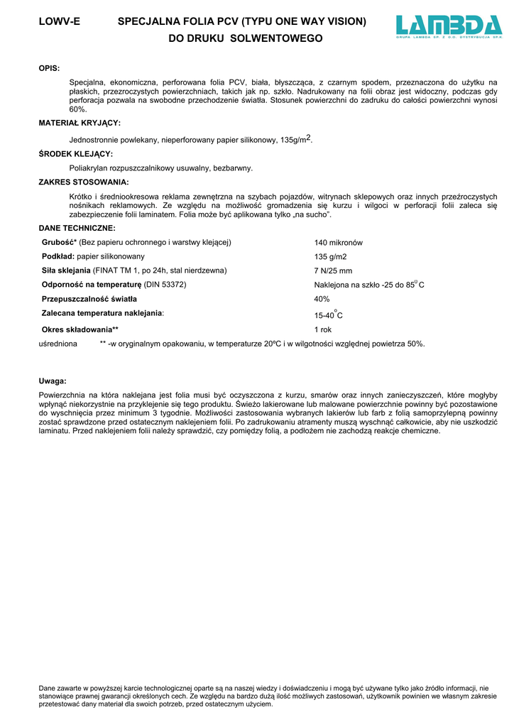 LOWV-E SPECJALNA FOLIA PCV (TYPU ONE WAY VISION) DO DRUKU SOLWENTOWEGO OPIS: Specjalna, ekonomiczna, perforowana folia PCV, biała, błyszcząca, z czarnym spodem, przeznaczona do użytku na płaskich, przezroczystych powierzchniach, takich jak np. szkło. Nadrukowany na folii obraz jest widoczny, podczas gdy perforacja pozwala na swobodne przechodzenie światła. Stosunek powierzchni do zadruku do całości powierzchni wynosi 60%. MATERIAŁ KRYJĄCY: Jednostronnie powlekany, nieperforowany papier silikonowy, 135g/m2. ŚRODEK KLEJĄCY: Poliakrylan rozpuszczalnikowy usuwalny, bezbarwny. ZAKRES STOSOWANIA: Krótko i średniookresowa reklama zewnętrzna na szybach pojazdów, witrynach sklepowych oraz innych przeźroczystych nośnikach reklamowych. Ze względu na możliwość gromadzenia się kurzu i wilgoci w perforacji folii zaleca się zabezpieczenie folii laminatem. Folia może być aplikowana tylko „na sucho”. DANE TECHNICZNE: Grubość* (Bez papieru ochronnego i warstwy klejącej) 140 mikronów Podkład: papier silikonowany 135 g/m2 Siła sklejania (FINAT TM 1, po 24h, stal nierdzewna) 7 N/25 mm Odporność na temperaturę (DIN 53372) Naklejona na szkło -25 do 85 C Przepuszczalność światła 40% Zalecana temperatura naklejania: 15-40 C Okres składowania** 1 rok uśredniona 0 o ** -w oryginalnym opakowaniu, w temperaturze 20ºC i w wilgotności względnej powietrza 50%. Uwaga: Powierzchnia na która naklejana jest folia musi być oczyszczona z kurzu, smarów oraz innych zanieczyszczeń, które mogłyby wpłynąć niekorzystnie na przyklejenie się tego produktu. Świeżo lakierowane lub malowane powierzchnie powinny być pozostawione do wyschnięcia przez minimum 3 tygodnie. Możliwości zastosowania wybranych lakierów lub farb z folią samoprzylepną powinny zostać sprawdzone przed ostatecznym naklejeniem folii. Po zadrukowaniu atramenty muszą wyschnąć całkowicie, aby nie uszkodzić laminatu. Przed naklejeniem folii należy sprawdzić, czy pomiędzy folią, a podłożem nie zachodzą reakcje chemiczne. Dane zawarte w powyższej karcie technologicznej oparte są na naszej wiedzy i doświadczeniu i mogą być używane tylko jako źródło informacji, nie stanowiące prawnej gwarancji określonych cech. Ze względu na bardzo dużą ilość możliwych zastosowań, użytkownik powinien we własnym zakresie przetestować dany materiał dla swoich potrzeb, przed ostatecznym użyciem.