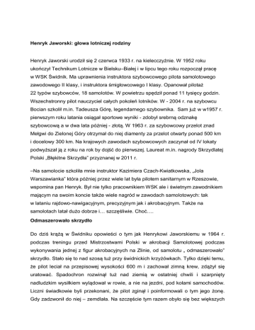 Henryk Jaworski: głowa lotniczej rodziny Henryk Jaworski urodził się 2 czerwca 1933 r. na kielecczyźnie. W 1952 roku ukończył Technikum Lotnicze w Bielsku–Białej i w lipcu tego roku rozpoczął pracę w WSK Świdnik. Ma uprawnienia instruktora szybowcowego pilota samolotowego zawodowego II klasy, i instruktora śmigłowcowego I klasy. Opanował pilotaż 22 typów szybowców, 18 samolotów. W powietrzu spędził ponad 11 tysięcy godzin. Wszechstronny pilot nauczyciel całych pokoleń lotników. W - 2004 r. na szybowcu Bocian szkolił m.in. Tadeusza Górę, legendarnego szybownika. Sam już w w1957 r. pierwszym roku latania osiągał sportowe wyniki - zdobył srebrną odznakę szybowcową a w dwa lata później - złotą. W 1963 r. za szybowcowy przelot znad Mełgwi do Zielonej Góry otrzymał do niej diamenty za przelot otwarty ponad 500 km i docelowy 300 km. Na krajowych zawodach szybowcowych zaczynał od IV lokaty podwyższał ją z roku na rok by dojść do pierwszej. Laureat m.in. nagrody Skrzydlatej Polski „Błękitne Skrzydła” przyznanej w 2011 r. –Na samolocie szkoliła mnie instruktor Kazimiera Czach-Kwiatkowska, „Jola Warszawianka” która później przez wiele lat była pilotem sanitarnym w Rzeszowie, wspomina pan Henryk. Był nie tylko pracownikiem WSK ale i świetnym zawodnikiem mającym na swoim koncie także wiele nagród w zawodach samolotowych: tak w lataniu rajdowo-nawigacyjnym, precyzyjnym jak i akrobacyjnym. Także na samolotach latał dużo dobrze i… szczęśliwie. Choć…. Odmaszerowało skrzydło Do dziś krążą w Świdniku opowieści o tym jak Henrykowi Jaworskiemu w 1964 r. podczas treningu przed Mistrzostwami Polski w akrobacji Samolotowej podczas wykonywania jednej z figur akrobacyjnych na Zlinie, od samolotu „ odmaszerowało” skrzydło. Stało się to nad szosą tuż przy świdnickich krzyżówkach. Tylko dzięki temu, że pilot leciał na przepisowej wysokości 600 m i zachował zimną krew, zdążył się uratować. Spadochron rozwinął tuż nad ziemią w ostatniej chwili i szarpnięty nadludzkim wysiłkiem wylądował w rowie, a nie na jezdni, pod kołami samochodów. Liczni świadkowie byli przekonani, że pilot zginął i poinformowali o tym jego żonę. Gdy zadzwonił do niej – zemdlała. Na szczęście tym razem obyło się bez większych kontuzji i już nigdy więcej, mimo, że latał 55 lat taki wypadek się mu nie przytrafił. A przyczyną, jak się później okazało był źle zespawany wspornik skrzydła. Po tym skoku ratowniczym został przyjęty do złotoryjskiego klubu uratowanych spadochroniarzy. Przez 8,5 roku, jak wyliczył pracował poza domem także, jako pilot, m.in. „agro” i szef polskich baz w Libii, Egipcie (tam spotkał się m.in. z Pelagią Majewską), ZSSR, Bułgarii, Iraku, Anglii, Sierra Leone, Wenezueli, Nigerii, Hiszpanii, Francji, Niemczech, na Węgrzech, Białorusi i Litwie, zbierając liczne pochwały i gratulacje za swoją pracę. Latał 55 lat, do 2011 roku. Henryk Jaworski dokonania sportowe: Jego pasją stały się szybowce i samoloty. Szybowcowe szkolenie rozpoczął w maju 1957 r. Pierwszy lot samodzielny odbył w czerwcu 1957 r. Srebrną Odznakę Szybowcową otrzymał już w lipcu 1957 r., zaś Złotą Odznakę Szybowcową w sierpniu 1959 r. Październik 1959 r. to III Klasa Pilota Szybowcowego. Rok później Henryk Jaworski uzyskał uprawnienia instruktora szybowcowego. W listopadzie 1963 r. otrzymał - Diamentową Odznakę Szybowcową. Startował w wielu zawodach szybowcowych, m.in. III Szybowcowe Mistrzostwa Białostocczyzny, gdzie zajął 4 miejsce (1963), IV Szybowcowe Mistrzostwa Ziemi Białostockiej - 1 miejsce (1964), XI Szybowcowe Mistrzostwa Polski – 32 miejsce (1965), IV Klubowe Zawody Szybowcowe, Lublin – 1 miejsce (1966), V Klubowe Zawody Szybowcowe, Lublin – 2 miejsce (1967), VI Klubowe Zawody Szybowcowe, Lublin – 5 miejsce (1968), IV Krajowe Zawody Szybowcowe – 25 miejsce (1969), VII Klubowe Zawody Szybowcowe, Lublin – 3 miejsce (1969), VI Krajowe Zawody Szybowcowe, Lisie Kąty – 8 miejsce (1971), XI Szybowcowe Mistrzostwa Ziemi Białostockiej – 1 miejsce (1971), XVII Szybowcowe Mistrzostwa Polski – 12 miejsce (1972), VIII Krajowe Zawody Szybowcowe – 19 miejsce (1973). Brał też udział w zawodach samolotowych: I Samolotowe Zawody Klubowe, w których zajął 1 miejsce (1961), VII Samolotowe Mistrzostwa Polski (nawigator) – 17 miejsce (1961), II Samolotowe Zawody Klubowe – 2 miejsce (1962), I Lubelskie Zawody Samolotowe – 2 miejsce (1963), III Samolotowe Zawody Klubowe – 1 miejsce (1963), IX Samolotowe Mistrzostwa Polski (nawigator) – 2 miejsce (1963), II Lubelskie Zimowe Zawody Samolotowe – 4 miejsce (1964), IV Samolotowe Zawody Aeroklubu – 1 miejsce (1964), V Mistrzostwa Polski w Akrobacji – 15 miejsce (1964), V Samolotowe Zawody Aeroklubu – 8 miejsce (1965), Międzynarodowe Zawody Krajów Socjalistycznych w Akrobacji Samolotowej – 24 miejsce (1965), X Samolotowe Mistrzostwa Polski – 14 miejsce (1965), III Lubelskie Zimowe Zawody Samolotowe – 2 miejsce (1966), VI Mistrzostwa Polski w Akrobacji Samolotowej – 8 miejsce (1966), VI Samolotowe Zawody Aeroklubu – 3 miejsce (1966), I Zimowe Zawody Aeroklubu – 1 miejsce (1967), VII Mistrzostwa Polski w Akrobacji Samolotowej – 15 miejsce (1967), VII Samolotowe Zawody Aeroklubu – 1 miejsce (1967), IV Lubelskie Zimowe Zawody Samolotowe – 2 miejsce (1968), VIII Samolotowe Zawody Aeroklubu – 2 miejsce (1968), II Samolotowe Zimowe Zawody Aeroklubu – 7 miejsce (1969), IX Samolotowe Zawody Aeroklubu – 3 miejsce (1969), XII Samolotowe Mistrzostwa Polski – 10 miejsce (1969), I Okręgowe Zawody Samolotowe – 2 miejsce (1970), X Samolotowe Zawody Aeroklubu – 4 miejsce (1970), VIII Lubelskie Zimowe Zawody Samolotowe – 1 miejsce (1973), III Ogólnopolskie Zawody w Akrobacji Samolotowej – 3 miejsce (1971), VIII Mistrzostwa Polski w Akrobacji Samolotowej – 9 miejsce (1971