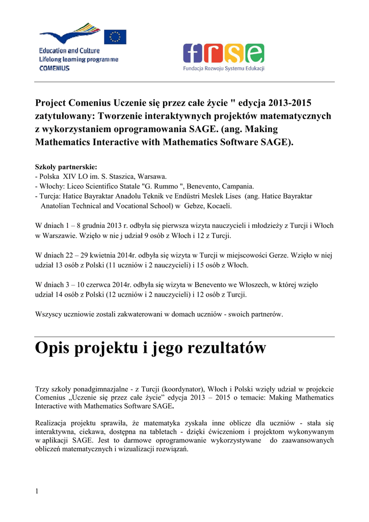 Project Comenius Uczenie się przez całe życie " edycja 2013-2015 zatytułowany: Tworzenie interaktywnych projektów matematycznych z wykorzystaniem oprogramowania SAGE. (ang. Making Mathematics Interactive with Mathematics Software SAGE). Szkoły partnerskie: - Polska XIV LO im. S. Staszica, Warsawa. - Włochy: Liceo Scientifico Statale "G. Rummo ", Benevento, Campania. - Turcja: Hatice Bayraktar Anadolu Teknik ve Endüstri Meslek Lises (ang. Hatice Bayraktar Anatolian Technical and Vocational School) w Gebze, Kocaeli. W dniach 1 – 8 grudnia 2013 r. odbyła się pierwsza wizyta nauczycieli i młodzieży z Turcji i Włoch w Warszawie. Wzięło w nie j udział 9 osób z Włoch i 12 z Turcji. W dniach 22 – 29 kwietnia 2014r. odbyła się wizyta w Turcji w miejscowości Gerze. Wzięło w niej udział 13 osób z Polski (11 uczniów i 2 nauczycieli) i 15 osób z Włoch. W dniach 3 – 10 czerwca 2014r. odbyła się wizyta w Benevento we Włoszech, w której wzięło udział 14 osób z Polski (12 uczniów i 2 nauczycieli) i 12 osób z Turcji. Wszyscy uczniowie zostali zakwaterowani w domach uczniów - swoich partnerów. Opis projektu i jego rezultatów Trzy szkoły ponadgimnazjalne - z Turcji (koordynator), Włoch i Polski wzięły udział w projekcie Comenius „Uczenie się przez całe życie” edycja 2013 – 2015 o temacie: Making Mathematics Interactive with Mathematics Software SAGE. Realizacja projektu sprawiła, że matematyka zyskała inne oblicze dla uczniów - stała się interaktywna, ciekawa, dostępna na tabletach - dzięki ćwiczeniom i projektom wykonywanym w aplikacji SAGE. Jest to darmowe oprogramowanie wykorzystywane do zaawansowanych obliczeń matematycznych i wizualizacji rozwiązań. 1 Nauczyciele krajów partnerskich współpracując w planowaniu realizacji projektu wypracowali metodyczno-dydaktyczne programy zajęć, czuwali nad pracami uczniów i przygotowywaniem materiałów. Przedstawili harmonogramy wizyt partnerskich. Każda ze szkół wybrała temat wiodący na wykład (Polska – teoria chaosu, Turcja statystykę a Włochy algebrę). Przygotowane zostały zajęcia warsztatowe dla uczniów, prezentacje, filmy i instrukcje do ćwiczeń. Tematyka projektu obejmowała wykorzystanie oprogramowania SAGE i skryptów w języku Pyton do wykonywania złożonych obliczeń, rysowania wykresów z użyciem elementów programowania pozwalających na tworzenie projektów interaktywnych realizowane na urządzeniach mobilnych i komputerach. Wizualizacja rozwiązań i możliwość zmiany zadanych parametrów pozwoliła na głębszą analizę rozwiązań. W każdym kraju zrealizowane zostały 8-dniowe wizyty partnerskie. Uczniowie mieszkali w rodzinach partnerskich, co pozwoliło im poznać się i zaprzyjaźnić. Komunikowali się w języku angielskim. Uczestniczyli w programie naukowym, kulturalno-poznawczym i integracyjnym. Spotkania dostarczyły im wielu pozytywnych wrażeń, pozwoliły poznać kulturę i obyczaje, wspólnie się uczyć i bawić, zebrać nowe doświadczenia i zdobyć nowych przyjaciół. Poznali systemy edukacyjne krajów partnerskich, organizację zajęć szkolnych, obejrzeli przygotowane przez partnerów prezentacje multimedialne o każdym z państw. Prezentacje z danymi geopolitycznymi, pokazami i filmami o obyczajach, zabytkach, historii, folklorze, przyrodzie, kuchni, sławnych ludziach, muzyce i religii. Każda szkoła zorganizowała koncert muzyczny, minilekcję językową, wspólne zwiedzanie zabytków i muzeów oraz spotkania integracyjne. Podczas pierwszej wizyty (w grudniu 2013 r.) w Warszawie uczestnicy projektu zwiedzili miasto i muzea, a na Politechnice Warszawskiej uczestniczyli w pokazach robotów, w których wzięli udział uczniowie LO Staszica. Były warsztaty lepienia pierogów i pieczenia szarlotki, gra miejska, przejażdżka po mieście wynajętym tramwajem i nauka tańca Polonez w strojach z epoki. Kolejna wizyta (kwiecień 2014) odbyła się w Turcji, w miejscowości Gerze. Największe wrażenie na uczniach zrobiło zwiedzanie Stambułu, jego muzeów i zabytków. Były także pokazy tanecznego zespołu folklorystycznego, rejs statkiem, wizyta w fabryce i instytucie badającym trzęsienia ziemi. Wszystkich ujęła gościnność i kuchnia Turecka. Ostatnia wizyta partnerska odbyła się w czerwcu 2014 r. w Liceum w Benevento we Włoszech. Ona także dostarczyła uczestnikom niezapomnianych przeżyć. W programie było zwiedzanie Benevento, Neapolu i Pompei. Były warsztaty archeologiczne i kulinarne, wspólne tańce i śpiewanie, gra w siatkówkę i wizyta w szkole kulinarnej. 2 Wszystkie mobilności zostały zrealizowane. Było wiele wspólnych przeżyć i wzruszeń, uczniowie pomagali sobie i w nauce, pracując w międzynarodowych zespołach ale także pomagali sobie w sytuacjach codziennych, wzajemnej komunikacji, odkrywaniu swoich różnic i podobieństw. Podczas wizyt uczestnicy spędzali wieczory na wspólnych kolacjach i dyskusjach. Po każdym spotkaniu partnerów było wiele wzruszających pożegnań, świadczących o zadzierzgniętych przyjacielskich więzach. Podczas wyjazdów powstało wiele zdjęć i filmów, które zostały opublikowane na stronach szkolnych i portalach społecznościowych Z podróży pozostało wiele miłych wspomnień, a uczniowie komunikują się na portalach społecznościowych również po zakończeniu projektu. Jeden z polskich uczniów, który gra w zespole muzycznym zaprosił swojego partnera z Turcji na swój koncert, muzykowali razem i ustalili prywatne wyjazdy wakacyjne. Wymiana doświadczeń nauczycieli wpłynęła na doskonalenie ich warsztatu zawodowego oraz wzbogacenie i uatrakcyjnienie oferty edukacyjnej szkół o innowacje pedagogiczne z wykorzystaniem nowych technologii w nauczaniu matematyki. Rezultaty projektu zostały zaprezentowane podczas wizyt partnerskich, umieszczone w gablotach i na zewnętrznych tablicach informacyjnych, na stronach internetowych szkół, przekazane na zebrania