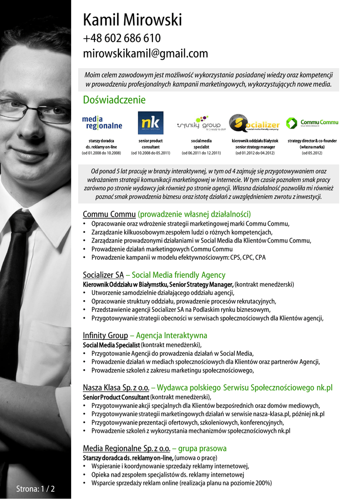 Kamil Mirowski +48 602 686 610 [email protected] Moim celem zawodowym jest możliwość wykorzystania posiadanej wiedzy oraz kompetencji w prowadzeniu profesjonalnych kampanii marketingowych, wykorzystujących nowe media. Doświadczenie starszy doradca ds. reklamy on-line (od 01.2008 do 10.2008) senior product consultant (od 10.2008 do 05.2011) social media specialist (od 06.2011 do 12.2011) kierownik oddziału Białystok senior strategy manager (od 01.2012 do 04.2012) strategy director & co-founder (własna marka) (od 05.2012) Od ponad 5 lat pracuję w branży interaktywnej, w tym od 4 zajmuję się przygotowywaniem oraz wdrażaniem strategii komunikacji marketingowej w Internecie. W tym czasie poznałem smak pracy zarówno po stronie wydawcy jak również po stronie agencji. Własna działalność pozwoliła mi również poznać smak prowadzenia biznesu oraz istotę działań z uwzględnieniem zwrotu z inwestycji. Commu Commu (prowadzenie własnej działalności) • • • • • Opracowanie oraz wdrożenie strategii marketingowej marki Commu Commu, Zarządzanie kilkuosobowym zespołem ludzi o różnych kompetencjach, Zarządzanie prowadzonymi działaniami w Social Media dla Klientów Commu Commu, Prowadzenie działań marketingowych Commu Commu Prowadzenie kampanii w modelu efektywnościowym: CPS, CPC, CPA Socializer SA – Social Media friendly Agency Kierownik Oddziału w Białymstku, Senior Strategy Manager, (kontrakt menedżerski) • Utworzenie samodzielnie działającego oddziału agencji, • Opracowanie struktury oddziału, prowadzenie procesów rekrutacyjnych, • Przedstawienie agencji Socializer SA na Podlaskim rynku biznesowym, • Przygotowywanie strategii obecności w serwisach społecznościowych dla Klientów agencji, Infinity Group – Agencja Interaktywna Social Media Specialist (kontrakt menedżerski), • Przygotowanie Agencji do prowadzenia działań w Social Media, • Prowadzenie działań w mediach społecznościowych dla Klientów oraz partnerów Agencji, • Prowadzenie szkoleń z zakresu marketingu społecznościowego, Nasza Klasa Sp. z o.o. – Wydawca polskiego Serwisu Społecznościowego nk.pl Senior Product Consultant (kontrakt menedżerski), • Przygotowywanie akcji specjalnych dla Klientów bezpośrednich oraz domów mediowych, • Przygotowywanie strategii marketingowych działań w serwisie nasza-klasa.pl, później nk.pl • Przygotowywanie prezentacji ofertowych, szkoleniowych, konferencyjnych, • Prowadzenie szkoleń z wykorzystania mechanizmów społecznościowych nk.pl Media Regionalne Sp. z o.o. – grupa prasowa Strona: 1 / 2 Starszy doradca ds. reklamy on-line, (umowa o pracę) • Wspieranie i koordynowanie sprzedaży reklamy internetowej, • Opieka nad zespołem specjalistów ds. reklamy internetowej • Wsparcie sprzedaży reklam online (realizacja planu na poziomie 200%) Wykształcenie Szkoła Główna Handlowa w Warszawie, Marketing Internetowy (Studia Podyplomowe) Praca: „Budowanie lojalnej społeczności w serwisach społecznościowych na podstawie serwisu Nasza-Klasa.pl” Wyższa Szkoła Ekonomiczna w Białymstoku, Stosunki Międzynarodowe (Dziennikarstwo i Komunikacja Masowa) Praca: „Od awanturnika do lidera III siły politycznej w Polsce. Medialna zmiana wizerunku Andrzeja Leppera” Kompetencje Podstawowe umiejętności • • • • • Koordynowanie pracy zespołu pracowników o różnych kompetencjach, Opracowywanie strategii komunikacji marek w Internecie Przygotowywanie oraz prowadzenie prezentacji handlowych, branżowych, konferencyjnych Prowadzenie szkoleń Opracowywanie kampanii marketingowych w Internecie w modelach efektywnościowych Znajomość aplikacji: słabo dobrze bardzo dobrze • MS Power point • MS Excel • MS Word • Adobe Photoshop Elements • Adobe Photoshop CS5 • Google Analytics Języki obce: • j. angielski – dobry w mowie i piśmie • j. niemiecki – podstawowy Ciekawostki on-line: • • • • • • blog 365piw.pl: www.365piw.pl, www.fb.com/365piw, blog o marketingu: www.MrSocial.pl spotkania Białostocki Czwartek Social Media, własna działalność: www.fb.com/commucommu.co, CommuCommu.co, wystąpienia: EastCamp, Shopcamp, Strefa Biznesu: Zbuduj społeczność wokół swojej marki, SM: Wizerunek z konkretnym celem, Zainteresowania: • • • • marketing internetowy, nowoczesne formy reklamy, nowe technologie, psychologia komunikacji, • • • • grafika komputerowa, żeglarstwo, trekking górski i nizinny, dogtrekking Wyrażam zgodę na przetwarzanie moich danych osobowych zawartych w mojej ofercie pracy dla potrzeb niezbędnych do realizacji procesu rekrutacji zgodnie z Ustawą z dn. 29.08.1997 roku o ochronie danych osobowych (Dz.U. z 2002 r. nr 101, poz.926, ze zm) Strona: 2 / 2