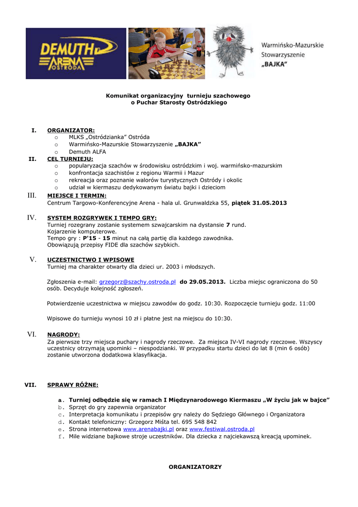 Komunikat organizacyjny turnieju szachowego o Puchar Starosty Ostródzkiego I. II. ORGANIZATOR: o MLKS „Ostródzianka” Ostróda o Warmińsko-Mazurskie Stowarzyszenie „BAJKA” o Demuth ALFA CEL TURNIEJU: o popularyzacja szachów w środowisku ostródzkim i woj. warmińsko-mazurskim o konfrontacja szachistów z regionu Warmii i Mazur o rekreacja oraz poznanie walorów turystycznych Ostródy i okolic o udział w kiermaszu dedykowanym światu bajki i dzieciom III. MIEJSCE I TERMIN: Centrum Targowo-Konferencyjne Arena - hala ul. Grunwaldzka 55, piątek 31.05.2013 IV. SYSTEM ROZGRYWEK I TEMPO GRY: Turniej rozegrany zostanie systemem szwajcarskim na dystansie 7 rund. Kojarzenie komputerowe. Tempo gry : P'15 - 15 minut na całą partię dla każdego zawodnika. Obowiązują przepisy FIDE dla szachów szybkich. V. UCZESTNICTWO I WPISOWE Turniej ma charakter otwarty dla dzieci ur. 2003 i młodszych. Zgłoszenia e-mail: [email protected] do 29.05.2013. Liczba miejsc ograniczona do 50 osób. Decyduje kolejność zgłoszeń. Potwierdzenie uczestnictwa w miejscu zawodów do godz. 10:30. Rozpoczęcie turnieju godz. 11:00 Wpisowe do turnieju wynosi 10 zł i płatne jest na miejscu do 10:30. VI. VII. NAGRODY: Za pierwsze trzy miejsca puchary i nagrody rzeczowe. Za miejsca IV-VI nagrody rzeczowe. Wszyscy uczestnicy otrzymają upominki – niespodzianki. W przypadku startu dzieci do lat 8 (min 6 osób) zostanie utworzona dodatkowa klasyfikacja. SPRAWY RÓŻNE: a. b. c. d. e. f. Turniej odbędzie się w ramach I Międzynarodowego Kiermaszu „W życiu jak w bajce” Sprzęt do gry zapewnia organizator Interpretacja komunikatu i przepisów gry należy do Sędziego Głównego i Organizatora Kontakt telefoniczny: Grzegorz Miśta tel. 695 548 842 Strona internetowa www.arenabajki.pl oraz www.festiwal.ostroda.pl Mile widziane bajkowe stroje uczestników. Dla dziecka z najciekawszą kreacją upominek. ORGANIZATORZY