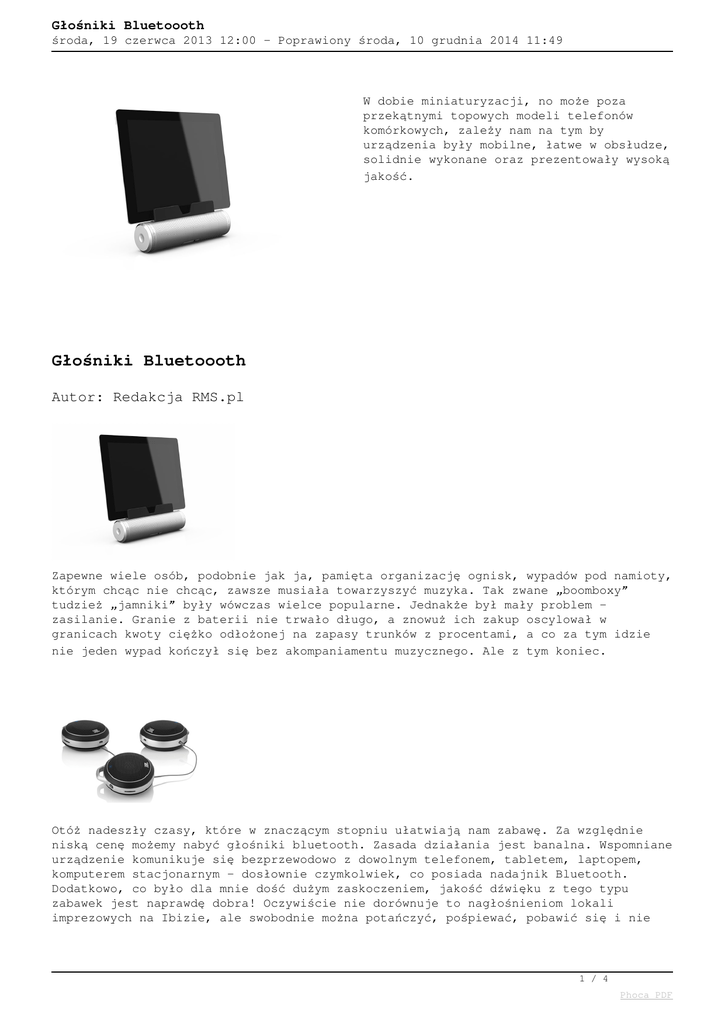 Głośniki Bluetoooth środa, 19 czerwca 2013 12:00 - Poprawiony środa, 10 grudnia 2014 11:49 W dobie miniaturyzacji, no może poza przekątnymi topowych modeli telefonów komórkowych, zależy nam na tym by urządzenia były mobilne, łatwe w obsłudze, solidnie wykonane oraz prezentowały wysoką jakość. Głośniki Bluetoooth Autor: Redakcja RMS.pl Zapewne wiele osób, podobnie jak ja, pamięta organizację ognisk, wypadów pod namioty, którym chcąc nie chcąc, zawsze musiała towarzyszyć muzyka. Tak zwane „boomboxy” tudzież „jamniki” były wówczas wielce popularne. Jednakże był mały problem – zasilanie. Granie z baterii nie trwało długo, a znowuż ich zakup oscylował w granicach kwoty ciężko odłożonej na zapasy trunków z procentami, a co za tym idzie nie jeden wypad kończył się bez akompaniamentu muzycznego. Ale z tym koniec. Otóż nadeszły czasy, które w znaczącym stopniu ułatwiają nam zabawę. Za względnie niską cenę możemy nabyć głośniki bluetooth. Zasada działania jest banalna. Wspomniane urządzenie komunikuje się bezprzewodowo z dowolnym telefonem, tabletem, laptopem, komputerem stacjonarnym – dosłownie czymkolwiek, co posiada nadajnik Bluetooth. Dodatkowo, co było dla mnie dość dużym zaskoczeniem, jakość dźwięku z tego typu zabawek jest naprawdę dobra! Oczywiście nie dorównuje to nagłośnieniom lokali imprezowych na Ibizie, ale swobodnie można potańczyć, pośpiewać, pobawić się i nie 1 / 4 Phoca PDF Głośniki Bluetoooth środa, 19 czerwca 2013 12:00 - Poprawiony środa, 10 grudnia 2014 11:49 będziemy odczuwać dyskomfortu z powodu rażąco słabej jakości dźwięku. Urządzenia te nie są drogie – ceny zaczynają się już od 365,00 zł np. popularna SOF-a od Roth Audio. Produkt ten pozwala na emisję dźwięku dostarczonego poprzez bluetooth z smartfona. Powstały również niewiarygodne produkty, które mogą posłużyć nam jako mini instalacja audio, chociażby w kuchni, na tarasie, gdziekolwiek gdzie posiadamy kontakt 230V. Tutaj na myśli mam zabawkę od JBL-a – Soundfly. Parowanie z nadajnikiem trwa dosłownie chwilę, po czym możemy się cieszyć naprawdę dobrą jakością dźwięku. Nawiązując do tarasu, pamiętajmy, że urządzenie to nie jest wodoodporne – nie dajmy się ponieść emocjom. Kosztuje jedynie 699,00 zł, na noc lepiej zabrać je do domu. Pora na deser. Pozwolę wyrazić swoją skromną opinię i przedstawię faworyta z kategorii opisywanych przeze mnie zabawek w przedziale cenowym do 500 zł. JBL Flip. Poezja. Głośnik bazujący na transmisji bluetooth z dodatkowo wbudowanym mikrofonem i przyciskiem do odbierania rozmów! Plus rewelacyjna jakość dźwięku. Czego chcieć więcej w tej cenie? Dosłownie niczego. Flip jest solidnie zrobiony, można go zabrać wszędzie i posiada wyjątkowo nowoczesny design. Kuchnia, garaż, łazienka, ognisko – można by bez końca wymyślać miejsce zastosowania tego cudeńka. Dodatkowo posiada wejście AUX 3,5mm jack stereo pozwalające podpiąć jakikolwiek odtwarzacz mp3. Nic 2 / 4 Phoca PDF Głośniki Bluetoooth środa, 19 czerwca 2013 12:00 - Poprawiony środa, 10 grudnia 2014 11:49 tylko brać. Osobiście od razu się skusiłem, na ten produkt. W odwodzie mamy jeszcze JBL Charge – przenośny akumulator z głośnikami. Gra bez przerw kilkanaście godzin bez ładowania lub krócej i ładuje smartfony i tablety. Oczywiście rozważaliśmy całość patrząc przez pryzmat zabawy i rozrywki. Ja również widzę profesjonalne rozwiązanie tychże urządzeń. Ile razy, czy to na kursie języka angielskiego, czy za pradawnych czasów szkoły średniej, był problem z odtwarzaczami materiałów audio dla lektorów lub jakiegokolwiek belfra. Lektorzy często ze względu na fakt, że muszą dużo jeździć po klientach nie zabierali ze sobą „jamników”. Teraz to żaden problem. Hyc, wrzucamy taki głośnik do torebki lub nesesera i po sprawie. Najmniejsze tego typu głośniki, JBL Micro Wireless, mają zaledwie 83mm szerokości! A do kompletu wystarczy zgrać potrzebne nam pliki na telefon z bluetooth. Podsumowując. Jesteśmy na TAK dla tego typu rozwiązań. Ich prostota jest czymś co sprawa, iż są genialne i na pewno ułatwią oraz umilą codzienny byt. Polecamy. Produkty użyte w artykule: 1. Roth SOF-a http://sklep.rms.pl/index.php?p11231,roth-audio-sof-a-sofa-bezprzewodo 3 / 4 Phoca PDF Głośniki Bluetoooth środa, 19 czerwca 2013 12:00 - Poprawiony środa, 10 grudnia 2014 11:49 wy-glosnik-kolumna-bluetooth 2. JBL Flip http://sklep.rms.pl/index.php?p11341,jbl-flip-bezprzewodowy-aktywny-gl osnik-kolumna-z-bluetooth-i-mikrofonem 3. JBL Soundfly http://sklep.rms.pl/index.php?p11270,jbl-soundfly-bt-bezprzewodowy-akt ywny-glosnik-kolumna-z-bluetooth-multiroom 4. JBL MicroWireless http://sklep.rms.pl/index.php?p11342,jbl-micro-wireless-kieszonkowy-gl osnik-z-bluetooth 5. JBL Charge http://sklep.rms.pl/index.php?p11882,jbl-charge-bezprzewodowy-glosnik-kolumna-z-bluet ooth-z-akumulatorem 4 / 4 Phoca PDF
