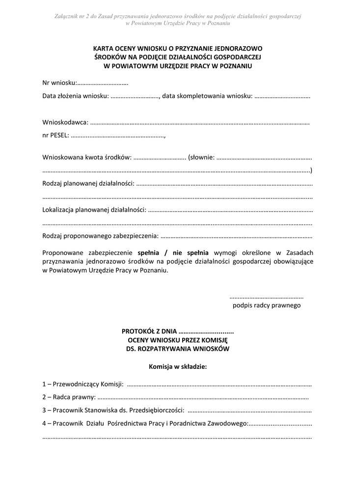 Załącznik nr 2 do Zasad przyznawania jednorazowo środków na podjęcie działalności gospodarczej w Powiatowym Urzędzie Pracy w Poznaniu KARTA OCENY WNIOSKU O PRZYZNANIE JEDNORAZOWO ŚRODKÓW NA PODJĘCIE DZIAŁALNOŚCI GOSPODARCZEJ W POWIATOWYM URZĘDZIE PRACY W POZNANIU Nr wniosku:…………………………. Data złożenia wniosku: ……………………….., data skompletowania wniosku: ……………………………. Wnioskodawca: ……………………………………………………………………………………………………………………. nr PESEL: ………...…………………………………….., Wnioskowana kwota środków: ………………………….. (słownie: …………………………………………………. ……………………………………………………………………………………………………….……………………………………..) Rodzaj planowanej działalności: …………………………………….………………………………………………………. ………………………………………………………………………………..…….…………………………………..………………..... Lokalizacja planowanej działalności: …………………………………….………………………………………………… …………………………………………………………………………………………..………………………………………………..... Rodzaj proponowanego zabezpieczenia: …………………………..…………………………………………………… Proponowane zabezpieczenie spełnia / nie spełnia wymogi określone w Zasadach przyznawania jednorazowo środków na podjęcie działalności gospodarczej obowiązujące w Powiatowym Urzędzie Pracy w Poznaniu. ……………………………………… podpis radcy prawnego PROTOKÓŁ Z DNIA ………………............. OCENY WNIOSKU PRZEZ KOMISJĘ DS. ROZPATRYWANIA WNIOSKÓW Komisja w składzie: 1 – Przewodniczący Komisji: ………………………………………………………………………………………….……… 2 – Radca prawny: ………….……………………………………………………………………………………………………. 3 – Pracownik Stanowiska ds. Przedsiębiorczości: ……………..………………………….……………………… 4 – Pracownik Działu Pośrednictwa Pracy i Poradnictwa Zawodowego:………........................... ………………………………………………………….……………………………………………………..……………………………. dokonała oceny wniosku: Komisja przyznaje punkty w kryteriach: Ocena formalna KRYTERIUM OGÓLNE KRYTERIUM SZCZEGÓŁOWE 1.Spełnia warunki ubiegania się o środki na podjęcie działalności gospodarczej, w tym zabezpieczenie 2.Wniosek jest kompletny i prawidłowo sporządzony Spełnia Nie spełnia 3. Zgodność planu przedsięwzięcia z wzorem obowiązującym w Urzędzie w zakresie wymaganych informacji merytorycznych dotyczących planowanej działalności LICZBA MOŻLIWYCH PUNKTÓW 1 0 Tak Nie Zgodny 1 0 1 Niezgodny 0 LICZBA PUNKTÓW PRZYZNANYCH Ocena merytoryczna jest dokonywana pod warunkiem pozytywnej oceny formalnej wniosku 4.Przygotowanie wnioskodawcy do prowadzenia wybranego rodzaju działalności gospodarczej 5.Celowość, zasadność i racjonalność przeznaczenia wnioskowanych środków ze względu na rodzaj planowanej działalności gospodarczej 6.Możliwość prowadzenia przez wnioskodawcę planowanej działalności gospodarczej przez wymagany okres 12 miesięcy 7.Stwierdzenie pozostawania wnioskodawcy w grupie osób będących w szczególnej sytuacji na rynku pracy, tj. wymienionych w art. 49 Ustawy o promocji zatrudnienia i instytucjach rynku pracy* 8. Miejsce wykonywania działalności 9.Udział środków własnych Suma punktów: Posiadanie przygotowania zawodowego ( np. świadectwa ukończenia szkoły, dyplomy, certyfikaty, świadectwa pracy, umowy zlecenia, umowy o dzieło, umowy dotyczące zawartych kontraktów, listy polecające zawierające potwierdzenie przygotowania wnioskodawcy z jednoczesną deklaracją współpracy, referencje, zaświadczenia) Brak przygotowania zawodowego Zasadne 1 Niezasadne 0 Pozytywnie 1 Negatywnie 0 Należy do grupy osób wymienionych w art.49 Ustawy o promocji zatrudnienia i instytucjach rynku pracy Nie należy do grupy osób wymienionych w art.49 Ustawy o promocji zatrudnienia i instytucjach rynku pracy 1 Na terenie miasta Poznania i powiatu poznańskiego Poza terenem miasta Poznania i powiatu poznańskiego Posiada środki własne Brak środków własnych 2 0 1 0 1 1 0 Max. 10 * w grupie: bezrobotnych do 30 roku życia, bezrobotnych powyżej 50 roku życia, długotrwale bezrobotnych, bezrobotnych niepełnosprawnych, bezrobotnych posiadających co najmniej jedno dziecko do 6 roku życia lub co najmniej jedno dziecko niepełnosprawne do 18 roku życia, bezrobotnych korzystających ze świadczeń z pomocy społecznej Maksymalna liczba punktów, jaką wniosek może otrzymać to 10 punktów. Wniosek uznaje się za pozytywnie oceniony, jeżeli uzyska minimalną liczbę punktów - 6. Nie uzyskanie punktów w pozycji 1,2,3,4,5,6 powoduje odstąpienie od dalszego rozpatrywania wniosku. Uwagi Komisji: Komisja nie wniosła uwag do oceny / wniosła następujące uwagi: …….…..….….. ……………………………………………………………………………..…………………………………………….……….………... ……………………………………………………………………..……………………..…………………………….…….…………... …………………………………………………..…………………………………