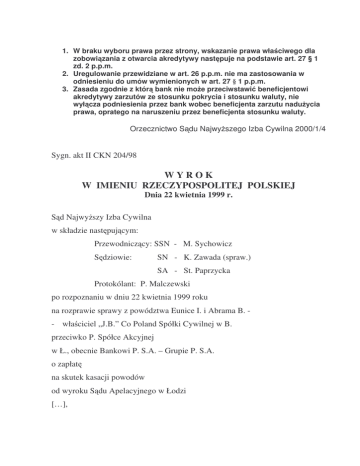 1. W braku wyboru prawa przez strony, wskazanie prawa wła ciwego dla zobowi zania z otwarcia akredytywy nast puje na podstawie art. 27 § 1 zd. 2 p.p.m. 2. Uregulowanie przewidziane w art. 26 p.p.m. nie ma zastosowania w odniesieniu do umów wymienionych w art. 27 § 1 p.p.m. 3. Zasada zgodnie z któr bank nie mo e przeciwstawi beneficjentowi akredytywy zarzutów ze stosunku pokrycia i stosunku waluty, nie wył cza podniesienia przez bank wobec beneficjenta zarzutu nadu ycia prawa, opratego na naruszeniu przez beneficjenta stosunku waluty. Orzecznictwo S du Najwy szego Izba Cywilna 2000/1/4 Sygn. akt II CKN 204/98 WYROK W IMIENIU RZECZYPOSPOLITEJ POLSKIEJ Dnia 22 kwietnia 1999 r. S d Najwy szy Izba Cywilna w składzie nast puj cym: Przewodnicz cy: SSN - M. Sychowicz S dziowie: SN - K. Zawada (spraw.) SA - St. Paprzycka Protokólant: P. Malczewski po rozpoznaniu w dniu 22 kwietnia 1999 roku na rozprawie sprawy z powództwa Eunice I. i Abrama B. - wła ciciel „J.B.” Co Poland Spółki Cywilnej w B. przeciwko P. Spółce Akcyjnej w Ł., obecnie Bankowi P. S.A. – Grupie P. S.A. o zapłat na skutek kasacji powodów od wyroku S du Apelacyjnego w Łodzi […], 2 oddala kasacj i zas dza solidarnie od powodów na rzecz strony pozwanej kwot 1000 (jeden tysi c) zł tytułem zwrotu kosztów post powania kasacyjnego UZASADNIENIE Po ostatecznym ukształtowaniu swego dania pismem z dnia 29 pa dziernika 1996 r., powodowie domagali si zas dzenia od pozwanego banku 62486,82 zł z ustawowymi odsetkami od 10 listopada 1994 r. Uzasadniaj c to danie wskazali, e ponie li w wymienionej wysoko ci szkod , za któr odpowiada pozwany; szkoda ta wynikła, jak twierdzili, z niewła ciwego wykonania akredytywy otwartej przez pozwanego dla powodów. Apelacja powodów od wyroku S du Wojewódzkiego z dnia 5 marca 1997 r., oddalaj cego ich powództwo, została równie oddalona, zaskar onym wyrokiem. U podstaw obydwu wyroków le nast puj ce ustalenia: W sierpniu 1994 r. powodowie zawarli umow z firm E. Inc. z Los Angeles o dostaw na ich rzecz obuwia o ł cznej warto ci 54045 USD. W zwi zku z t umow , powodowie zlecili 22 sierpnia 1994 r. pozwanemu bankowi otwarcie nieodwołalnej akredytywy na kwot 27022,50 USD (połowa umówionej ceny obuwia). Jako beneficjenta akredytywy wskazali firm E., a jako bank awizuj cy i potwierdzaj cy Republic National Bank of New York. Akredytywa miała by dost pna w wymienionym dopiero co banku przez zapłat odroczon - 75 dni po dacie wystawienia konosamentu. Zabezpieczenie akredytywy stanowiła blokada kwoty 27022,50 USD na rachunku Abrama B. w Banku P. S.A. w Ł. Dnia 31 sierpnia 1994 r. strony dokonały zmiany warunków akredytywy w dwóch punktach: przedłu yły termin wa no ci akredytywy do 30 wrze nia 1994 r. oraz zmodyfikowały sposób jej realizacji, wprowadzaj c trat 3 ci gnion na Republic National Bank of New York, przy zachowaniu odroczenia płatno ci - 75 dni po dacie wystawienia konosamentu. Zlecenie otwarcia akredytywy nast piło z zastrze eniem stosowania do niej Jednolitych zwyczajów i praktyki dotycz cych akredytyw dokumentowych - wersja z 1993 r., publikacja nr 500 Mi dzynarodowej Izby Handlowej (dalej powoływanych tak e za pomoc skrótu j.z.p.a.d). W dniu 27 wrze nia 1994 r. pozwany powiadomił powodów, e otrzymał od Republic National Bank of New York dokumenty warunkuj ce zapłat akredytywy z usterkami, i opisuj c te usterki za dał od powodów, aby do 28 wrze nia 1994 r. powiadomili pozwanego, czy „znosz ” zastrze enia upowa niaj w odniesieniu do wspomnianych dokumentów, i go do dokonania zapłaty zgodnie z tre ci akredytywy. W dniu 28 wrze nia 1994 r. powodowie powiadomili pozwany bank, e „znosz ” zastrze enia w odniesieniu do dokumentów przesłanych przez bank nowojorski i upowa niaj pozwanego do dokonania zapłaty zgodnie z warunkami akredytywy. Pismem z tej samej daty pozwany upowa nił Republic National Bank of New York do zapłaty 27022,50 USD zgodnie z warunkami akredytywy. Dnia 6 pa dziernika 1994 r. do Urz du Celnego w Ł. dotarł kontener przeznaczony dla powodów, w którym miały znajdowa si buty, był on jednak pusty. Pusty okazał si tak e drugi kontener od dostawcy powodów z Los Angeles. W rozmowach, jakie prowadziły strony przed otwarciem akredytywy, pozwany bank sugerował, aby do wymaganych dokumentów, warunkuj cych zapłat sumy akredytywy, wł czy dokument kontroli załadunku, sporz dzony przez firm zajmuj c si tego rodzaju działalno ci . Powodowie tej propozycji jednak nie przyj li. Pismem z 20 pa dziernika 1994 r. adwokat Jerzy S. zło ył wobec pozwanego banku w imieniu powodów o wiadczenie o uchyleniu si „od skutków prawnych o wiadczenia woli zawartego w akredytywie importowej nr 03/IMP 88/94 w zakresie zobowi zania do zapłaty kwoty 27022,50 USD”, powołuj c si na prób oszukania powodów przez firm ameryka sk . Pozwany odmówił ustosunkowania si do tego o wiadczenia, zasłaniaj c si 4 tajemnic bankow oraz powołuj c si na brak umocowania adwokata Jerzego S. do reprezentowania powodów. Nast pnie, w dniu 2 listopada 1994 r. powodowie wnie li pozew o ustalenie prawa poł czony z wnioskiem o wydanie zarz dzenia tymczasowego. Postanowieniem z 7 listopada 1994 r. S d Wojewódzki zabezpieczył powództwo przez nakazanie pozwanemu bankowi wstrzymania zapłaty 27022,50 USD tytułem akredytywy. Dnia 9 listopada 1994 r. pozwany zwrócił si do Republic National Bank of New York o wstrzymanie płatno ci. Nazajutrz otrzymał odpowied , e spełnienie tego jest niemo liwe, poniewa Republic National Bank of New York akceptował wystawion na niego trat i został upowa niony do obci enia sum wekslow rachunku pozwanego w dacie płatno ci odroczonej, przypadaj cej wła nie na 10 listopada 1994 r. Postanowieniem z 4 stycznia 1995 r. S d Apelacyjny uchylił postanowienie S du Wojewódzkiego w przedmiocie zabezpieczenia powództwa, uznaj c orzeczony sposób zabezpieczenia za niewykonalny. S d Apelacyjny podzielił stanowisko S du Wojewódz