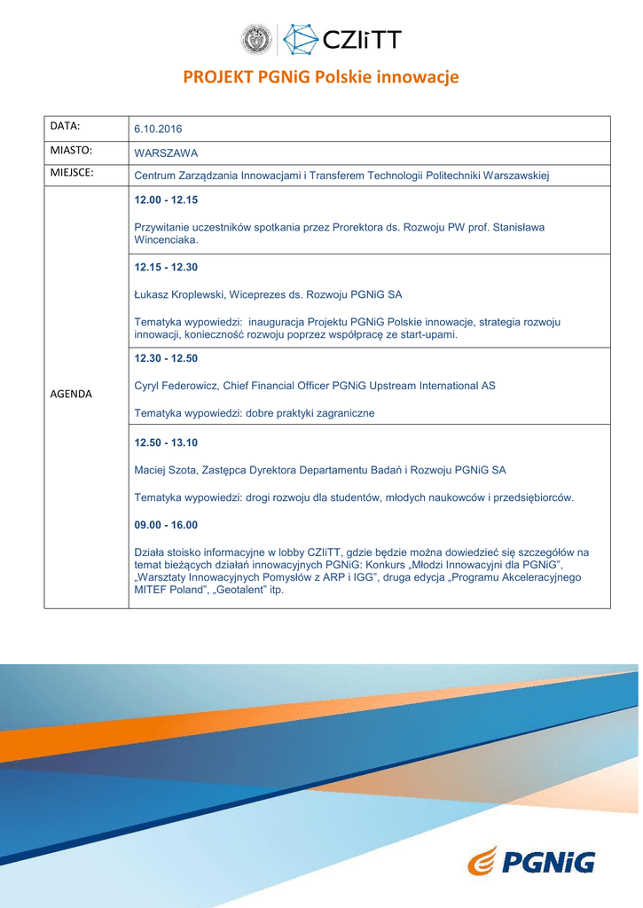 PROJEKT PGNiG Polskie innowacje DATA: 6.10.2016 MIASTO: WARSZAWA MIEJSCE: Centrum Zarządzania Innowacjami i Transferem Technologii Politechniki Warszawskiej 12.00 - 12.15 Przywitanie uczestników spotkania przez Prorektora ds. Rozwoju PW prof. Stanisława Wincenciaka. 12.15 - 12.30 Łukasz Kroplewski, Wiceprezes ds. Rozwoju PGNiG SA Tematyka wypowiedzi: inauguracja Projektu PGNiG Polskie innowacje, strategia rozwoju innowacji, konieczność rozwoju poprzez współpracę ze start-upami. 12.30 - 12.50 AGENDA Cyryl Federowicz, Chief Financial Officer PGNiG Upstream International AS Tematyka wypowiedzi: dobre praktyki zagraniczne 12.50 - 13.10 Maciej Szota, Zastępca Dyrektora Departamentu Badań i Rozwoju PGNiG SA Tematyka wypowiedzi: drogi rozwoju dla studentów, młodych naukowców i przedsiębiorców. 09.00 - 16.00 Działa stoisko informacyjne w lobby CZIiTT, gdzie będzie można dowiedzieć się szczegółów na temat bieżących działań innowacyjnych PGNiG: Konkurs „Młodzi Innowacyjni dla PGNiG”, „Warsztaty Innowacyjnych Pomysłów z ARP i IGG”, druga edycja „Programu Akceleracyjnego MITEF Poland”, „Geotalent” itp.
