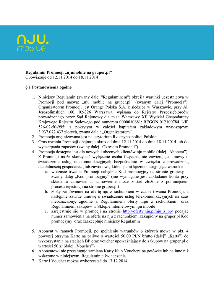 Regulamin Promocji „njumobile na gruper.pl” Obowiązuje od 12.11.2014 do 18.11.2014 § 1 Postanowienia ogólne 1. Niniejszy Regulamin (zwany dalej "Regulaminem") określa warunki uczestnictwa w Promocji pod nazwą: „nju mobile na gruper.pl” (zwanym dalej "Promocją"). Organizatorem Promocji jest Orange Polska S.A. z siedzibą w Warszawie, przy Al. Jerozolimskich 160, 02-326 Warszawa, wpisana do Rejestru Przedsiębiorców prowadzonego przez Sąd Rejonowy dla m.st. Warszawy XII Wydział Gospodarczy Krajowego Rejestru Sądowego pod numerem 0000010681; REGON 012100784, NIP 526-02-50-995; z pokrytym w całości kapitałem zakładowym wynoszącym 3.937.072.437 złotych, zwana dalej: „Organizatorem”. 2. Promocja organizowana jest na terytorium Rzeczypospolitej Polskiej. 3. Czas trwania Promocji obejmuje okres od dnia 12.11.2014 do dnia 18.11.2014 lub do wyczerpania zapasów (zwany dalej „Okresem Promocji”) 4. Promocja dostępna jest dla nowych i obecnych klientów nju mobile (dalej „Abonent”). Z Promocji może skorzystać wyłącznie osoba fizyczna, nie zawierająca umowy o świadczenie usług telekomunikacyjnych bezpośrednio w związku z prowadzoną działalnością gospodarczą lub zawodową, która spełni łącznie następujące warunki: a. w czasie trwania Promocji nabędzie Kod promocyjny na stronie gruper.pl , zwany dalej „Kod promocyjny” (nie wymagane jest zakładanie konta przy składaniu zamówienia; zamówienie może zostać złożone z pominięciem procesu rejestracji na stronie gruper.pl) b. złoży zamówienie na ofertę nju z rachunkiem w czasie trwania Promocji, a następnie zawrze umowę o świadczenie usług telekomunikacyjnych na czas nieoznaczony, zgodnie z Regulaminem oferty „nju z rachunkiem” oraz Regulaminem zakupów w Sklepie internetowym nju mobile c. zarejestruje się w promocji na stronie http://oferty.nju.pl/nju_z_bp/ podając numer zamówienia na ofertę na nju z rachunkiem, zakupiony na gruper.pl Kod promocyjny oraz zaakceptuje niniejszy Regulamin 5. Abonent w ramach Promocji, po spełnieniu warunków o których mowa w pkt. 4 powyżej otrzyma Kartę na paliwo o wartości 50,00 PLN brutto (dalej” „Karta”) do wykorzystania na stacjach BP oraz voucher upoważniający do zakupów na gruper.pl o wartości 50 zł (dalej „Voucher”) 6. Abonentowi nie przysługuje zamiana Karty i/lub Vouchera na gotówkę lub na inne niż wskazane w niniejszym Regulaminie świadczenia. 7. Kartę i Voucher można wykorzystać do 17.12.2014 8. Abonent może złożyć maksymalnie jedno zamówienie w ramach niniejszej promocji. Każde kolejne zamówienie złożone przez Abonenta mimo spełnienia warunków opisanych w pkt 4 nie będzie objęte Promocją.. 9. Do procedury składania i realizowania zamówień w sklepie internetowym nju mobile stosuje się Regulamin zakupów w Sklepie Internetowym nju mobile dostępny pod adresem: http://www.njumobile.pl/b/articles/regulaminy/Regulamin-sklepu-internetowegonjumobile.pl.pdf 10. W celu uniknięcia wszelkich wątpliwości Organizator wskazuje, iż przy zawarciu umowy o świadczenie usług telekomunikacyjnej w ofercie innej niż „nju z rachunkiem”, Abonent nie ma możliwości otrzymania Karty.i Vouchera 11. Promocja nie łączy się z innymi promocjami, które umożliwiają otrzymanie kolejnego gadżetu/prezentu/kodu promocyjnego/karty przedpłaconej nie wchodzącej w zakres umowy o świadczenie usług telekomunikacyjnych. § 2 Odbiór Karty i Vouchera 12. Karta i Voucher zostanie wysłana Abonentowi w terminie 14 (czternastu dni kalendarzowych od daty podpisania umowy o świadczenia usług telekomunikacyjnych w nju mobile na adres dostawy podany przy zakupie oferty (zgodnie z Regulaminem zakupów w sklepie internetowym nju mobile, dostępnym pod adresem http://www.njumobile.pl/b/articles/regulaminy/Regulamin-sklepu-internetowegonjumobile.pl.pdf). § 3 Postanowienia końcowe 13. Reklamacje dotyczące Promocji powinny być kierowane: a. na piśmie pod adres:, Organizatora Promocji - Orange Polska S.A., Al. Jerozolimskie 160, 02-326 Warszawa z dopiskiem „Reklamacja – gruper” lub b. drogą mailową na adres [email protected] 14. Reklamacje dotyczące Promocji można składać: a. w okresie jej trwania oraz maksymalnie 30 dni od daty jej zakończenia – w przypadku reklamacji dotyczących przyznawania Karty i Vouchera; b. do 17.12.2014 w przypadku reklamacji dotyczących działania Karty i Vouchera 15. Reklamacje będą rozpatrywane w terminie 30 (trzydziestu) dni od dnia ich zgłoszenia oraz kierowane na adres zwrotny podany przez Abonenta w przesyłanej przez tego Abonenta reklamacji dotyczącej Promocji. Odpowiedzi na reklamacje będą kierowane tym samym kanałem komunikacji jakim została złożona dana reklamacja, jeżeli Abonent nie określił inaczej. 16. Abonent, podpisując Umowę oświadcza, iż wszelkie dane osobowe podane przez niego dla celów realizacji zamówienia w sklepie internetowym nju mobile dotyczą jego osoby i są zgodne ze stanem faktycznym i prawnym oraz, że znane są mu prawne konsekwencje podania nieprawdziwych danych. Administratorem danych osobowych w rozumieniu ustawy o ochronie danych osobowych (Dz.U. 101 poz. 926 z 2002r. z późniejszymi zmianami) jest Orange Polska S.A. z siedziba w Warszawie przy al. Jerozolimskich 160. 17. Regulamin Promocji dostępny jest na stronie http://oferty.nju.pl/nju_z_bp/ oraz w siedzibie Organizatora. 18. Organizator informuje, iż Karta i Voucher nie stanowi składnika oferty/promocji, w ramach której Abonent zawarł Umowę. Ewentualne roszczenia związane z nieotrzymaniem Karty i Vouchera nie mogą stanowić podstawy do reklamacji z tytułu zawarcia Umowy, a w szczególności nie mogą stanowić podstawy do rozwiązania Umowy o świadczenie usług telekomunikacyjnych przez Abonenta z winy Organizatora. 19. W zakresie nieuregulowanym niniejszym Regulaminem, a dotyczącym korzystania z usług telekomunikacyjnych nju mobile zastosowanie mają 