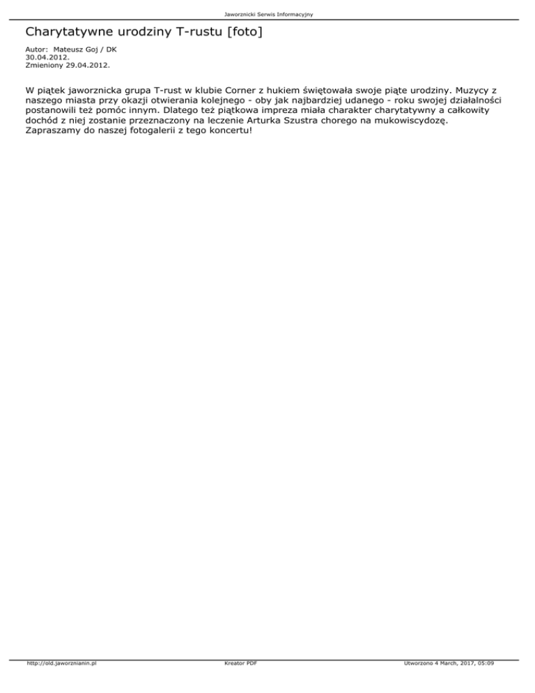 Jaworznicki Serwis Informacyjny Charytatywne urodziny T-rustu [foto] Autor: Mateusz Goj / DK 30.04.2012. Zmieniony 29.04.2012. W piątek jaworznicka grupa T-rust w klubie Corner z hukiem świętowała swoje piąte urodziny. Muzycy z naszego miasta przy okazji otwierania kolejnego - oby jak najbardziej udanego - roku swojej działalności postanowili też pomóc innym. Dlatego też piątkowa impreza miała charakter charytatywny a całkowity dochód z niej zostanie przeznaczony na leczenie Arturka Szustra chorego na mukowiscydozę. Zapraszamy do naszej fotogalerii z tego koncertu! http://old.jaworznianin.pl Kreator PDF Utworzono 4 March, 2017, 05:09