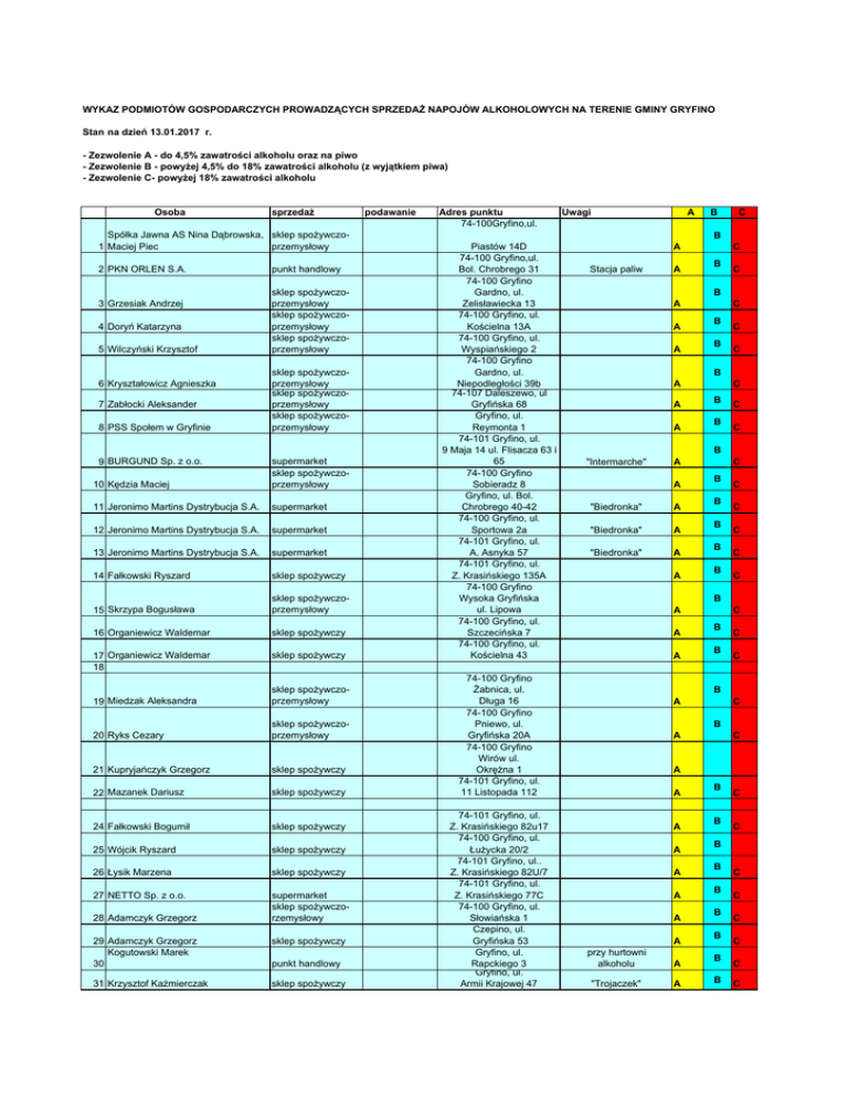 WYKAZ PODMIOTÓW GOSPODARCZYCH PROWADZĄCYCH SPRZEDAŻ NAPOJÓW ALKOHOLOWYCH NA TERENIE GMINY GRYFINO Stan na dzień 13.01.2017 r. - Zezwolenie A - do 4,5% zawatrości alkoholu oraz na piwo - Zezwolenie B - powyżej 4,5% do 18% zawatrości alkoholu (z wyjątkiem piwa) - Zezwolenie C- powyżej 18% zawatrości alkoholu Osoba sprzedaż Spółka Jawna AS Nina Dąbrowska, sklep spożywczoprzemysłowy 1 Maciej Piec 2 PKN ORLEN S.A. 3 Grzesiak Andrzej 4 Doryń Katarzyna 5 Wilczyński Krzysztof 6 Kryształowicz Agnieszka 7 Zabłocki Aleksander 8 PSS Społem w Gryfinie 9 BURGUND Sp. z o.o. 10 Kędzia Maciej punkt handlowy sklep spożywczoprzemysłowy sklep spożywczoprzemysłowy sklep spożywczoprzemysłowy sklep spożywczoprzemysłowy sklep spożywczoprzemysłowy sklep spożywczoprzemysłowy supermarket sklep spożywczoprzemysłowy 11 Jeronimo Martins Dystrybucja S.A. supermarket 12 Jeronimo Martins Dystrybucja S.A. supermarket 13 Jeronimo Martins Dystrybucja S.A. supermarket 14 Fałkowski Ryszard sklep spożywczy 15 Skrzypa Bogusława sklep spożywczoprzemysłowy 16 Organiewicz Waldemar 17 Organiewicz Waldemar 18 sklep spożywczy sklep spożywczy 19 Miedzak Aleksandra sklep spożywczoprzemysłowy 20 Ryks Cezary sklep spożywczoprzemysłowy 21 Kupryjańczyk Grzegorz sklep spożywczy 22 Mazanek Dariusz sklep spożywczy 24 Fałkowski Bogumił sklep spożywczy 25 Wójcik Ryszard sklep spożywczy 26 Łysik Marzena sklep spożywczy 27 NETTO Sp. z o.o. supermarket sklep spożywczorzemysłowy 28 Adamczyk Grzegorz 29 Adamczyk Grzegorz Kogutowski Marek 30 31 Krzysztof Kaźmierczak sklep spożywczy punkt handlowy sklep spożywczy podawanie Adres punktu 74-100Gryfino,ul. Uwagi A B C B Piastów 14D 74-100 Gryfino,ul. Bol. Chrobrego 31 74-100 Gryfino Gardno, ul. Zelisławiecka 13 74-100 Gryfino, ul. Kościelna 13A 74-100 Gryfino, ul. Wyspiańskiego 2 74-100 Gryfino Gardno, ul. Niepodległości 39b 74-107 Daleszewo, ul Gryfińska 68 Gryfino, ul. Reymonta 1 74-101 Gryfino, ul. 9 Maja 14 ul. Flisacza 63 i 65 74-100 Gryfino Sobieradz 8 Gryfino, ul. Bol. Chrobrego 40-42 74-100 Gryfino, ul. Sportowa 2a 74-101 Gryfino, ul. A. Asnyka 57 74-101 Gryfino, ul. Z. Krasińskiego 135A 74-100 Gryfino Wysoka Gryfińska ul. Lipowa 74-100 Gryfino, ul. Szczecińska 7 74-100 Gryfino, ul. Kościelna 43 A Stacja paliw B C B A A A C B B C C B A A A C B B C C B "Intermarche" A A "Biedronka" A "Biedronka" A "Biedronka" A A C B B B B B C C C C C B A A A 74-100 Gryfino Żabnica, ul. Długa 16 74-100 Gryfino Pniewo, ul. Gryfińska 20A 74-100 Gryfino Wirów ul. Okrężna 1 74-101 Gryfino, ul. 11 Listopada 112 74-101 Gryfino, ul. Z. Krasińskiego 82u17 74-100 Gryfino, ul. Łużycka 20/2 74-101 Gryfino, ul.. Z. Krasińskiego 82U/7 74-101 Gryfino, ul. Z. Krasińskiego 77C 74-100 Gryfino, ul. Słowiańska 1 Czepino, ul. Gryfińska 53 Gryfino, ul. Rapckiego 3 Gryfino, ul. Armii Krajowej 47 A C C B B C C B A C B A C A A A A A A A A przy hurtowni alkoholu "Trojaczek" A A B B B B B B B B B C C C C C C C C C Piątek Krystyna 32 "RING" Sp. z o.o. 34 Mielczarek Anderzej 35 Klimas Marek 36 Pawlak Norbert sklep spożywczy sklep spożywczoprzemysłowy sklep spożywczoprzemysłowy sklep spożywczoprzemysłowy sklep spożywczoprzeysłowy 38 Chmielewski Krzysztof punkt handlowy 39 Koszykowski Marcin punkt handlowy 40 LOTOS Paliwa Sp. z o.o. punkt handlowy 41 BP Europa SE 42 Deskur- Kogut Anna 43 Kłos Alina 44 Lidl Polska Sp. z o.o. punkt handlowy sklep spożywczoprzemysłowy sklep spożywczy 48 Krąpiec Irena supermarket sklep spożywczoprzemysłowy sklep spożywczoprzemysłowy sklep spożywczoprzemysłowy sklep spożywczoprzemysłowy 49 Romanowicz Daniel sklep spożywczoprzemysłowy 50 Szczepanik Jacek sklep spożywczy 45 Małecki Władysław 46 Małecki Władysław 47 Rembecki Bronisław 51 Gutkowski Józef 52 Gutkowski Józef 53 Gutkowski Józef 54 Gutkowski Józef 55 Rumocka Danuta 56 Adamczyk Anna 57 Jabłoński Marian 58 Bylińska Danuta 59 Małpka S.A. 60 Małpka S.A. sklep spożywczoprzemysłowy sklep spożywczoprzemysłowy sklep spożywczoprzemysłowy sklep spożywczoprzemysłowy sklep spożywczoprzemysłowy sklep spożywczoprzemysłowy sklep spożywczoprzemysłowy sklep spożywczoprzemysłowy sklep spożywczy sklep spożywczy 61 Lebioda Halina sklep spożywczy 62 Kukiełka Sylwia sklep spożywczy 63 Szczurek Maria sklep spożywczy 64 Łukaszewska Aneta sklep spożywczy 65 Chołdrych Elżbieta TRANS-CKSp.z o.o. TRANS-CR 66 Sp.K sklep spożywczy punkt handlowy 74-100 Gryfino, ul. Pomorska 25 B "DEKO" A 74-100Gryfino, ul. Piastów 13a i 15a C B A 74-101 Gryfino, ul. A. Asnykay 17 Wełtyń, ul. Niepodległości 9 74-100 Gryfino, ul. Bol. Chrobrego 23 74-105 Nowe Czarnowo Pniewo, ul. Gryfińska 4b 74-100 Gryfino, ul. Energetyków 14ł 74-107 Daleszewo Stare Brynki 25 74-107 Daleszewo Stare Brynki 29 74-100 Gryfino Krajnik 8 74-100 Gryfino, ul. Łużycka 119/3U 74-100 Gryfino, ul. Łużycka 76 74-107 Daleszewo Stare Brynki 3 74-107 Daleszewo Chlebowo 74-105 Nowe Czarnowo 9a 74-100 Gryfino, Borzym 19 74-100 Gryfino Wełtyń, ul. Gryfinska 17 74-100 Gryfino Gardno, ul Niepodległości 65 C A A A B B C C B stacja paliw A pizzeria A stacja paliw A Stacja paliw A A "Żabka" "LIDL" A A A A A A C B B B B B B B B C C C C C C C C B B A C B A 74-100 Gryfino Chwarstnica, ul. Gryfińska 9 74-100 Gryfino, Borzym 22a 74-100 Gryfino, Sobieradz 35 74-100 Gryfino, Dołgie 12 74-100 Gryfino, ul. Fabryczna 6 74-100 Gryfino,ul. Łużycka 53 74-100 Gryfino, Steklno 15 74-100 Gryfino, ul. Łużycka 129/2a 74-100 Gryfino, ul. Bol. Chrobrego 28 74-101 Gryfino, ul. Z. Krasińskiego 82U/11 74-100 Gryfino, ul. Kościelna 16A 74-100 Gryfino Dołgie 7a 74-100 Gryfino Drzenin, ul. Parkowa 6 74-107 Daleszewo Radziszewo, ul. Szczecińska 83 74-100 Gryfino, ul. Niepodległości 17 74-100 Gryfino, ul. Czechosłowacka 1 B A A A A A A A A A A A A C B B B B B B B B B B B A C C C C C C C C C C C C B A A A C B B C C 67 Meller Ewa 68 Olas Maciej 69 Jurczyszyn Wioletta 70 Zajączkowska Dan