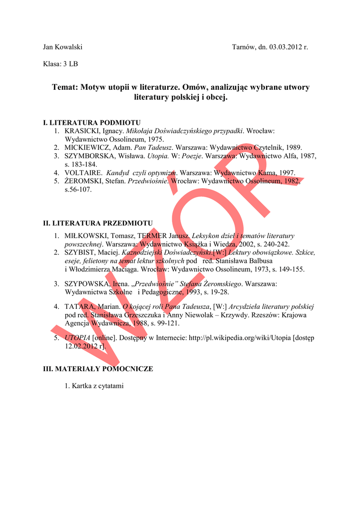 Jan Kowalski Tarnów, dn. 03.03.2012 r. Klasa: 3 LB Temat: Motyw utopii w literaturze. Omów, analizując wybrane utwory literatury polskiej i obcej. I. LITERATURA PODMIOTU 1. KRASICKI, Ignacy. Mikołaja Doświadczyńskiego przypadki. Wrocław: Wydawnictwo Ossolineum, 1975. 2. MICKIEWICZ, Adam. Pan Tadeusz. Warszawa: Wydawnictwo Czytelnik, 1989. 3. SZYMBORSKA, Wisława. Utopia. W: Poezje. Warszawa: Wydawnictwo Alfa, 1987, s. 183-184. 4. VOLTAIRE. Kandyd czyli optymizm. Warszawa: Wydawnictwo Kama, 1997. 5. ŻEROMSKI, Stefan. Przedwiośnie. Wrocław: Wydawnictwo Ossolineum, 1982, s.56-107. II. LITERATURA PRZEDMIOTU 1. MIŁKOWSKI, Tomasz, TERMER Janusz. Leksykon dzieł i tematów literatury powszechnej. Warszawa: Wydawnictwo Książka i Wiedza, 2002, s. 240-242. 2. SZYBIST, Maciej. Kaznodziejski Doświadczyński.[W:] Lektury obowiązkowe. Szkice, eseje, felietony na temat lektur szkolnych pod red. Stanisława Balbusa i Włodzimierza Maciąga. Wrocław: Wydawnictwo Ossolineum, 1973, s. 149-155. 3. SZYPOWSKA, Irena. „Przedwiośnie” Stefana Żeromskiego. Warszawa: Wydawnictwa Szkolne i Pedagogiczne, 1993, s. 19-28. 4. TATARA, Marian. O kojącej roli Pana Tadeusza, [W:] Arcydzieła literatury polskiej pod red. Stanisława Grzeszczuka i Anny Niewolak – Krzywdy. Rzeszów: Krajowa Agencja Wydawnicza, 1988, s. 99-121. 5. UTOPIA [online]. Dostępny w Internecie: http://pl.wikipedia.org/wiki/Utopia [dostęp 12.02.2012 r]. III. MATERIAŁY POMOCNICZE 1. Kartka z cytatami