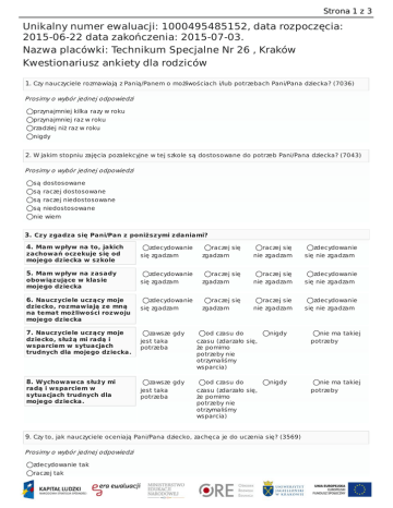 Strona 1 z 3 Unikalny numer ewaluacji: 1000495485152, data rozpoczęcia: 2015-06-22 data zakończenia: 2015-07-03. Nazwa placówki: Technikum Specjalne Nr 26 , Kraków Kwestionariusz ankiety dla rodziców 1. Czy nauczyciele rozmawiają z Panią/Panem o możliwościach i/lub potrzebach Pani/Pana dziecka? (7036) Prosimy o wybór jednej odpowiedzi przynajmniej kilka razy w roku przynajmniej raz w roku rzadziej niż raz w roku nigdy 2. W jakim stopniu zajęcia pozalekcyjne w tej szkole są dostosowane do potrzeb Pani/Pana dziecka? (7043) Prosimy o wybór jednej odpowiedzi są dostosowane są raczej dostosowane są raczej niedostosowane są niedostosowane nie wiem 3. Czy zgadza się Pani/Pan z poniższymi zdaniami? 4. Mam wpływ na to, jakich zdecydowanie się zgadzam raczej się zgadzam raczej się nie zgadzam zdecydowanie się nie zgadzam 5. Mam wpływ na zasady zdecydowanie się zgadzam raczej się zgadzam raczej się nie zgadzam zdecydowanie się nie zgadzam 6. Nauczyciele uczący moje zdecydowanie się zgadzam raczej się zgadzam raczej sie nie zgadzam zdecydowanie się nie zgadzam 7. Nauczyciele uczący moje zawsze gdy jest taka potrzeba od czasu do czasu (zdarzało się, że pomimo potrzeby nie otrzymaliśmy wsparcia) nigdy nie ma takiej potrzeby 8. Wychowawca służy mi zawsze gdy jest taka potrzeba od czasu do czasu (zdarzało się, że pomimo potrzeby nie otrzymaliśmy wsparcia) nigdy nie ma takiej potrzeby zachowań oczekuje się od mojego dziecka w szkole obowiązujące w klasie mojego dziecka dziecko, rozmawiają ze mną na temat możliwości rozwoju mojego dziecka dziecko, służą mi radą i wsparciem w sytuacjach trudnych dla mojego dziecka. radą i wsparciem w sytuacjach trudnych dla mojego dziecka. 9. Czy to, jak nauczyciele oceniają Pani/Pana dziecko, zachęca je do uczenia się? (3569) Prosimy o wybór jednej odpowiedzi zdecydowanie tak raczej tak Strona 2 z 3 raczej nie zdecydowanie nie 10. Do jakiej części nauczycieli Pani/Pana dziecka pasują poniższe opisy? 11. Nauczyciele chwalą moje do wszystkich do większości do około połowy do do mniej niż żadnego połowy trudno powiedzieć 12. Nauczyciele wierzą w do wszystkich do większości do około połowy do do mniej niż żadnego połowy trudno powiedzieć 13. Nauczyciele dbają o do wszystkich do większości do około połowy do do mniej niż żadnego połowy trudno powiedzieć 14. Nauczyciele szanują moje do wszystkich do większości do około połowy do do mniej niż żadnego połowy trudno powiedzieć 15. Nauczyciele traktują do wszystkich do większości do około połowy do do mniej niż żadnego połowy trudno powiedzieć dziecko częściej niż krytykują. możliwości mojego dziecka. dobre relacje między moim dzieckiem a innymi uczniami. dziecko. wszystkich uczniów równie dobrze. 16. Czy zgadza się Pani/Pan z poniższym zdaniem? 17. Moje dziecko chętnie raczej tak raczej nie zdecydowanie trudno nie powiedzieć chodzi do szkoły. zdecydowanie tak 18. Mam możliwość zdecydowanie tak raczej tak raczej nie zdecydowanie nie 19. Wiem, w jaki sposób zdecydowanie tak raczej tak raczej nie zdecydowanie nie współdecydowania o ważnych sprawach szkolnych? mogę się zaangażować w pracę szkoły. 20. Czy Rada Rodziców przekazuje Pani/Panu informacje na temat decyzji podejmowanych z udziałem rodziców? (6383) Prosimy o wybór jednej odpowiedzi tak, jestem informowana/y na bieżąco tak, jestem informowana/y, ale sporadycznie nie, nie otrzymuję takich informacji 21. Czy w tym lub poprzednim roku szkolnym współuczestniczył/a Pan/i w podejmowaniu decyzji dotyczących życia szkoły? (8957) Prosimy o wybór jednej odpowiedzi tak nie 22. Czy w tym lub poprzednim roku szkolnym zgłaszała/ł Pani/Pan propozycje działań, które dotyczyły uczniów i szkoły? (9497) Strona 3 z 3 Prosimy o wybór jednej odpowiedzi tak nie 23. [jeśli tak] Czy któreś z tych propozycji zostały zrealizowane? (8962) Prosimy o wybór jednej odpowiedzi tak (proszę wymienić zrealizowane propozycje) nie
