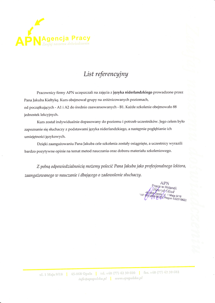 List referencyjny Pracownicy firmy APN uczęszcza|i na zajęcia z języka niderlandzkiego prowadzone przez Pana Jakuba Kiełtykę. Kurs obejmował grupy na zróżnicowanych poziomacĘ od początkujących - At i A2 do średniozaawansowanych - 81. Każde szkolenie obejmowało 88 jednostek lekcyjnych. Kurs został indywidualnie dopasowany do poziomu i potrzeb uczestników. Jego celem było zapoznanie się słuchaczy z podstawami języka niderlandzkiego, a następnie pogłębianie ich umiejętności językowych. Dzięki zaangażowaniu Pana Jakuba cele szkolenia zostaĘ osiągnięte, a uczestnicy wyrazili batdzo pozytywne opinie na temat metod nauczania oraz doboru materiału szkoleniowego. Z pełną odpowiedzialnościq możemy polecić Pana |akuba jako profesjonalne4l lektora, zaąnyażOwane4o w nąucząnie i dbĘącegl 0 zadolaolenie słuchaczy. ,,. , ",l. ],,..,, . .: