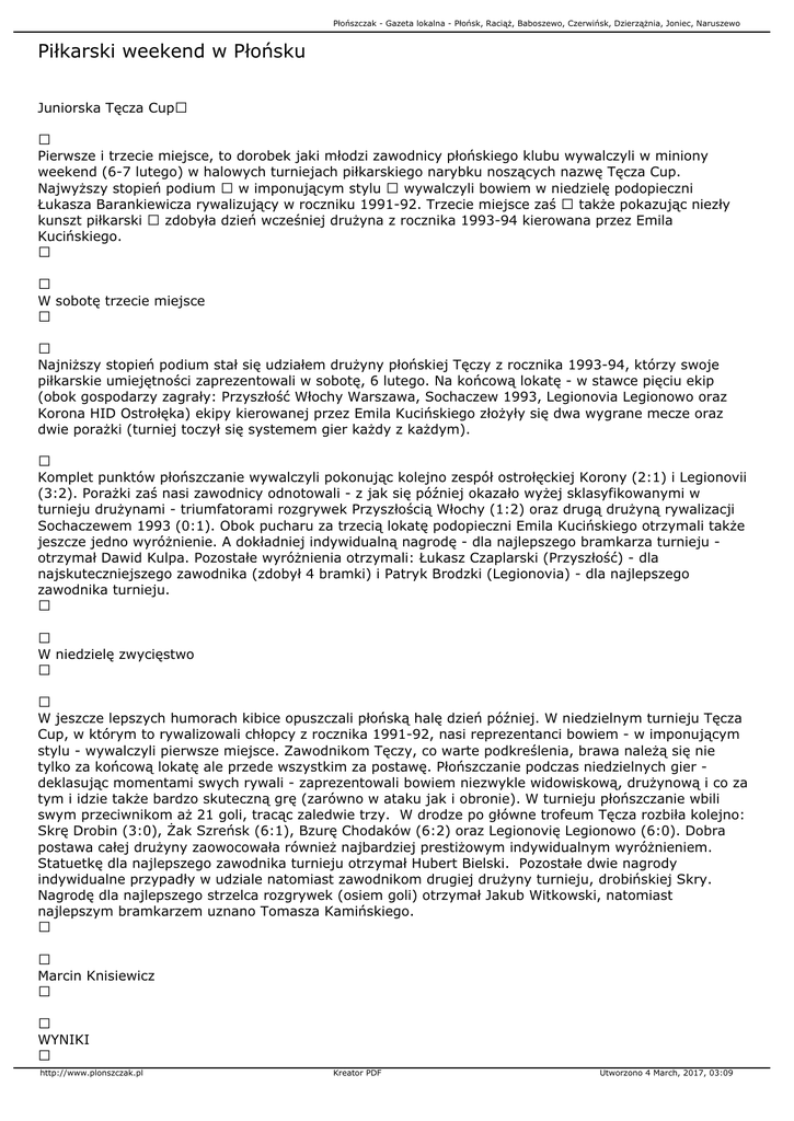 Płońszczak - Gazeta lokalna - Płońsk, Raciąż, Baboszewo, Czerwińsk, Dzierzążnia, Joniec, Naruszewo Piłkarski weekend w Płońsku Juniorska Tęcza Cup Pierwsze i trzecie miejsce, to dorobek jaki młodzi zawodnicy płońskiego klubu wywalczyli w miniony weekend (6-7 lutego) w halowych turniejach piłkarskiego narybku noszących nazwę Tęcza Cup. Najwyższy stopień podium w imponującym stylu wywalczyli bowiem w niedzielę podopieczni Łukasza Barankiewicza rywalizujący w roczniku 1991-92. Trzecie miejsce zaś także pokazując niezły kunszt piłkarski zdobyła dzień wcześniej drużyna z rocznika 1993-94 kierowana przez Emila Kucińskiego. W sobotę trzecie miejsce Najniższy stopień podium stał się udziałem drużyny płońskiej Tęczy z rocznika 1993-94, którzy swoje piłkarskie umiejętności zaprezentowali w sobotę, 6 lutego. Na końcową lokatę - w stawce pięciu ekip (obok gospodarzy zagrały: Przyszłość Włochy Warszawa, Sochaczew 1993, Legionovia Legionowo oraz Korona HID Ostrołęka) ekipy kierowanej przez Emila Kucińskiego złożyły się dwa wygrane mecze oraz dwie porażki (turniej toczył się systemem gier każdy z każdym). Komplet punktów płońszczanie wywalczyli pokonując kolejno zespół ostrołęckiej Korony (2:1) i Legionovii (3:2). Porażki zaś nasi zawodnicy odnotowali - z jak się później okazało wyżej sklasyfikowanymi w turnieju drużynami - triumfatorami rozgrywek Przyszłością Włochy (1:2) oraz drugą drużyną rywalizacji Sochaczewem 1993 (0:1). Obok pucharu za trzecią lokatę podopieczni Emila Kucińskiego otrzymali także jeszcze jedno wyróżnienie. A dokładniej indywidualną nagrodę - dla najlepszego bramkarza turnieju otrzymał Dawid Kulpa. Pozostałe wyróżnienia otrzymali: Łukasz Czaplarski (Przyszłość) - dla najskuteczniejszego zawodnika (zdobył 4 bramki) i Patryk Brodzki (Legionovia) - dla najlepszego zawodnika turnieju. W niedzielę zwycięstwo W jeszcze lepszych humorach kibice opuszczali płońską halę dzień później. W niedzielnym turnieju Tęcza Cup, w którym to rywalizowali chłopcy z rocznika 1991-92, nasi reprezentanci bowiem - w imponującym stylu - wywalczyli pierwsze miejsce. Zawodnikom Tęczy, co warte podkreślenia, brawa należą się nie tylko za końcową lokatę ale przede wszystkim za postawę. Płońszczanie podczas niedzielnych gier deklasując momentami swych rywali - zaprezentowali bowiem niezwykle widowiskową, drużynową i co za tym i idzie także bardzo skuteczną grę (zarówno w ataku jak i obronie). W turnieju płońszczanie wbili swym przeciwnikom aż 21 goli, tracąc zaledwie trzy. W drodze po główne trofeum Tęcza rozbiła kolejno: Skrę Drobin (3:0), Żak Szreńsk (6:1), Bzurę Chodaków (6:2) oraz Legionovię Legionowo (6:0). Dobra postawa całej drużyny zaowocowała również najbardziej prestiżowym indywidualnym wyróżnieniem. Statuetkę dla najlepszego zawodnika turnieju otrzymał Hubert Bielski. Pozostałe dwie nagrody indywidualne przypadły w udziale natomiast zawodnikom drugiej drużyny turnieju, drobińskiej Skry. Nagrodę dla najlepszego strzelca rozgrywek (osiem goli) otrzymał Jakub Witkowski, natomiast najlepszym bramkarzem uznano Tomasza Kamińskiego. Marcin Knisiewicz WYNIKI http://www.plonszczak.pl Kreator PDF Utworzono 4 March, 2017, 03:09 Płońszczak - Gazeta lokalna - Płońsk, Raciąż, Baboszewo, Czerwińsk, Dzierzążnia, Joniec, Naruszewo Sobota, 6.02. - rocznik 1993-94 * Tęcza 34 Płońsk - Sochaczew 1993 0:1 * Legionovia Legionowo - Przyszłość Włochy 2:3 * Korona HID Ostrołęka - Tęcza 34 Płońsk 1:2 * Sochaczew 1993 - Przyszłość Włochy 2:3 * Legionovia Legionowo Tęcza 34 Płońsk 2:3 * Przyszłość Włochy - Korona HID Ostrołęka 7:2 * Legionovia Legionowo Sochaczew 1993 1:4 * Korona HID Ostrołęka - Legionovia Legionowo 2:3 * Tęcza 34 Płońsk - Przyszłość Włochy 1:2 * Sochaczew 1993 - Korona HID Ostrołęka 2:3. Klasyfikacja końcowa: 1. Przyszłość Włochy 12 pkt. (15:7); 2. Sochaczew 1993 - 6 pkt. (9:7); 3. Tęcza 34 Płońsk - 6 pkt. (6:6); 4. Legionovia Legionowo - 3 pkt. (8:12); 5. Korona HID Ostrołęka - 3 pkt. (8:14). Niedziela, 7.02. - rocznik 1991-92 * Tęcza 34 Płońsk - Skra Drobin 3:0 * Bzura Chodaków - Legionovia Legionowo 3:1 * Tęcza 34 Płońsk Żak Szreńsk 6:1 * Skra Drobin - Bzura Chodaków 4:2 * Żak Szreńsk - Legionovia Legionowo 2:1 * Bzura Chodaków - Tęcza 34 Płońsk 2:6 * Skra Drobin - Żak Szreńsk 2:1 * Legionovia Legionowo - Tęcza 34 Płońsk 0:6 * Bzura Chodaków - Żak Szreńsk 8:1 * Legionovia Legionowo - Skra Drobin 2:8. Klasyfikacja końcowa: 1. Tęcza 34 Płońsk - 12 pkt. (21:3); 2. Skra Drobin - 9 pkt. (14:8); 3. Bzura Chodaków - 6 pkt. (15:12); 4. Żak Szreńsk - 3 pkt. (5:17); 5. Legionovia Legionowo - 0 pkt. (4:19) foto: Marcin Knisiewicz Tęcza 34 Płońsk (rocznik 1991-92). W górnym rzędzie, od lewej: trener Łukasz Barankiewicz, Mateusz Kozłowski, Marcin Stańczak, Maciej Turkowski, Damian Gocajna, Mateusz Pałka, Hubert Bielski, Paweł Kamiński. W dolnym rzędzie, od lewej: Michał Kłodowski, Łukasz Żelechowski, Daniel Skolimowski, Mateusz Dzięgielewski, Adrian Więcław, Bartosz Makowski. Tęcza 34 Płońsk (rocznik 1993-94). W górnym rzędzie, od lewej: Robert Cabanowski, Grzegorz Antonowski, Adrian Trukawka, Kamil Lewandowski, Dawid Kulpa, Patryk Wiśniewski, Kamil Pergoł, Sebastian Jadczak, trener Emil Kuciński. W dolnym rzędzie, od lewej: Mateusz Rutkowski, Mateusz Patyk, Ernest Nużyński, Marek Wronka, Konrad Osiński, Łukasz Federczyk. Najlepszy zawodnik turnieju rocznika 1991-92 Hubert Bielski i najlepszy bramkarz rywalizacji rocznika 1993-94 Dawid Kulpa. Więcej zdjęć w Galerii http://www.plonszczak.pl Kreator PDF Utworzono 4 March, 2017, 03:09