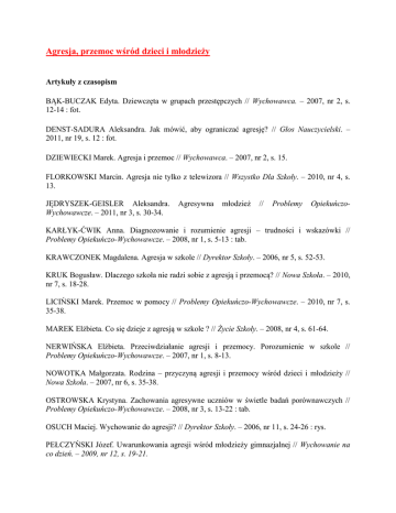 Agresja, przemoc wśród dzieci i młodzieży Artykuły z czasopism BĄK-BUCZAK Edyta. Dziewczęta w grupach przestępczych // Wychowawca. – 2007, nr 2, s. 12-14 : fot. DENST-SADURA Aleksandra. Jak mówić, aby ograniczać agresję? // Głos Nauczycielski. – 2011, nr 19, s. 12 : fot. DZIEWIECKI Marek. Agresja i przemoc // Wychowawca. – 2007, nr 2, s. 15. FLORKOWSKI Marcin. Agresja nie tylko z telewizora // Wszystko Dla Szkoły. – 2010, nr 4, s. 13. JĘDRYSZEK-GEISLER Aleksandra. Wychowawcze. – 2011, nr 3, s. 30-34. Agresywna młodzież // Problemy Opiekuńczo- KARŁYK-ĆWIK Anna. Diagnozowanie i rozumienie agresji – trudności i wskazówki // Problemy Opiekuńczo-Wychowawcze. – 2008, nr 1, s. 5-13 : tab. KRAWCZONEK Magdalena. Agresja w szkole // Dyrektor Szkoły. – 2006, nr 5, s. 52-53. KRUK Bogusław. Dlaczego szkoła nie radzi sobie z agresją i przemocą? // Nowa Szkoła. – 2010, nr 7, s. 18-28. LICIŃSKI Marek. Przemoc w pomocy // Problemy Opiekuńczo-Wychowawcze. – 2010, nr 7, s. 35-38. MAREK Elżbieta. Co się dzieje z agresją w szkole ? // Życie Szkoły. – 2008, nr 4, s. 61-64. NERWIŃSKA Elżbieta. Przeciwdziałanie agresji i przemocy. Porozumienie w szkole // Problemy Opiekuńczo-Wychowawcze. – 2007, nr 1, s. 8-13. NOWOTKA Małgorzata. Rodzina – przyczyną agresji i przemocy wśród dzieci i młodzieży // Nowa Szkoła. – 2007, nr 6, s. 35-38. OSTROWSKA Krystyna. Zachowania agresywne uczniów w świetle badań porównawczych // Problemy Opiekuńczo-Wychowawcze. – 2008, nr 3, s. 13-22 : tab. OSUCH Maciej. Wychowanie do agresji? // Dyrektor Szkoły. – 2006, nr 11, s. 24-26 : rys. PEŁCZYŃSKI Józef. Uwarunkowania agresji wśród młodzieży gimnazjalnej // Wychowanie na co dzień. – 2009, nr 12, s. 19-21. PILCZUK Bożena. Agresja wśród młodzieży // Poradnik Bibliotekarza. – 2011, nr 9, s. 3-8. RACZKOWSKA Jadwiga. O agresji, przemocy, brutalności // Problemy OpiekuńczoWychowawcze. – 2009, nr 3, s. 36-44. STYCZEŃ Jolanta. Agresja – powracający temat // Nowa Szkoła. – 2009, nr 7, s. 57-59. SZEFLER Elżbieta. Biblioterapia w przeciwdziałaniu przemocy rówieśniczej // Problemy Opiekuńczo-Wychowawcze. – 2010, nr 8, s. 35-47. SZOT-ODROBINA Edyta. Agresja dzieci i młodzieży // Wszystko Dla Szkoły. – 2008, nr 11, s. 17-20. TROJAN Elżbieta. Przemoc w szkole. Jak ją powstrzymać? // Nowa Szkoła. – 2009, nr 3, s. 5659 : il. ZAWADKA Grażyna. Horror w szkołach // Rzeczpospolita. – 2012, nr 18, s. 1, A4. Przemoc w gimnazjach i podstawówkach. Oprac. Katarzyna Kubiak