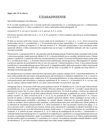 Sygn. akt. IV K 165/13 UZASADNIENIE Sąd ustalił następujący stan faktyczny: B. W. na stałe zameldowana w B. w styczniu 2008 roku zamieszkiwała w L. w mieszkaniu przy ul. (...). Właścicielem tego mieszkania był J. N., który wynajął je R. P., który z kolei jeden pokój udostępnił B. W.. (zeznania B. W. k. 121-130, k. 813-818, J. N. k. 346-347, R. P. k. 79-81) Pod koniec stycznia 2008 roku na ul. (...) w L. B. W. poznała R. J., który następnie zapoznał ją ze swoimi kolegami: K. K. (1) i S. D.. W dniu 25 stycznia 2008 roku wszyscy czworo udali się do mieszkania J. T. przy ul. (...) w L.. Drzwi otworzył im przebywający tam S. C. o pseudonimie (...). W mieszkaniu była też jego właścicielka J. T., co jakiś czas przychodziła mieszkająca w pobliżu jej znajoma U. S.. Był tam również T. N.. Wszystkie przebywające w tym mieszkaniu osoby spożywały alkohol, w który systematycznie zaopatrywano się na targu i w pobliskich melinach, tak więc co pewien czas ktoś wychodził. Wieczorem R. J. zaproponował B. W., aby przeszła z nim do drugiego pokoju. Poszli tam oboje, pozostałe osoby zostały w pierwszym pokoju i nadal spożywały alkohol. B. W. w ubraniu położyła się na wersalkę i przykryła kocem. Ubrany jedynie w spodnie R. J. położył się obok niej i zaczął ją dotykać po nogach. W pewnej chwili pokrzywdzona myląc imię R. J., zwróciła się do niego (...). To bardzo zdenerwowało oskarżonego, stał się agresywny. Siłą ściągnął B. W. spodnie, a ponieważ opierała się, powiedział do niej „ty ruro nie szarp się” i uderzył ją pięścią w twarz. Z nosa pokrzywdzonej pociekła krew i zaprzestała dalszego oporu. Wówczas R. J. ściągnął jej majtki, zdjął swoje spodnie i odbył z nią stosunek seksualny. Potem położył się obok niej i zagroził, że jak się ruszy, to ją pobije. B. W. spędziła noc leżąc obok R. J., obawiała się bowiem jego gróźb. Na zabezpieczonym na miejscu zdarzenia kocu ujawniono płyn nasienny należący do R. J. (prawdopodobieństwo, że inna osoba posiada taki sam zestaw cech genetycznych, jaki stwierdzono w badanym zaplamieniu i u R. J. wynosi 0, (...)) oraz innej nieustalonej osoby, a także krew B. W. (prawdopodobieństwo, że inna osoba posiada taki sam zestaw cech genetycznych, jaki stwierdzono w badanym zaplamieniu B. W. wynosi 0, (...)) (zeznania B. W. k. 121-130, 138, 154-157, opinia z zakresu badań DNA (k. 371-402), wykaz dowodów rzeczowych (k. 353-356). Następnego dnia tj. 26 stycznia 2008 roku przed godziną 6 rano B. W. obudziła się. R. J. już nie spał. Pokrzywdzona powiedziała mu, że to, co jej zrobił zgłosi na Policję. Wówczas oskarżony zrzucił B. W. z wersalki i zaczął uderzać ją pięściami po twarzy tak, iż z nosa i okolicy oka zaczęła jej lecieć krew. Po chwili do pokoju, w którym się znajdowali wszedł K. K. (1) i przyłączył się do bicia pokrzywdzonej również uderzając ją pięściami po twarzy. Następnie do pokoju wszedł S. D., który zwrócił się do R. J. i K. K. (1), by przestali bić B. W.. Obaj posłuchali S. D. i wszyscy przeszli do pokoju, w którym poprzedniego dnia wspólnie spożywali alkohol. Potem znajdujące się tam osoby w różnych konfiguracjach wychodziły z mieszkania, by zakupić alkohol. Oskarżeni nie pozwalali jednak, by B. W. wyszła na zewnątrz, drzwi wejściowe były zamykane, a pokrzywdzona była przez nich pilnowana. Około godziny 8ej oskarżeni do mieszkania przyprowadzili A. F., który powiedział, że chce się przespać, bowiem jest pijany. A. F. od 24 stycznia 2008 r. przebywał poza domem. Pytany przez oskarżonych o pieniądze na alkohol stwierdził, że ma kartę bankomatową, po czym dał oskarżonym tę kartę i podał numer (...), prosząc jednocześnie, by wszystkiego nie wypłacali. A. F. położył się spać, natomiast S. C. i S. D. udali się do znajdujących się na ulicy (...) bankomatów i z rachunku bankowego należącego do A. F. o godzinie 8.19 wypłacili 50 zł, o godzinie 8.21 z innego bankomatu jeszcze 50 zł, potem z następnego bankomatu o godz. 8.33 kolejne 50 zł i o godzinie 8.53 jeszcze 20 zł. Dalsza wypłata pieniędzy nie była możliwa gdyż na rachunku A. F. pozostało 3 zł i 11 groszy. Za wypłacone pieniądze zakupili alkohol i wrócili do mieszkania J. T., po czym wszystkie przebywające tam osoby zaczęły wspólnie go pić. W pewnym momencie B. W. zwróciła się do R. J., że chce jak najszybciej opuścić to mieszkanie. Usłyszawszy to R. J. oświadczył, iż nigdzie stąd nie pójdzie, gdyż wcześniej mówiła, iż chce zawiadomić Policję, a S. D. zaczął grozić pokrzywdzonej. Następnie K. K. (1) podszedł do niej i zaczął ją bić pięściami po twarzy. Do bicia przyłączył się R. J., który również uderzał ją pięściami po twarzy. Następnie obaj ściągnęli B. W. z fotela na podłogę i dalej bili ją i wyzywali słowami wulgarnymi. W obronie B. W. stanęła J. T., prosząc oskarżonych by przestali ją bić. W wyniku pobicia B. W. miała zakrwawioną twarz, leciała jej krew z nosa. Nie mogła otworzyć jednego oka, które miała zaklejone krwią. Wszyscy ponownie przystąpili do spożywania alkoholu. W pewnym momencie K. K. (1) zaczął bić i kopać siedzącego na fotelu A. F.. Do bicia przyłączył się R. J.. Obaj wielokrotnie uderzali go pięściami po całym ciele i kopali. S. D. leżał na wersalce i przyglądał się zajściu krzycząc do bijących „dojechać go”. W mieszkaniu oprócz jego właścicielki J. T. cały czas przebywała także B. W., której oskarżeni nie pozwalali wyjść na zewnątrz. Gdy zwróciła się do oskarżonych, by przestali bić A. F. S. D. zaczął grozić jej pobiciem i zabójstwem. W tym czasie mieszkanie opuścił już S. C.. B. W. słyszała jak K. K. (1) wraz z R. J. bijąc A. F. krzyczeli do niego „ty brudasie coś ty zrobił”, bowiem A. F. zmoczył się, a oskarżeni krzyczeli, że wszystko będzie